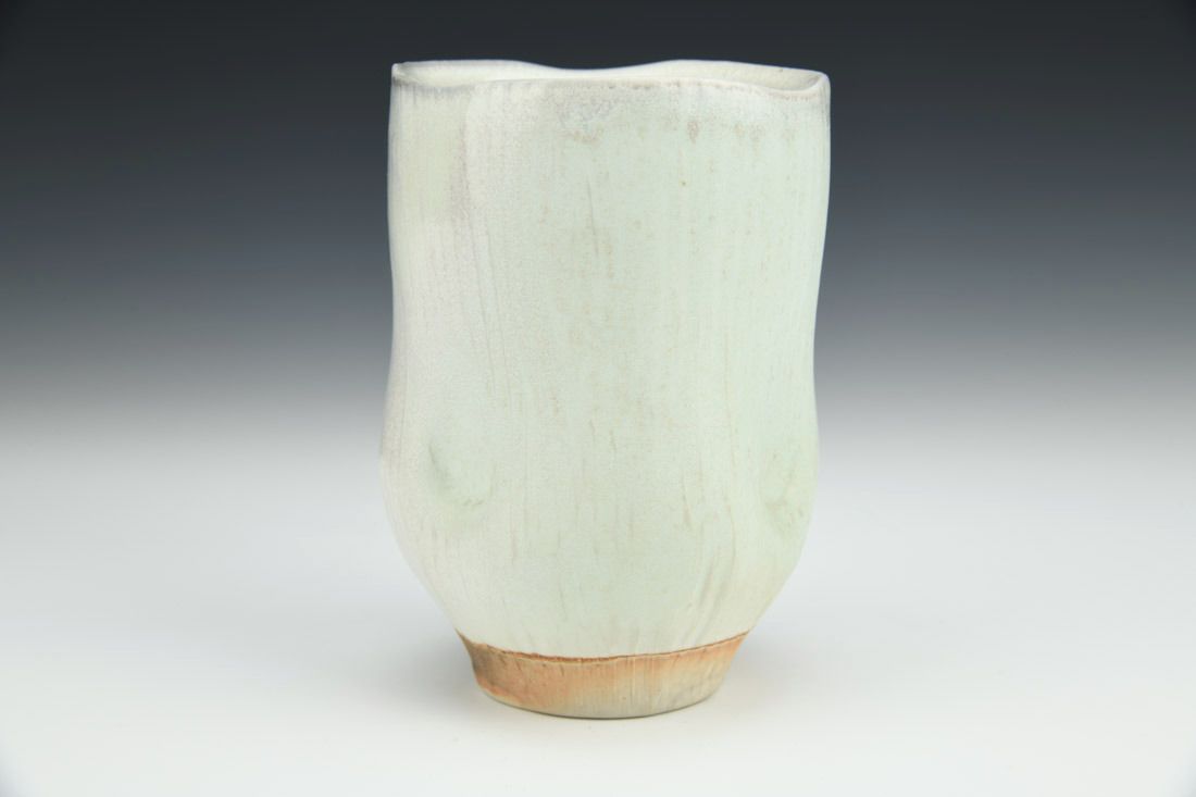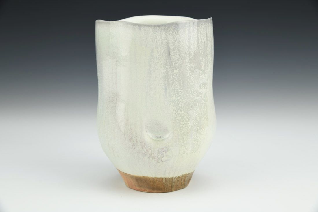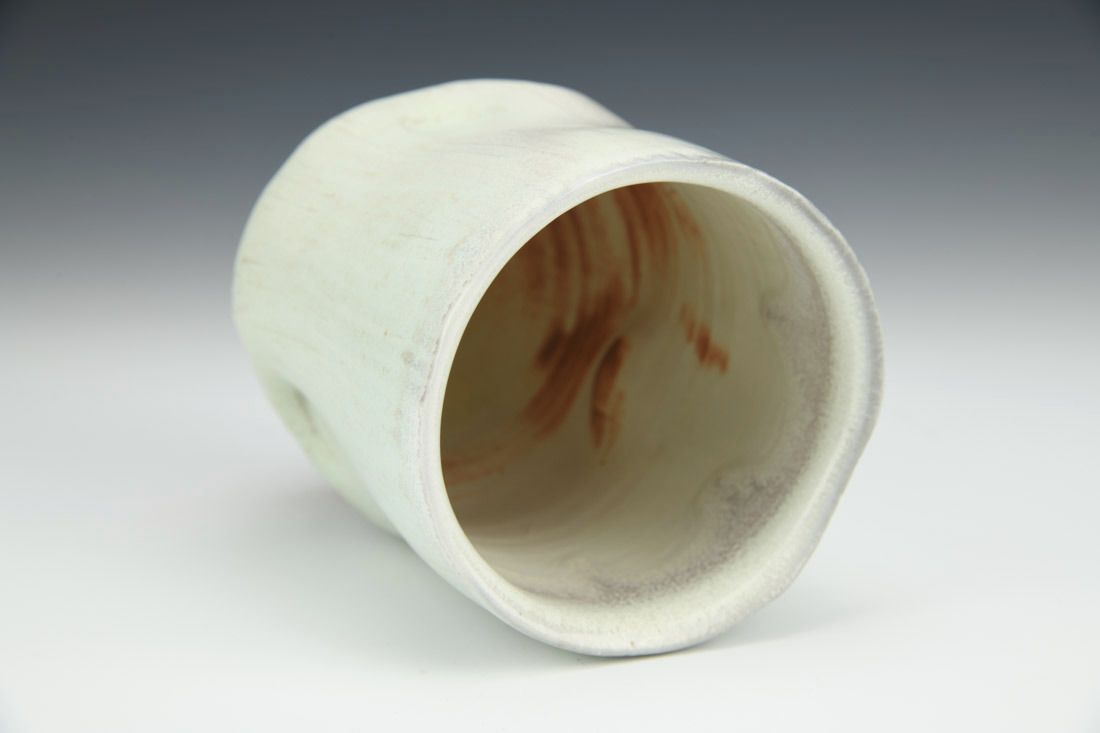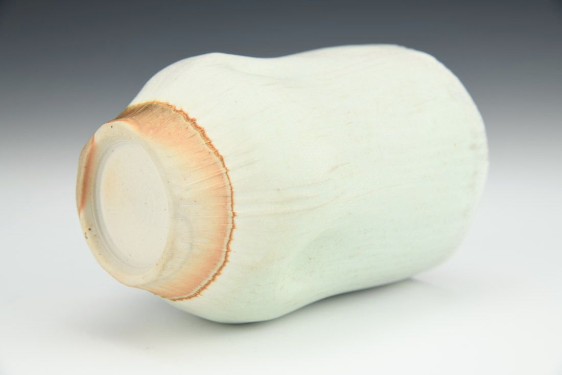 Porcelain, wheel thrown, altered and textured, glaze, woodfired in nobrigama kiln, 5 x 3.5 x 3.5 inches.