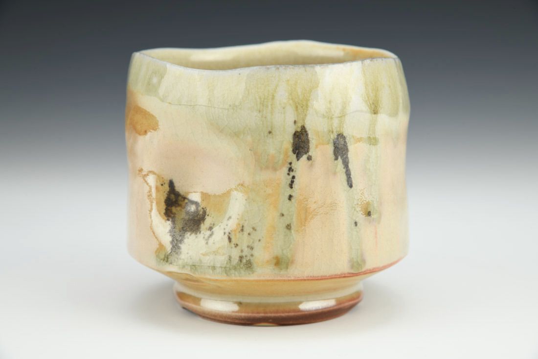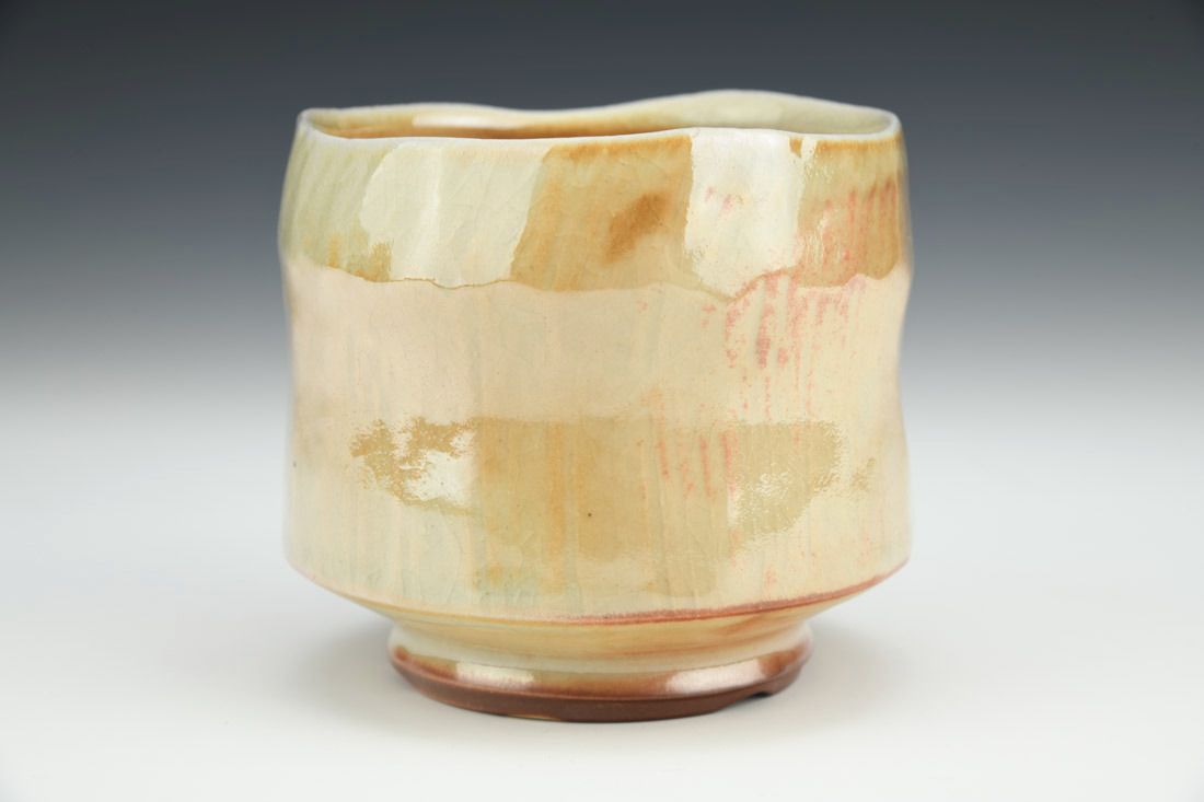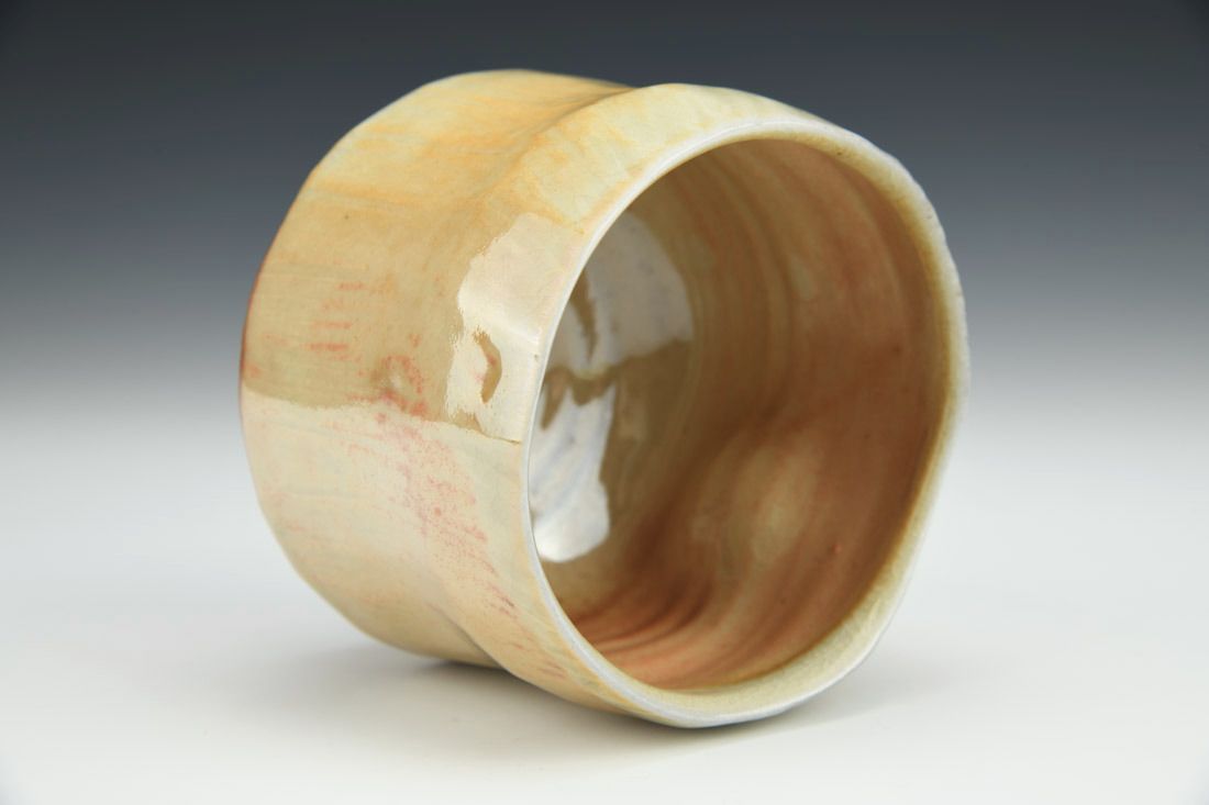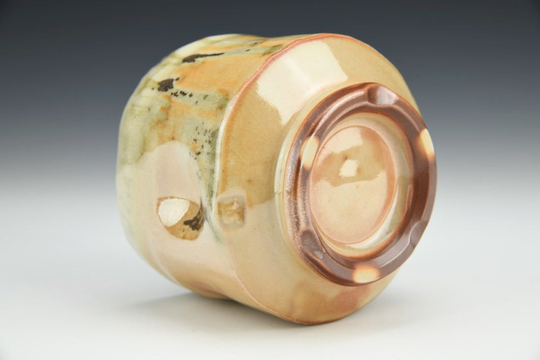 B-Clay, wheel thrown, altered and textured, glaze, woodfired in nobrigama kiln, 3.5 x 3.75 x 3.75 inches.