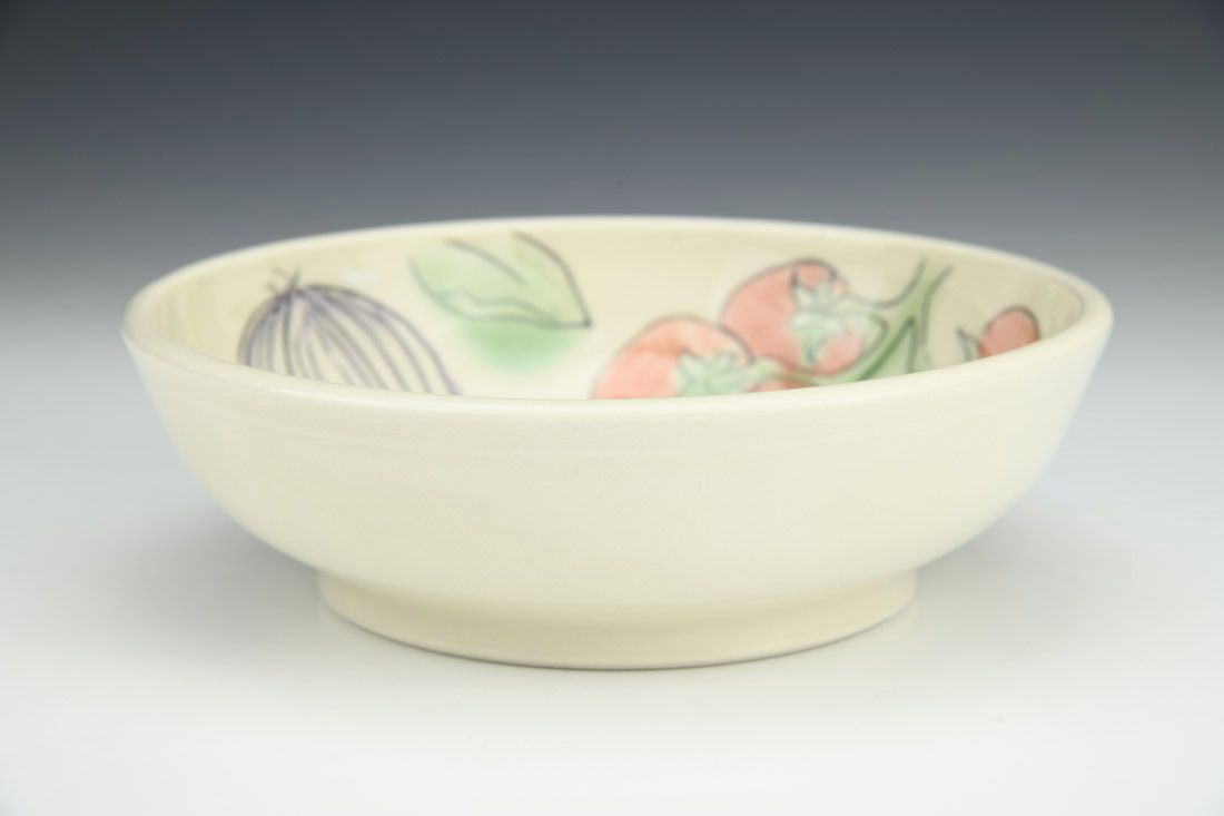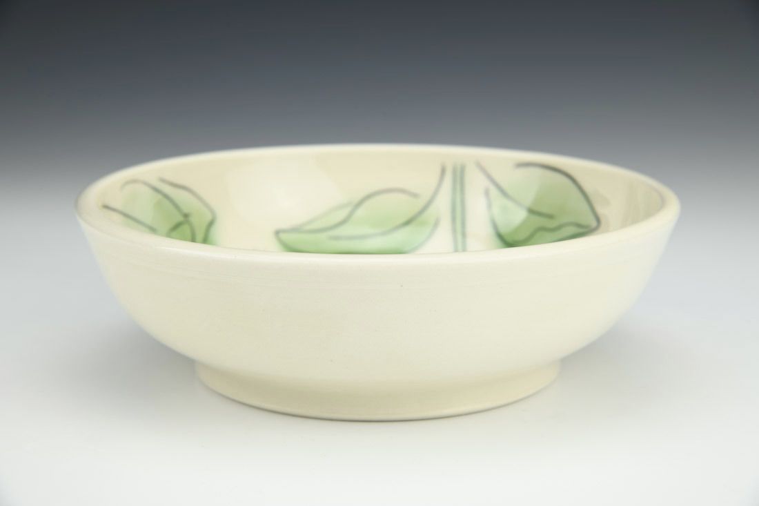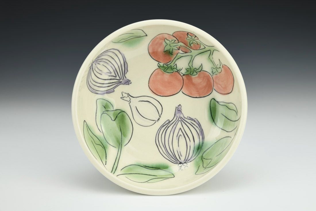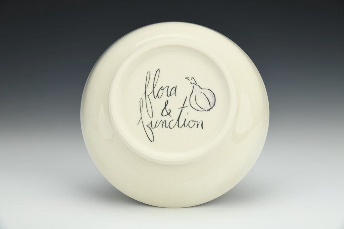 Porcelain, wheel thrown, inlay, glaze, cone 6 electric fired, 2 x 6.75 x 6.75 inches.