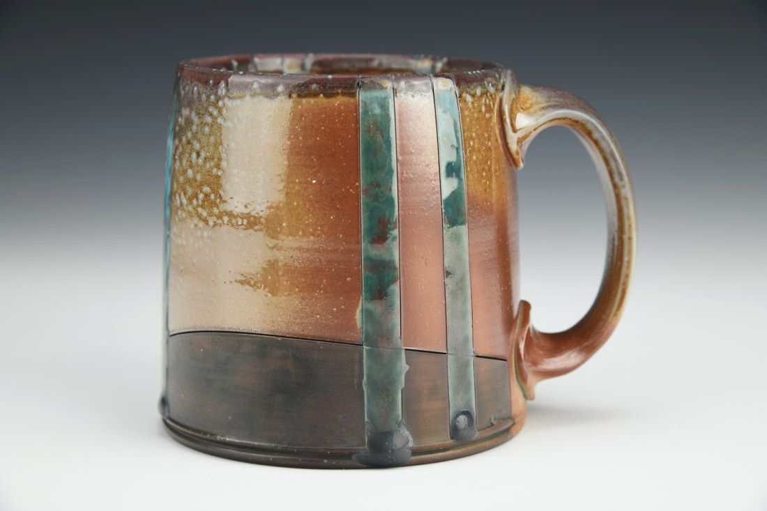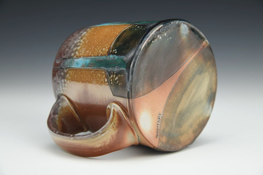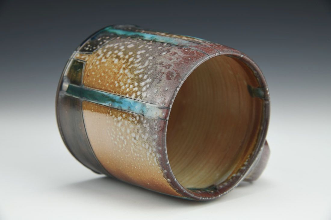 B-Mix, wheel thrown, hand carved, inlaid underglaze, terra sigillata, glaze, cone 10 soda fired, 3.75 x 4.75 x 3.5 inches.
