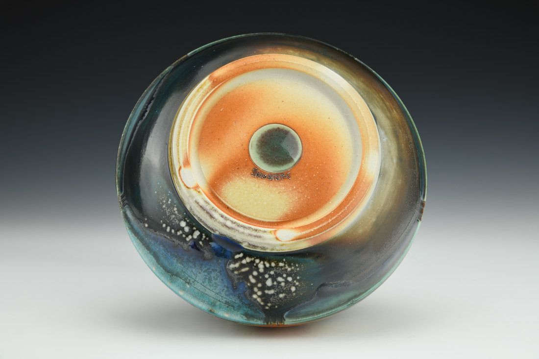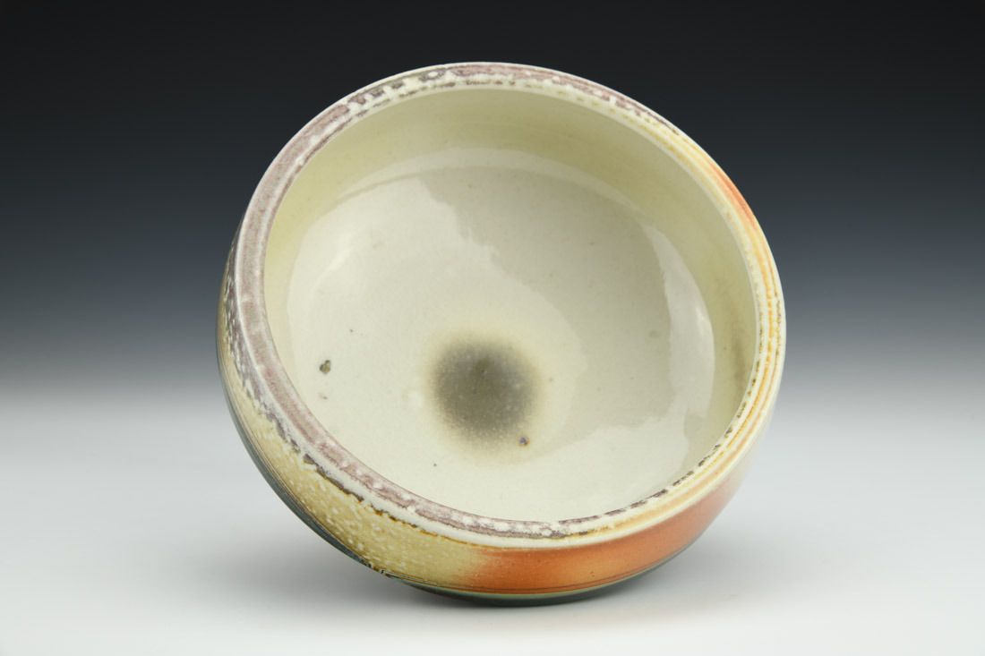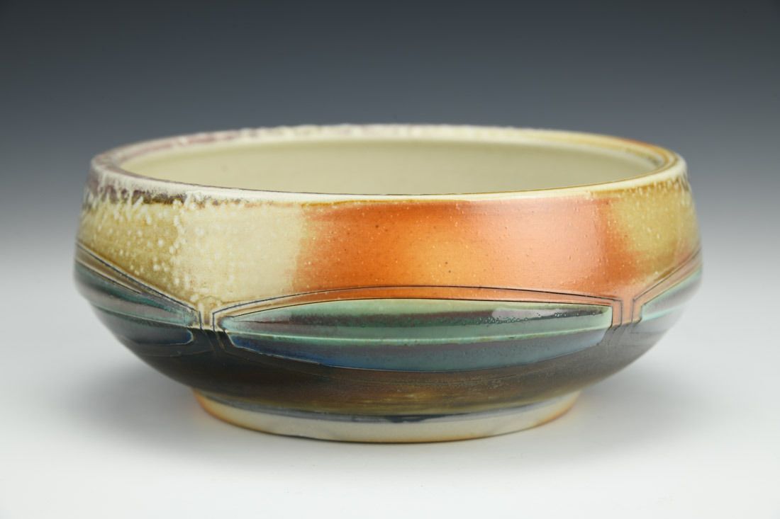 B-Mix, wheel thrown, hand carved, inlaid underglaze, terra sigillata, glaze, cone 10 soda fired, 2.5 x 6 x 6 inches.