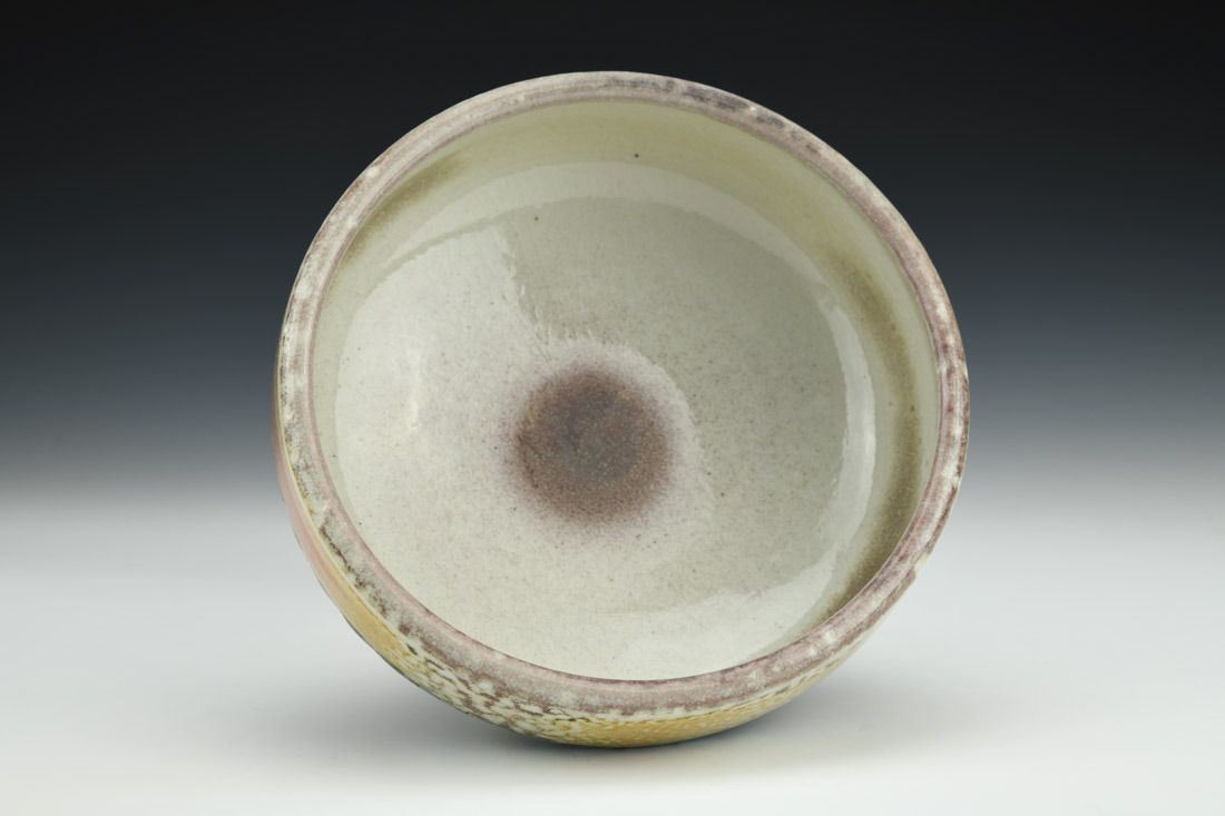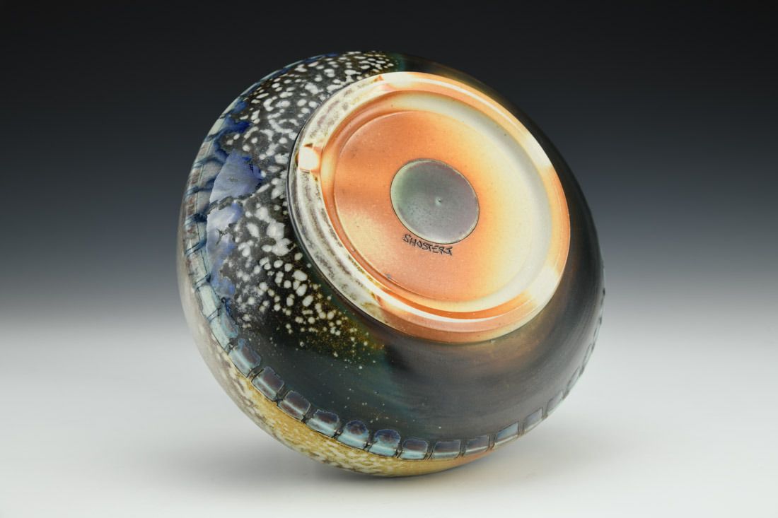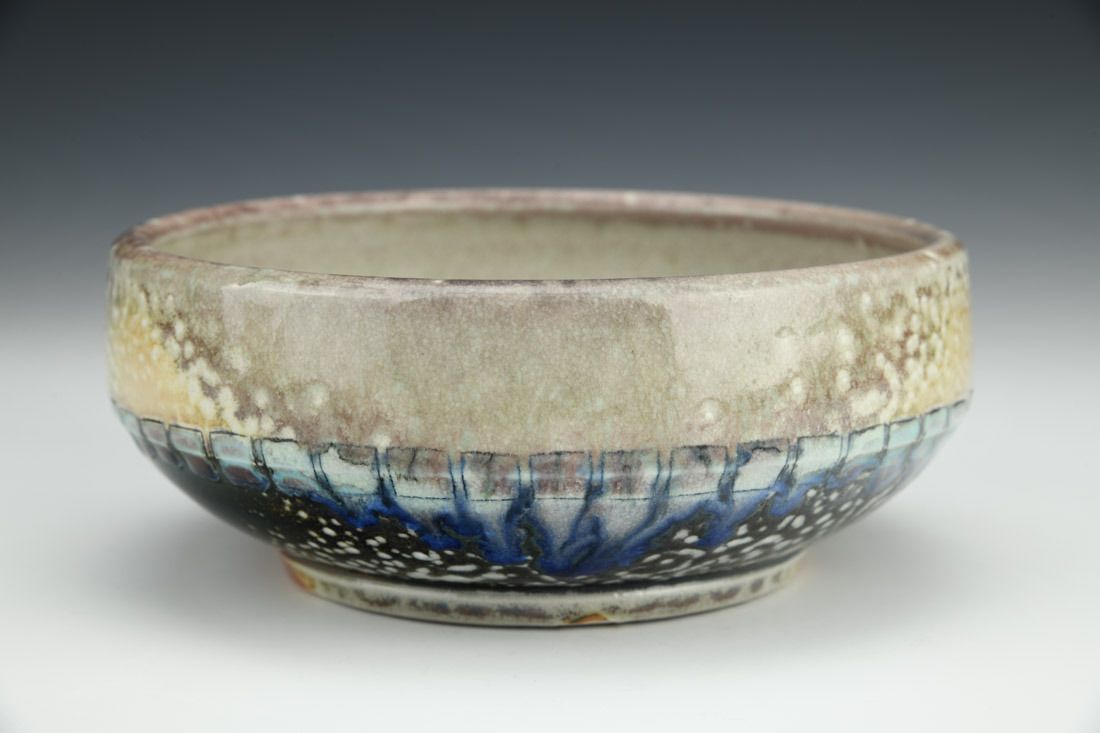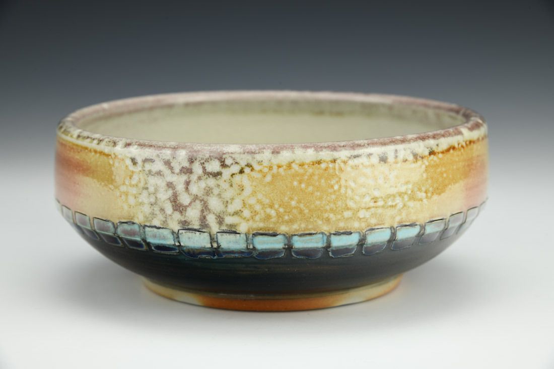 B-Mix, wheel thrown, hand carved, inlaid underglaze, terra sigillata, glaze, cone 10 soda fired, 2.5 x 6 x 6 inches.