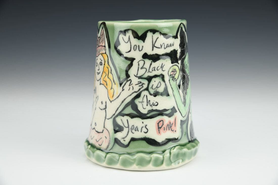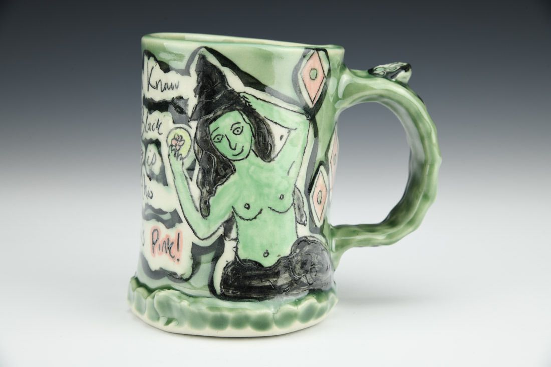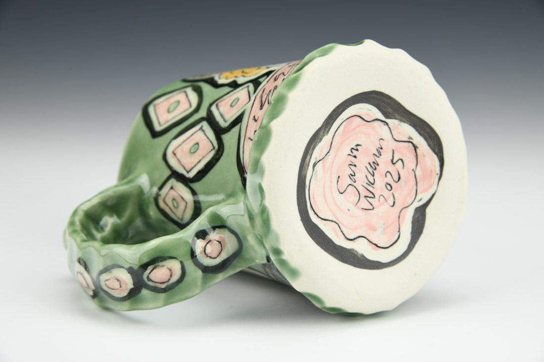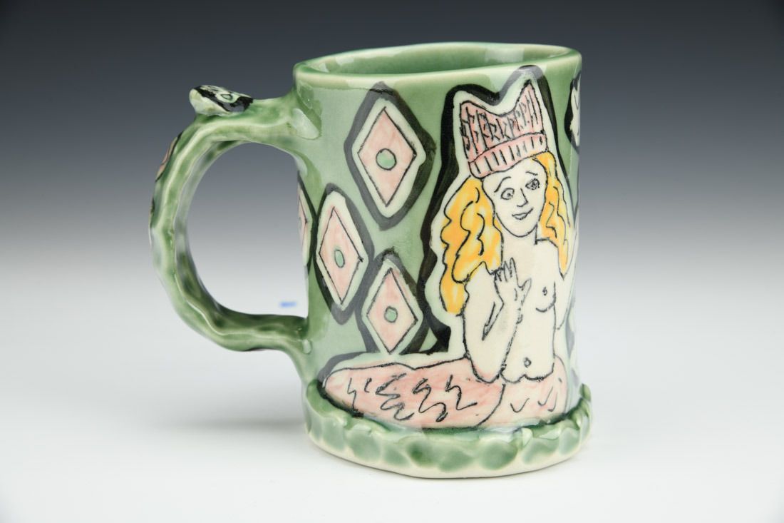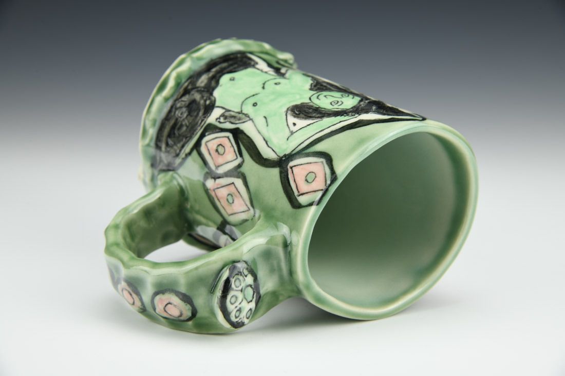 Porcelain, hand built, shellac resist, underglaze, glaze, cone 10 oxidation fired, 4.5 x 5 x 3.75 inches.