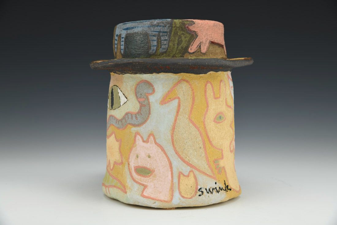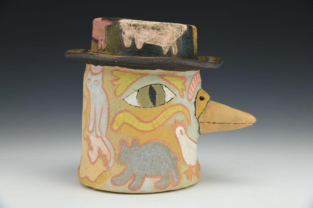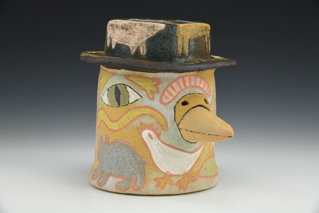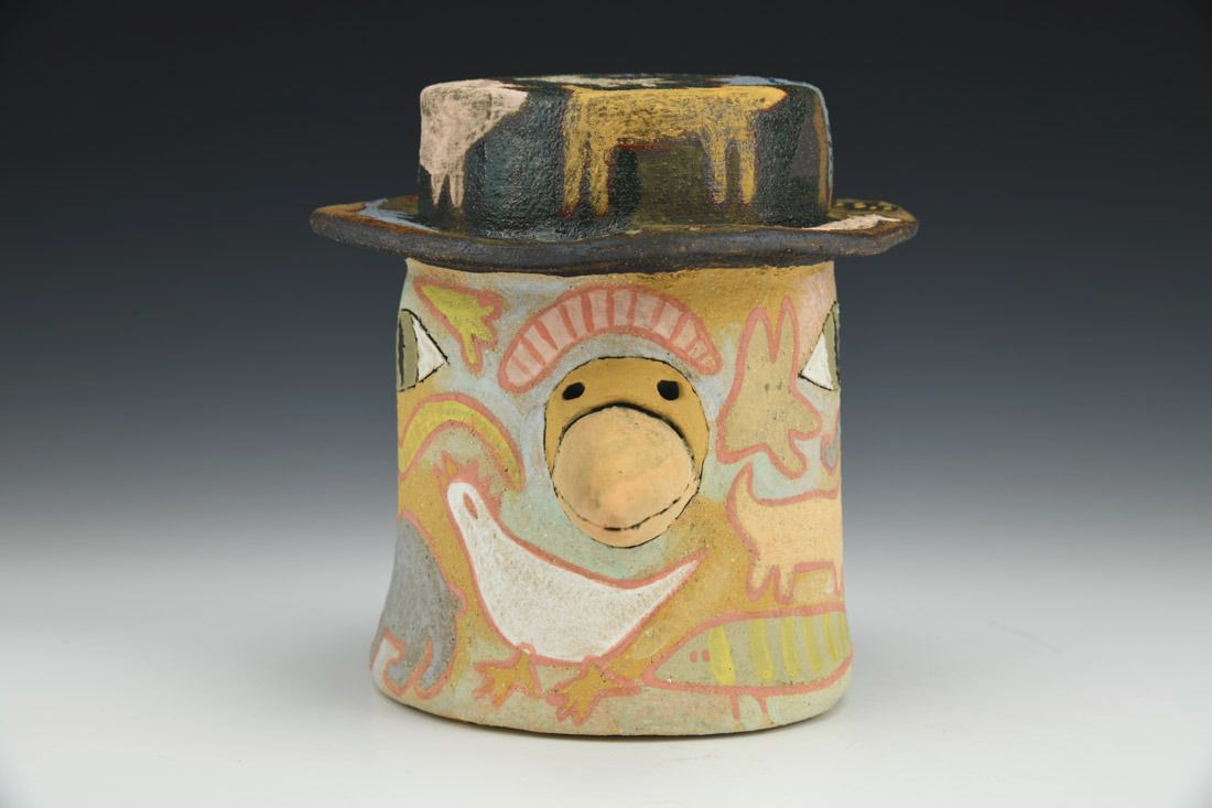 Stoneware with cork feet, hand built, slip, underglazes, cone 6 electric fired, 5.75 x 5.5 x 7 inches.