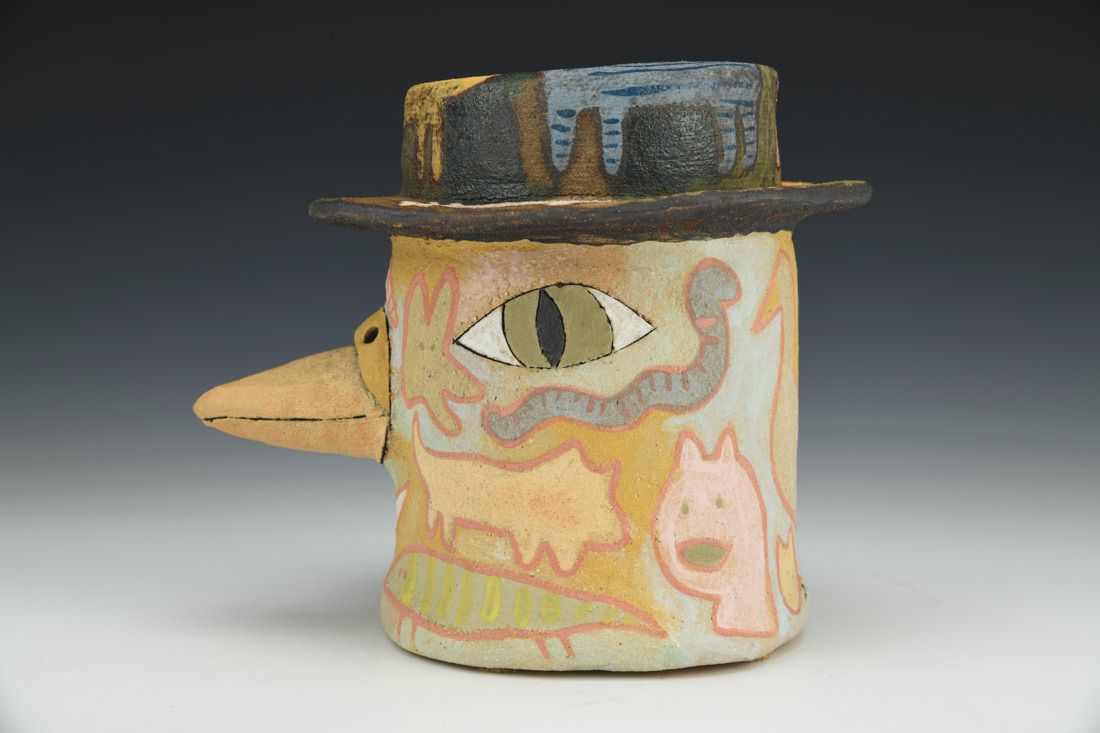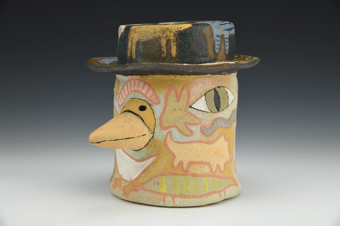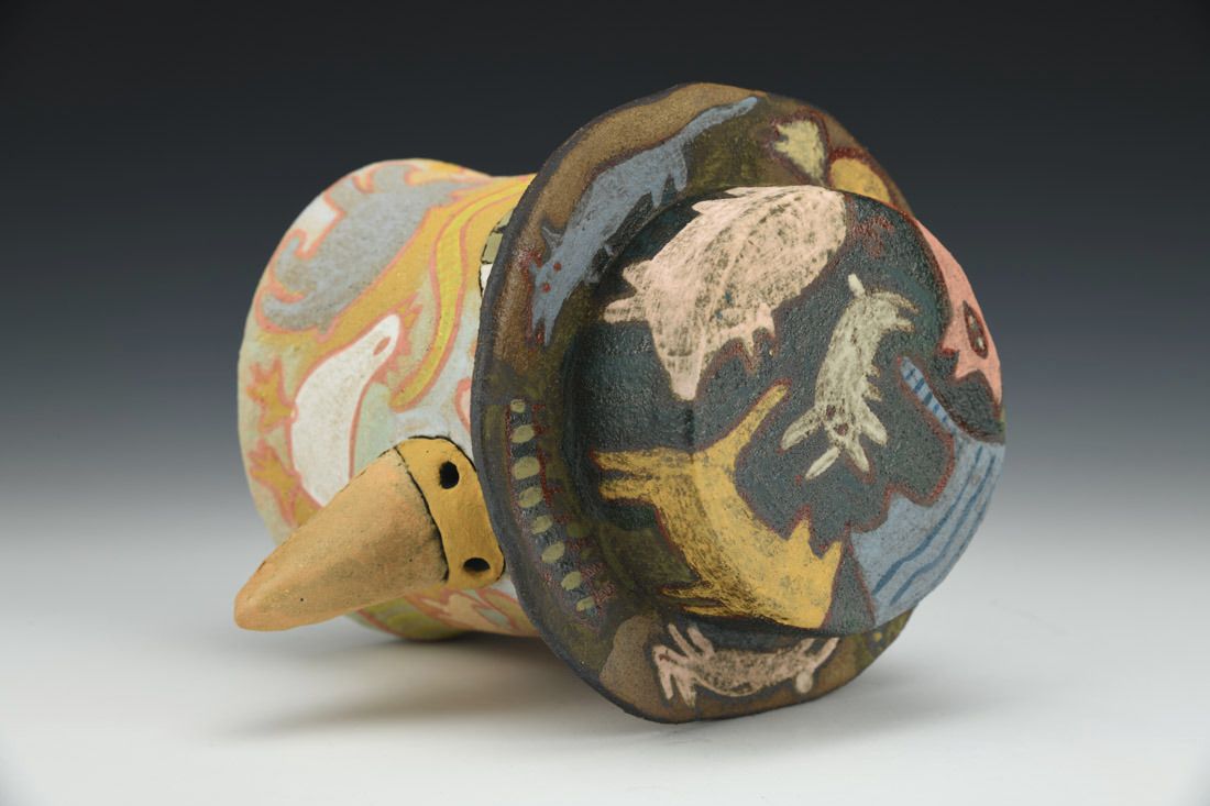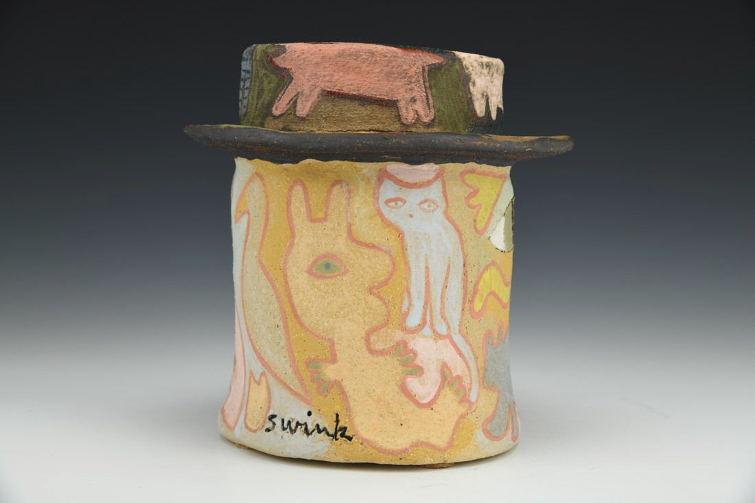 Stoneware with cork feet, hand built, slip, underglazes, cone 6 electric fired, 5.75 x 5.5 x 7 inches.