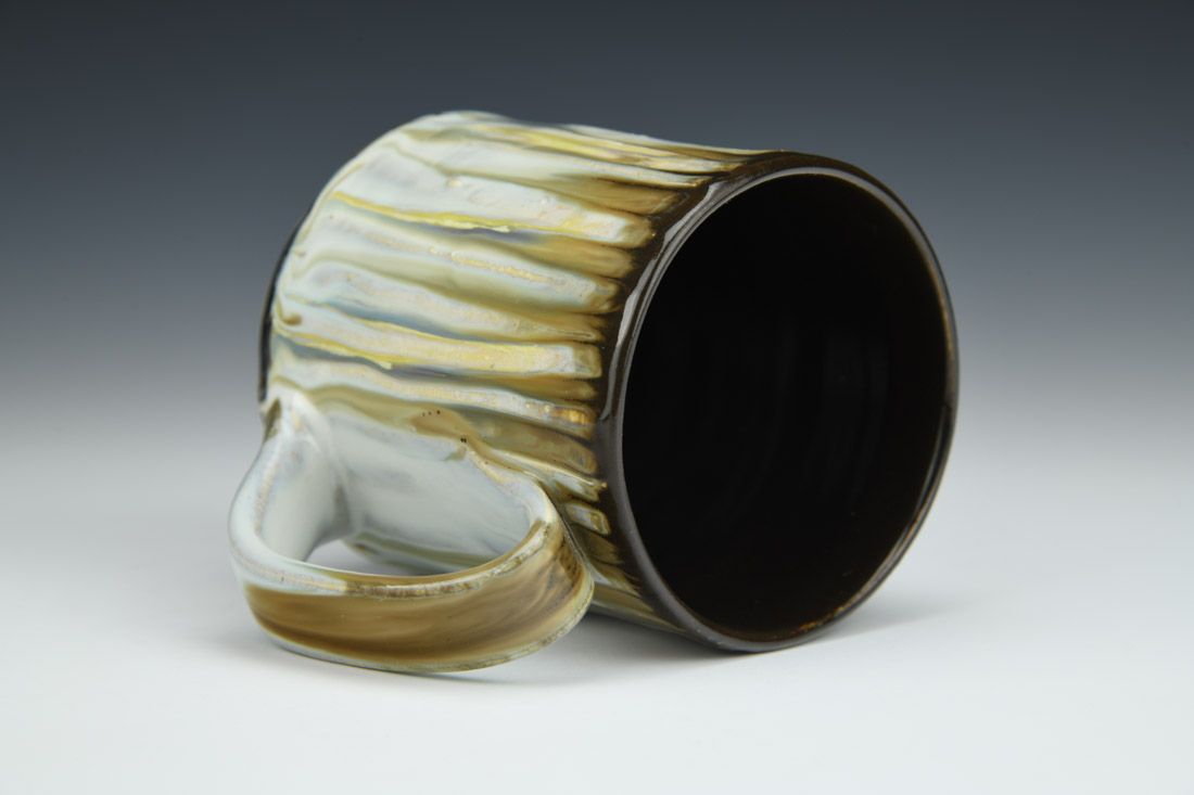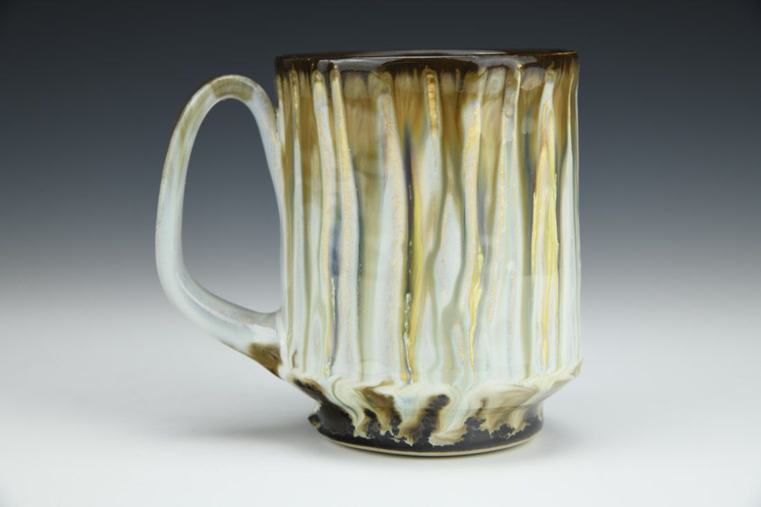 White stoneware, wheel thrown and altered, multiple glazes, cone 10 reduction fired, 3.25 x 4.25 x 3 inches.