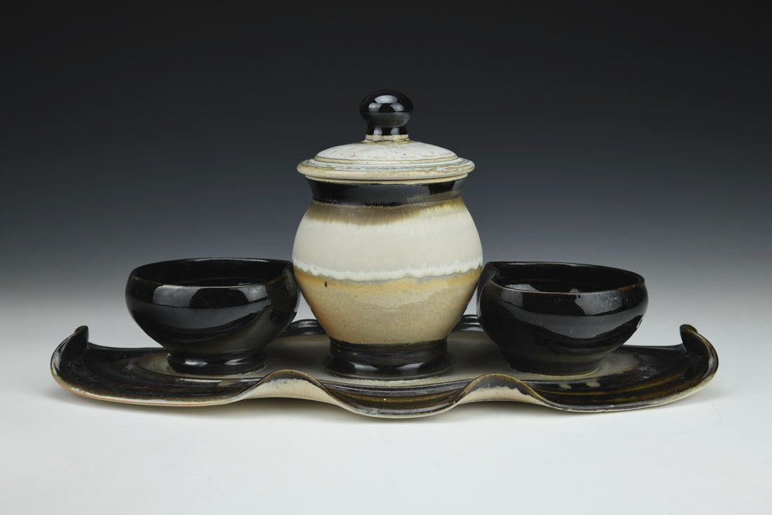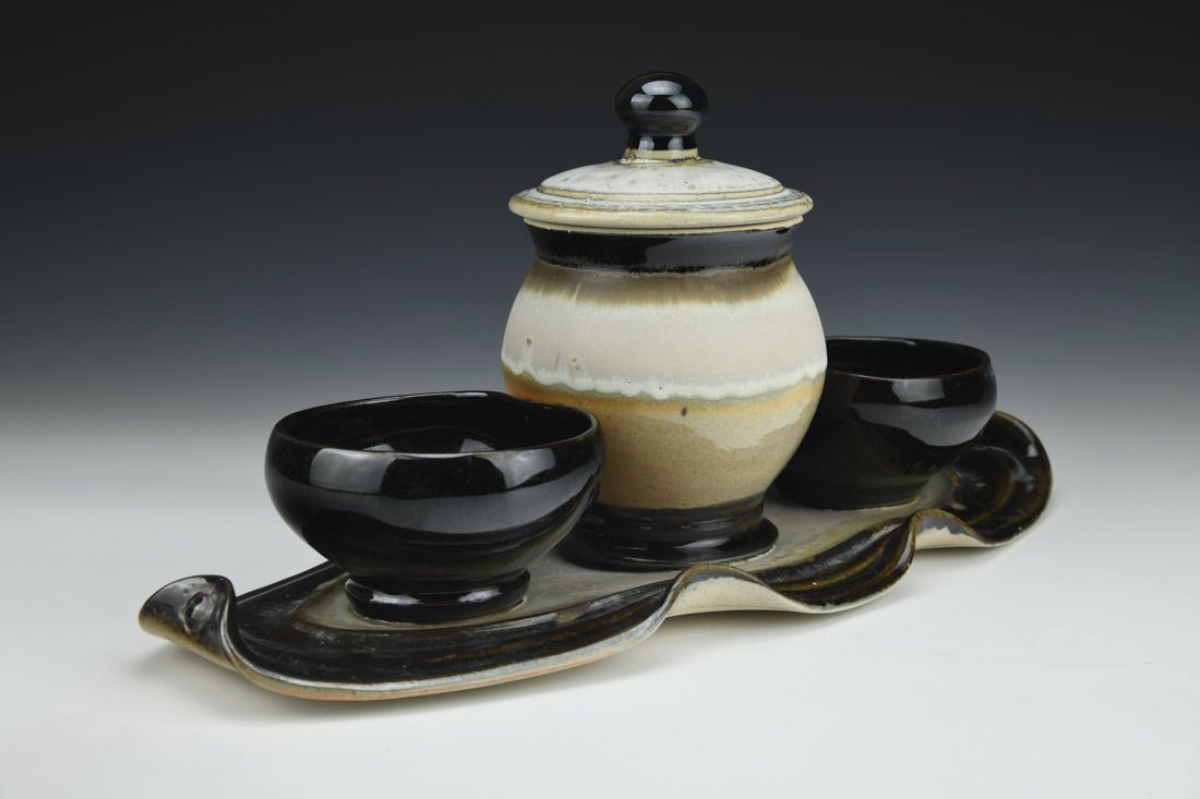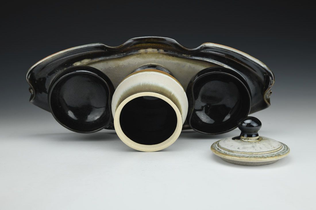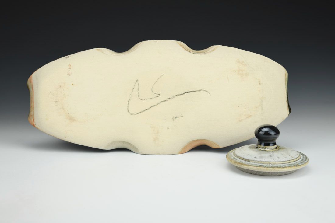 White stoneware, wheel thrown and altered, multiple glazes, cone 10 reduction fired, 7.25 x 15.75 x 7 inches.