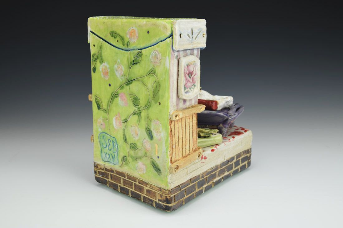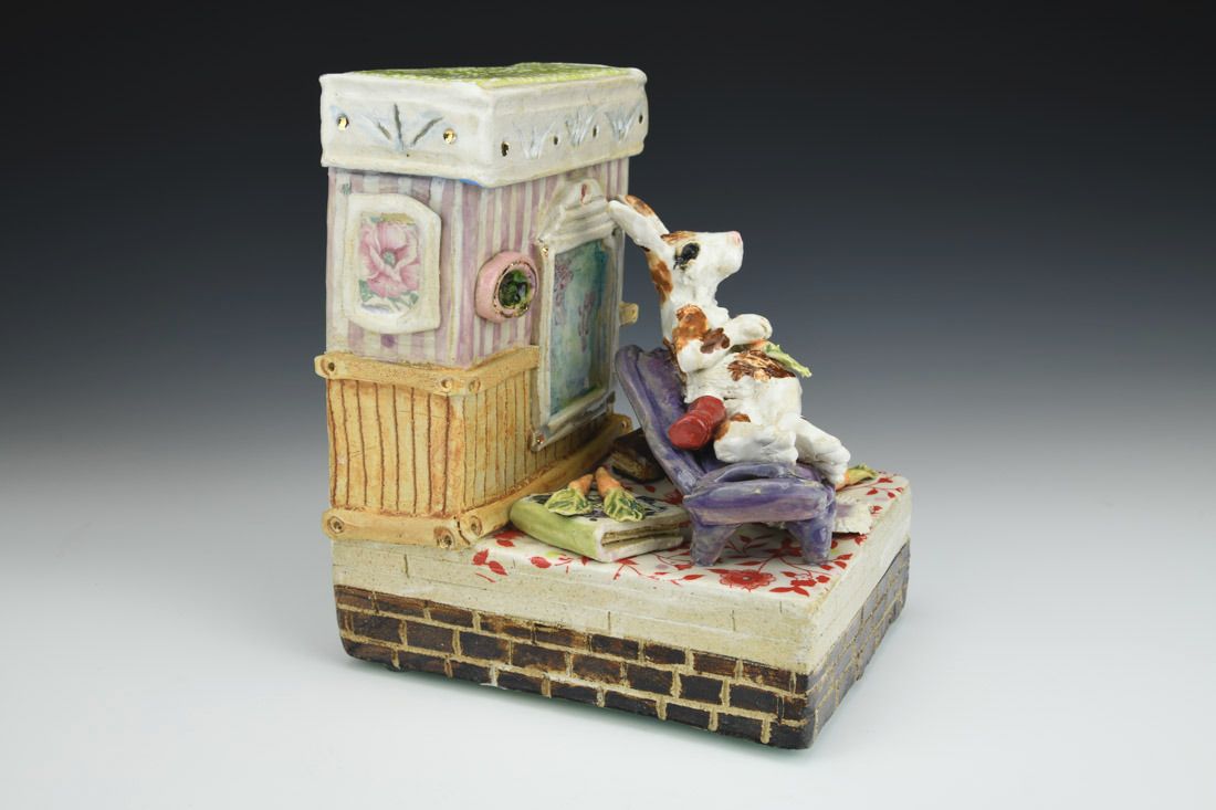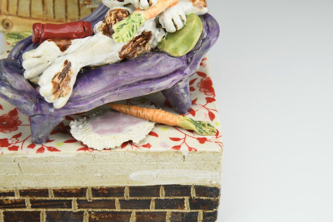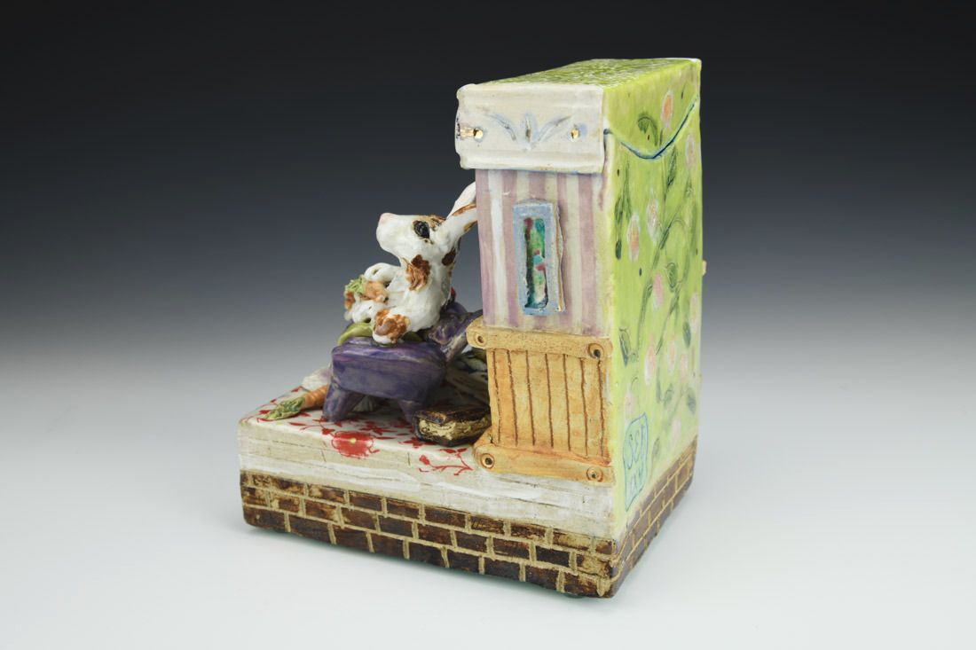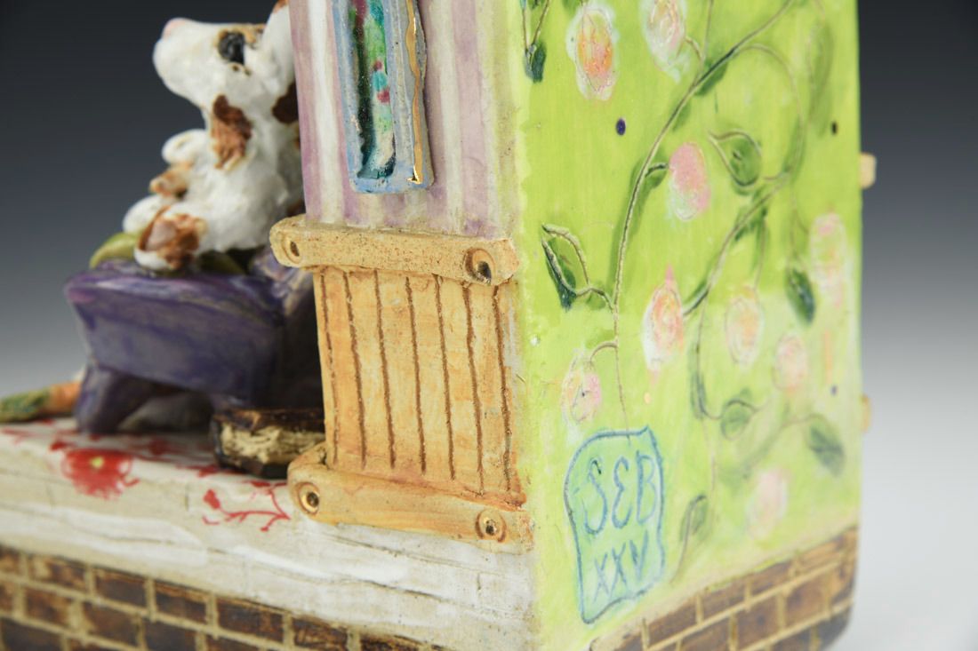 Stoneware with enamels, acrylic and rubber feet, hand built with slabs and sculpted elements, slips, resists, transfers, glazes, decals, lusters, cone 5 oxidation fired, 8 x 5.25 x 7 inches.