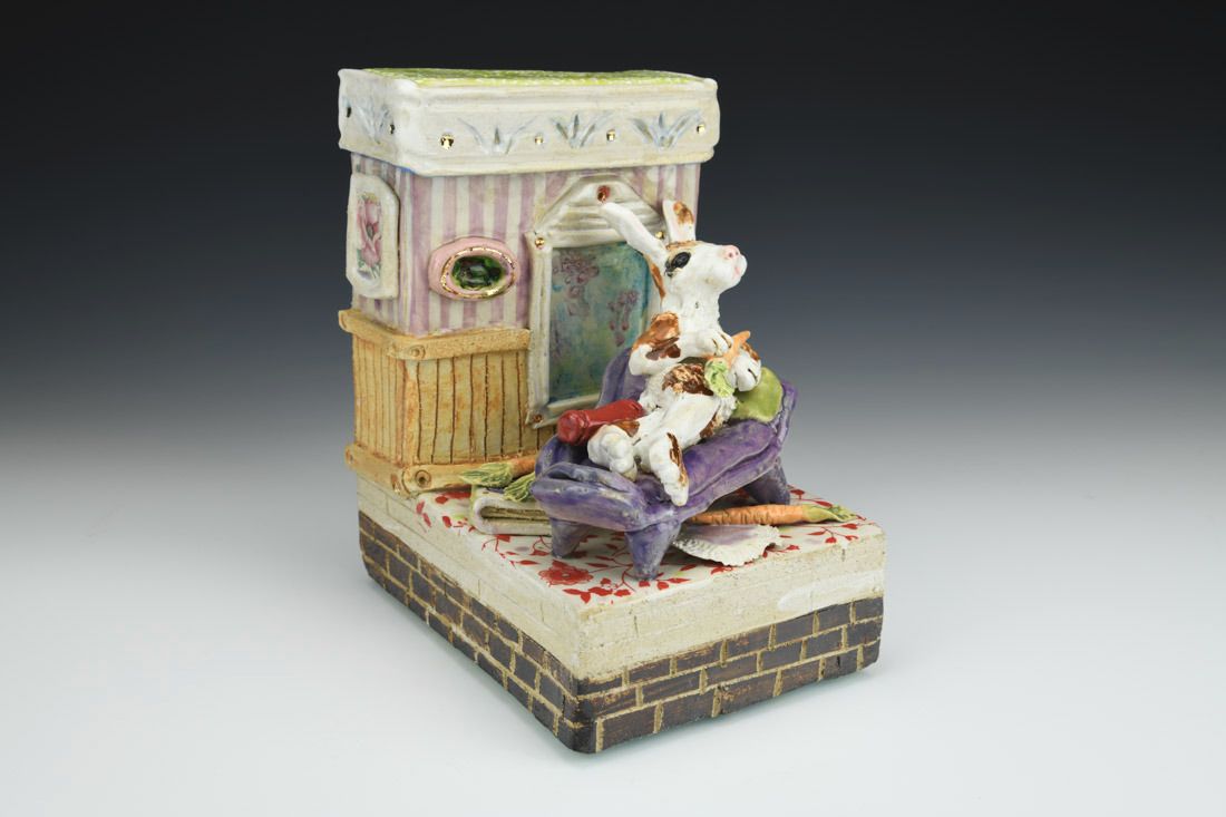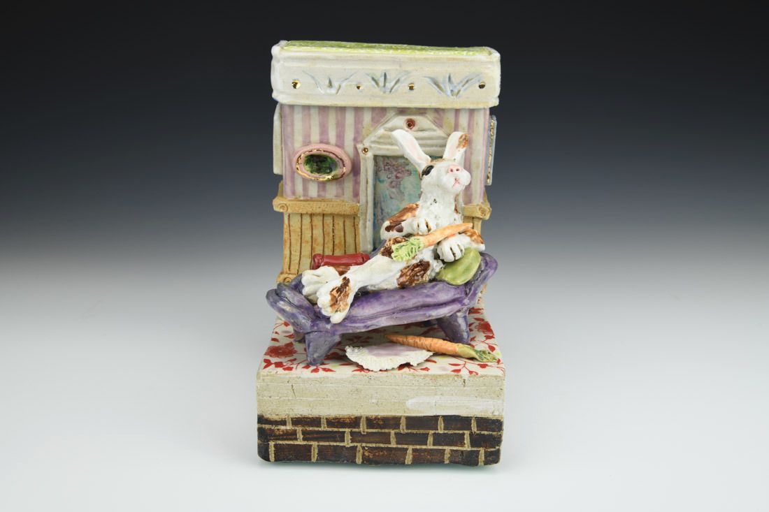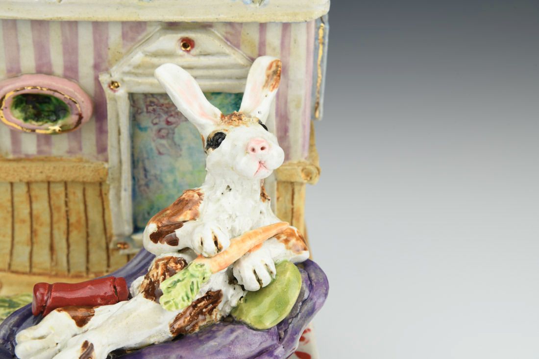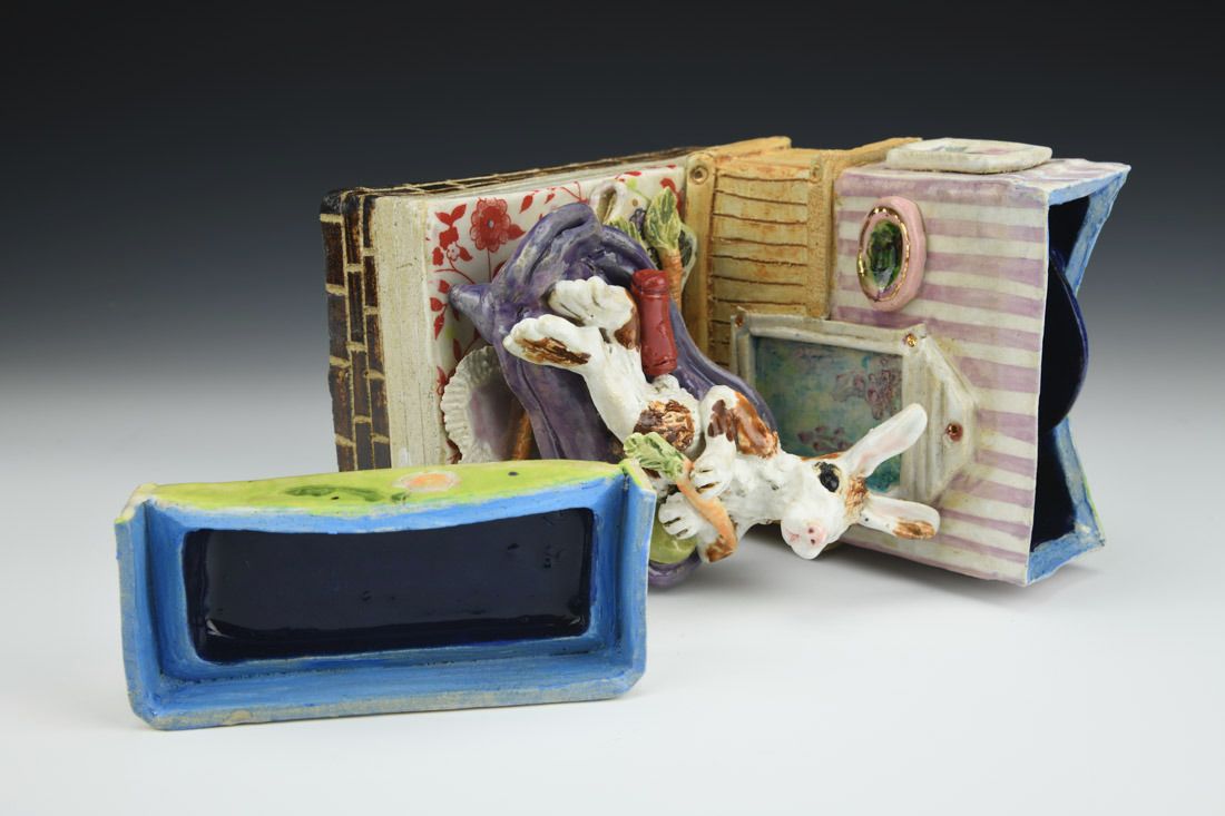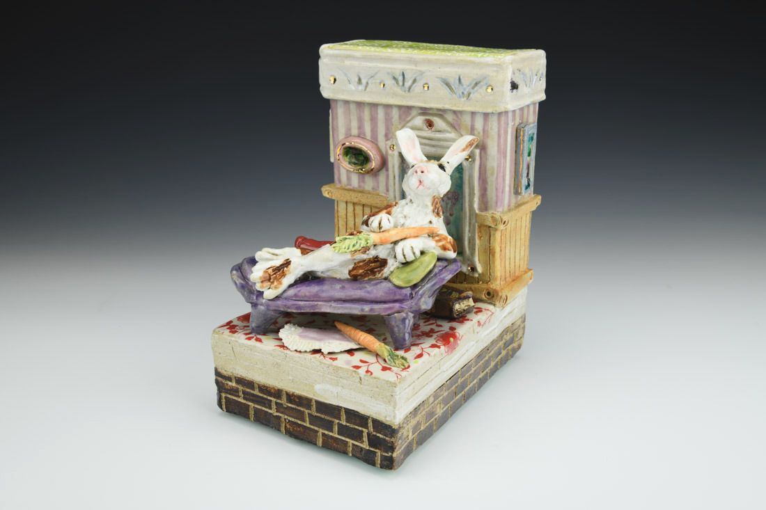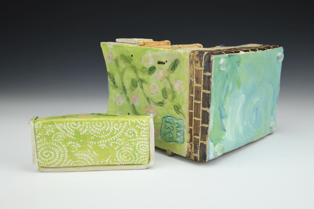 Stoneware with enamels, acrylic and rubber feet, hand built with slabs and sculpted elements, slips, resists, transfers, glazes, decals, lusters, cone 5 oxidation fired, 8 x 5.25 x 7 inches.