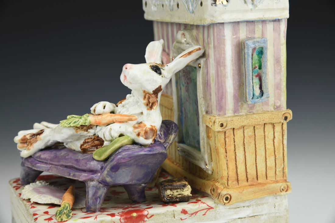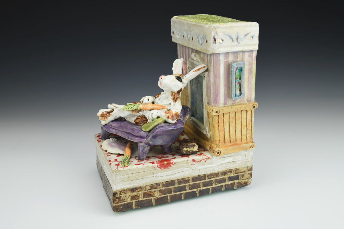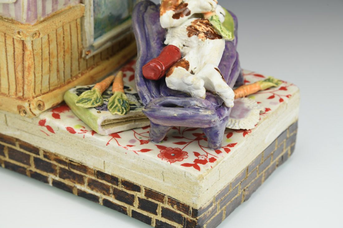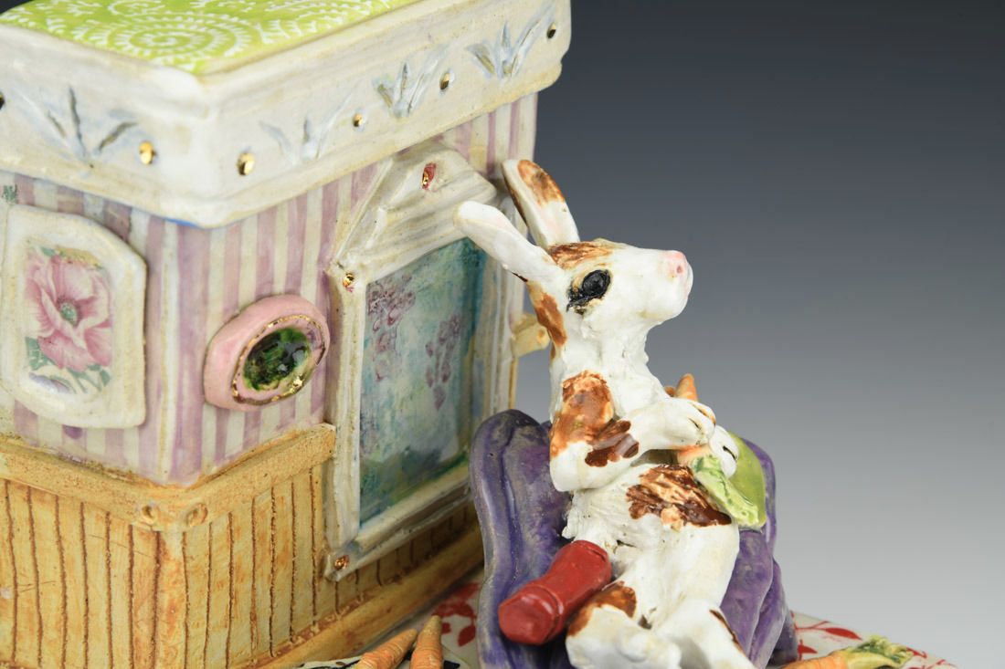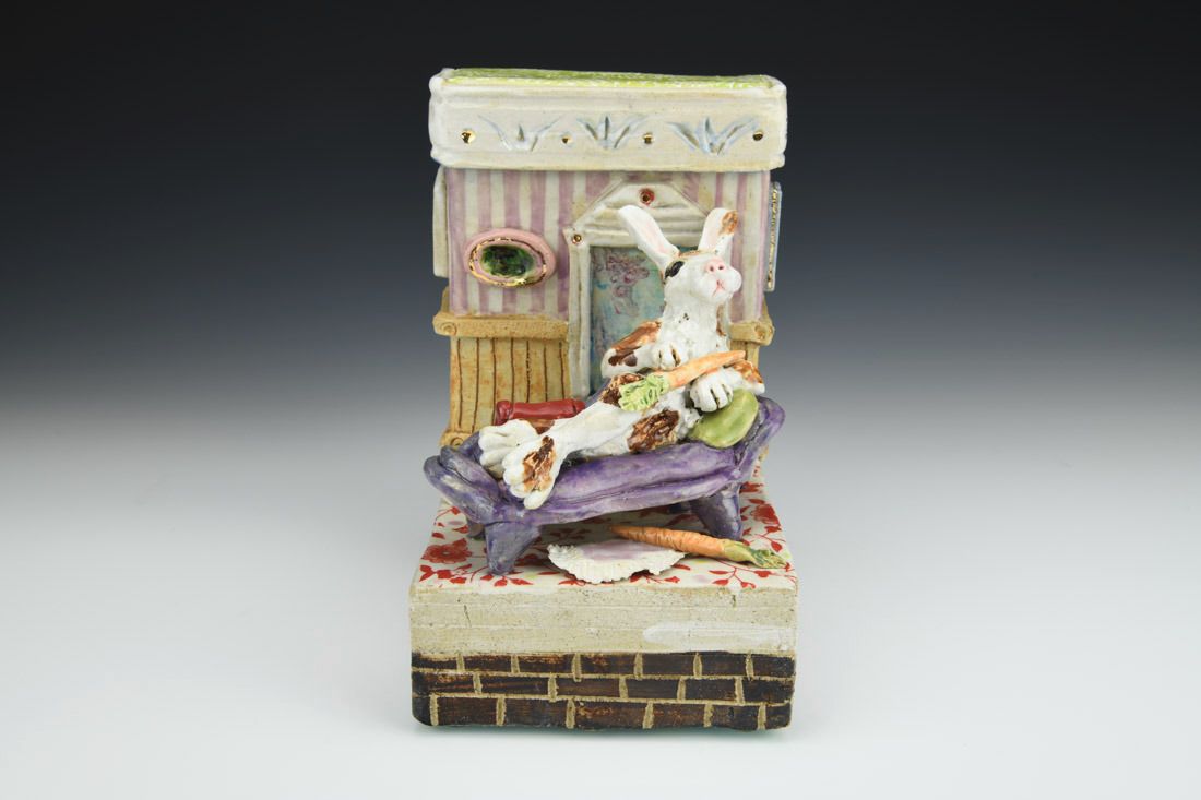 Stoneware with enamels, acrylic and rubber feet, hand built with slabs and sculpted elements, slips, resists, transfers, glazes, decals, lusters, cone 5 oxidation fired, 8 x 5.25 x 7 inches.