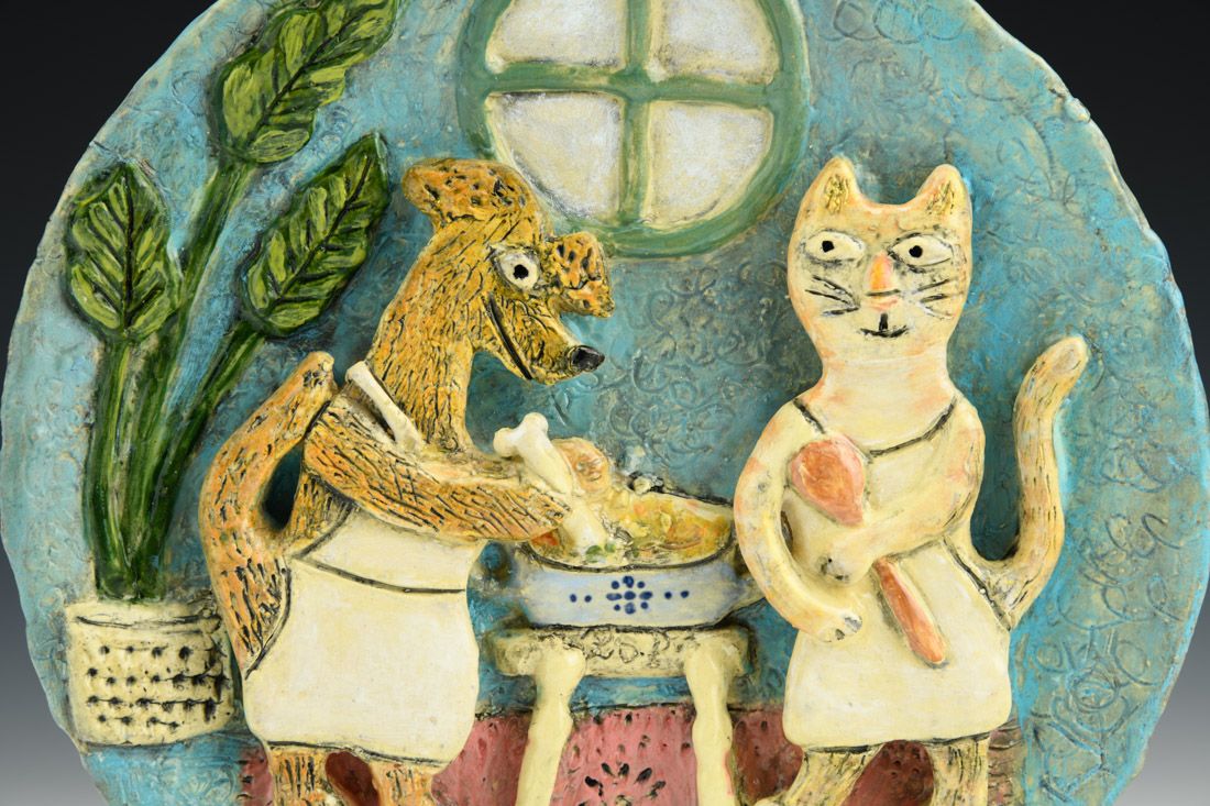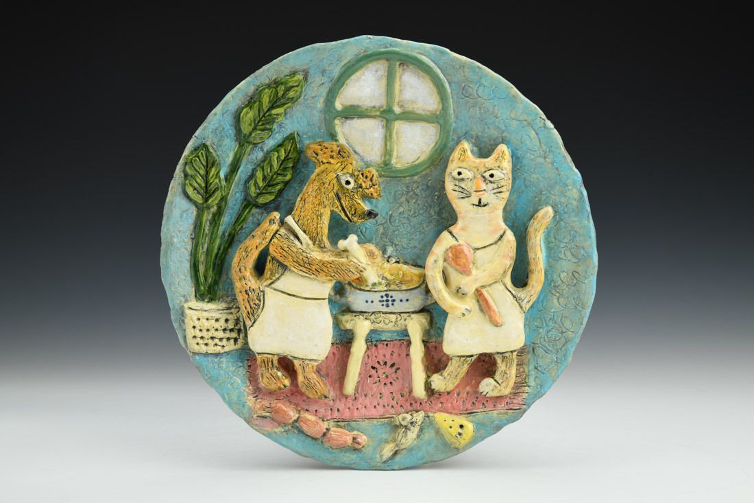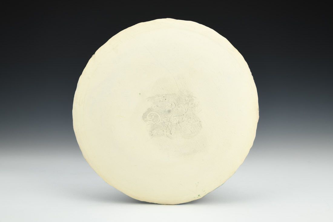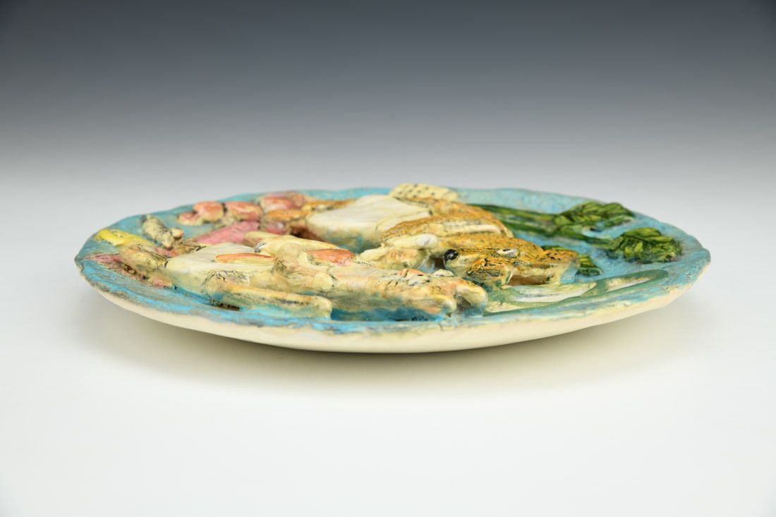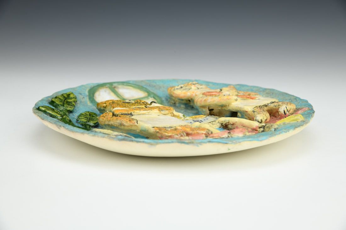 Earthenware, hand built with slabs, sculpted, carved, underglaze, glaze, cone 04 fired, 1 x 8 x 8 inches.