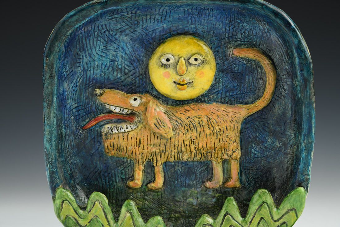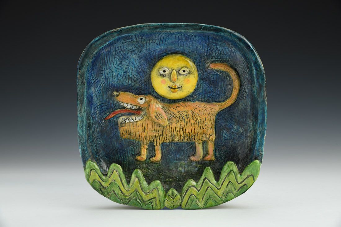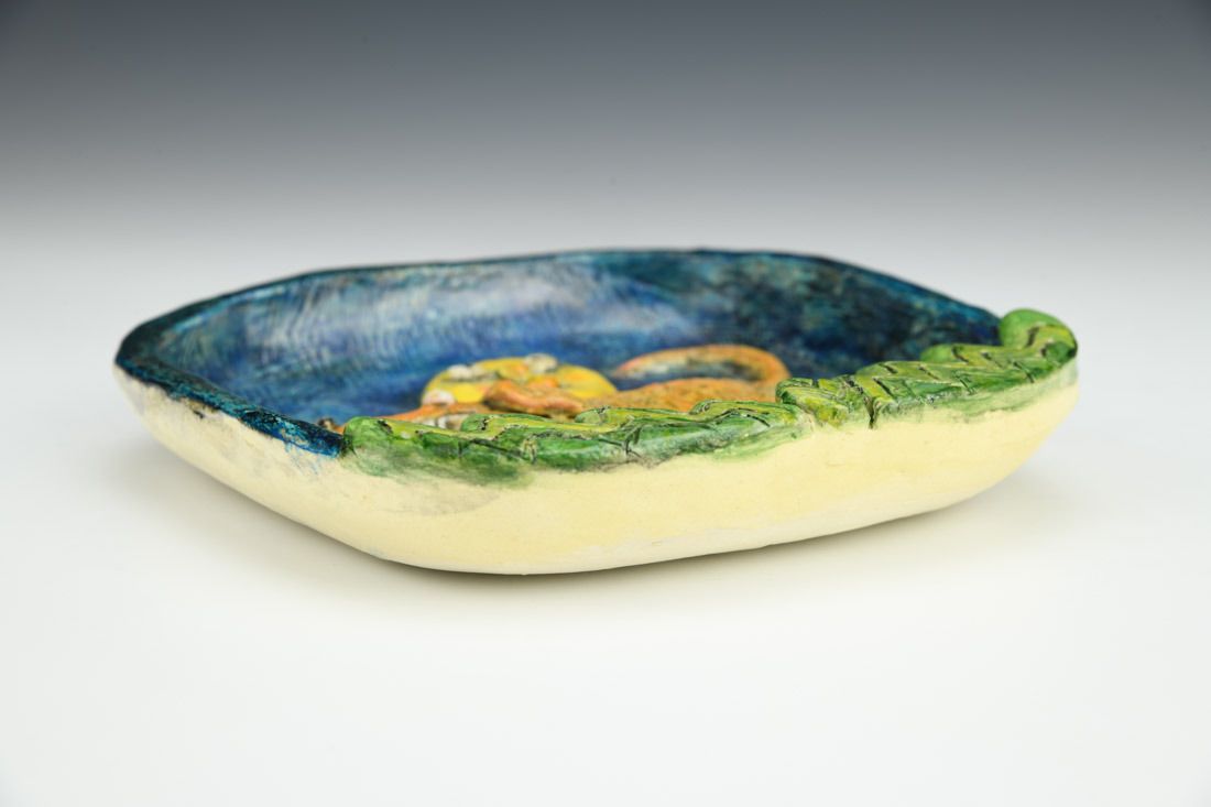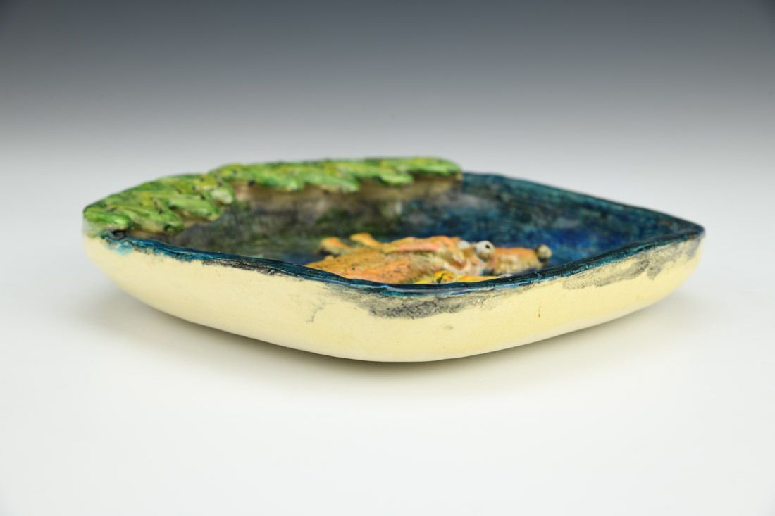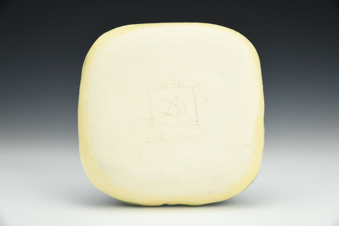 Earthenware, hand built with slabs, sculpted, carved, iron oxide, underglaze, glaze, cone 04 fired, 1 x 6.5 x 6.5 inches.