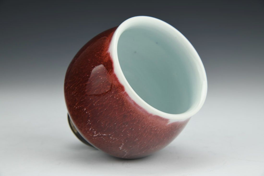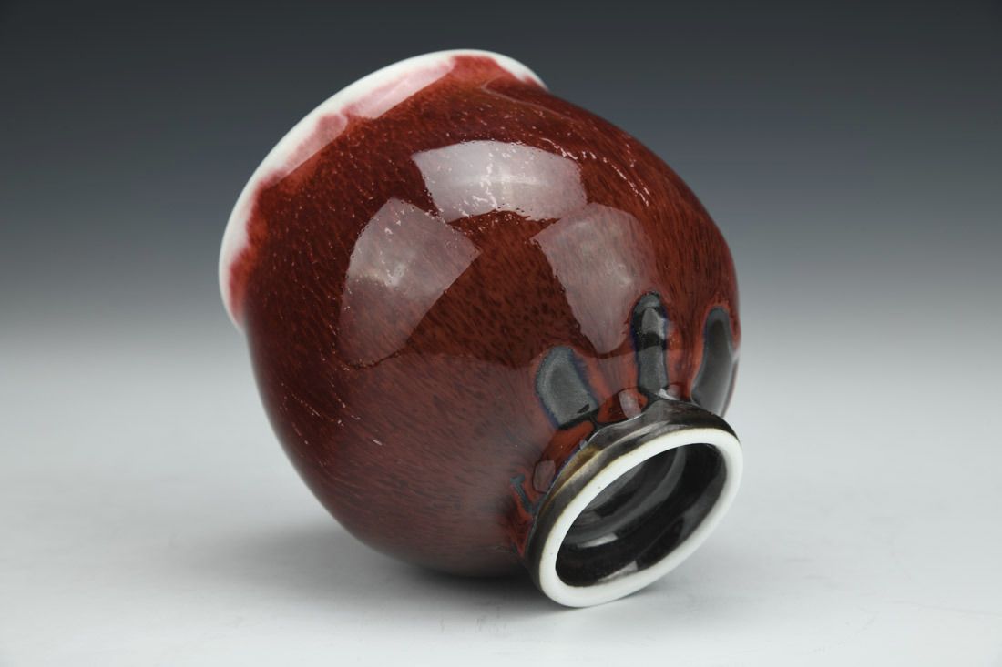 Grolleg porcelain, wheel thrown, layered copper red glazes, cone 10 gas reduction, 3.75 x 3.75 x 3.75 inches.