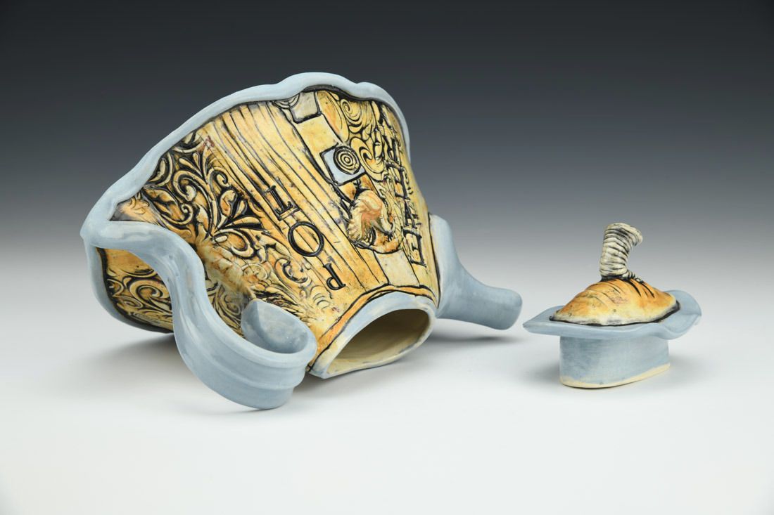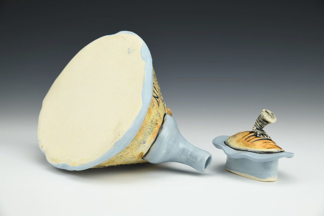 White stoneware, hand built and wheel thrown, Mason stains, slips, underglaze, cone 6 electric fired, 5.75 x 8 x 6 inches.