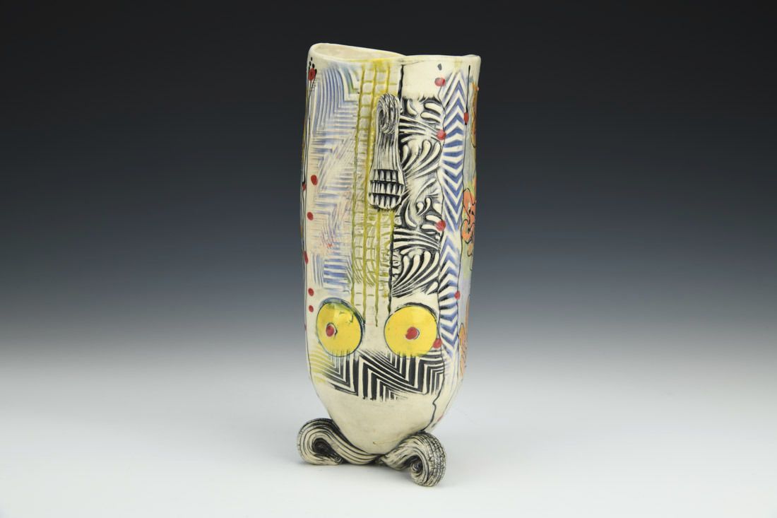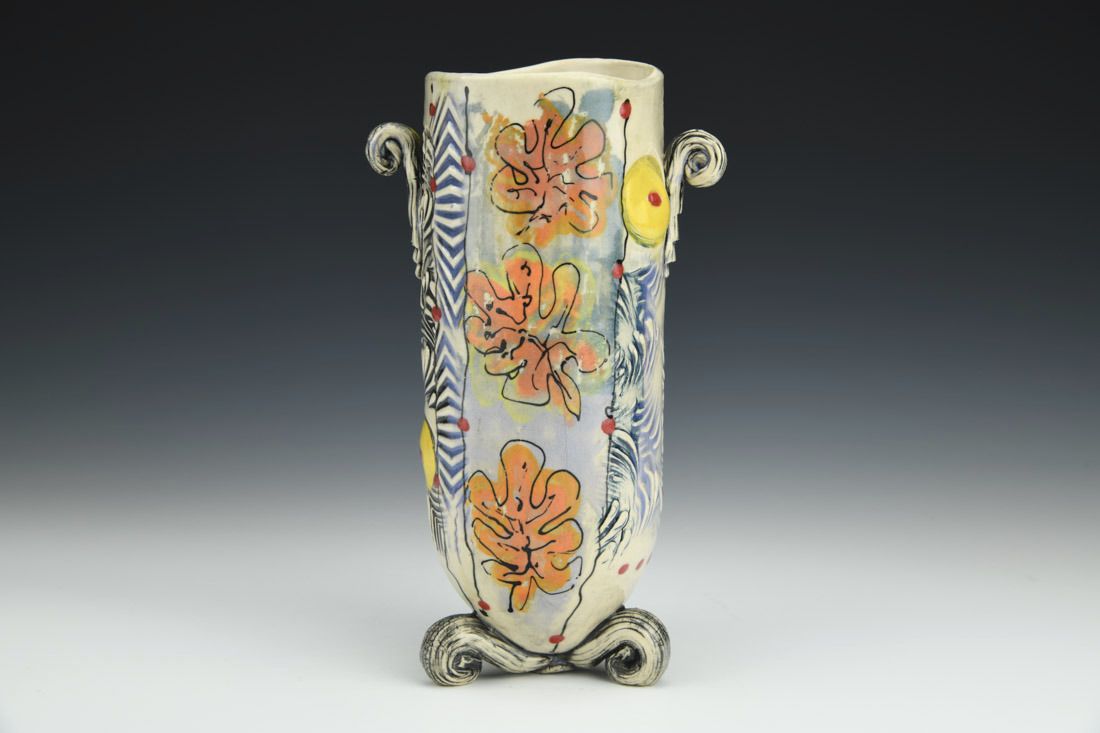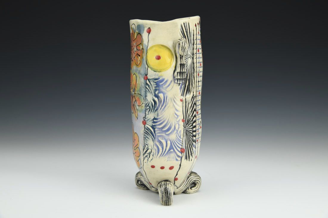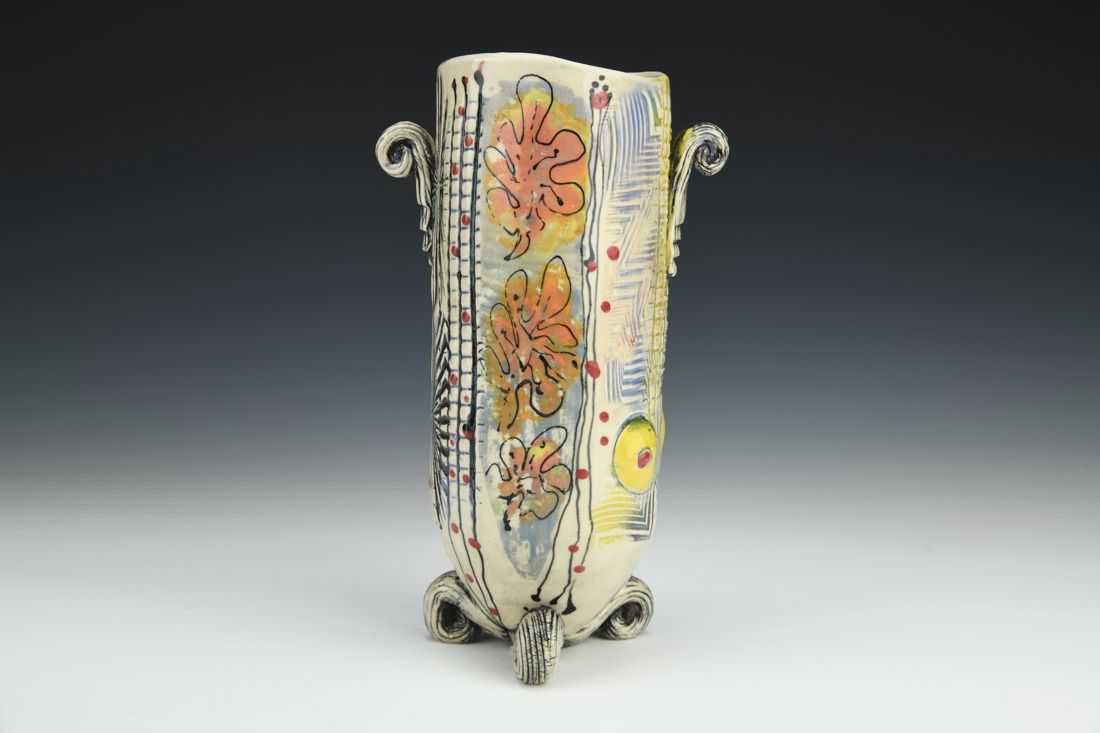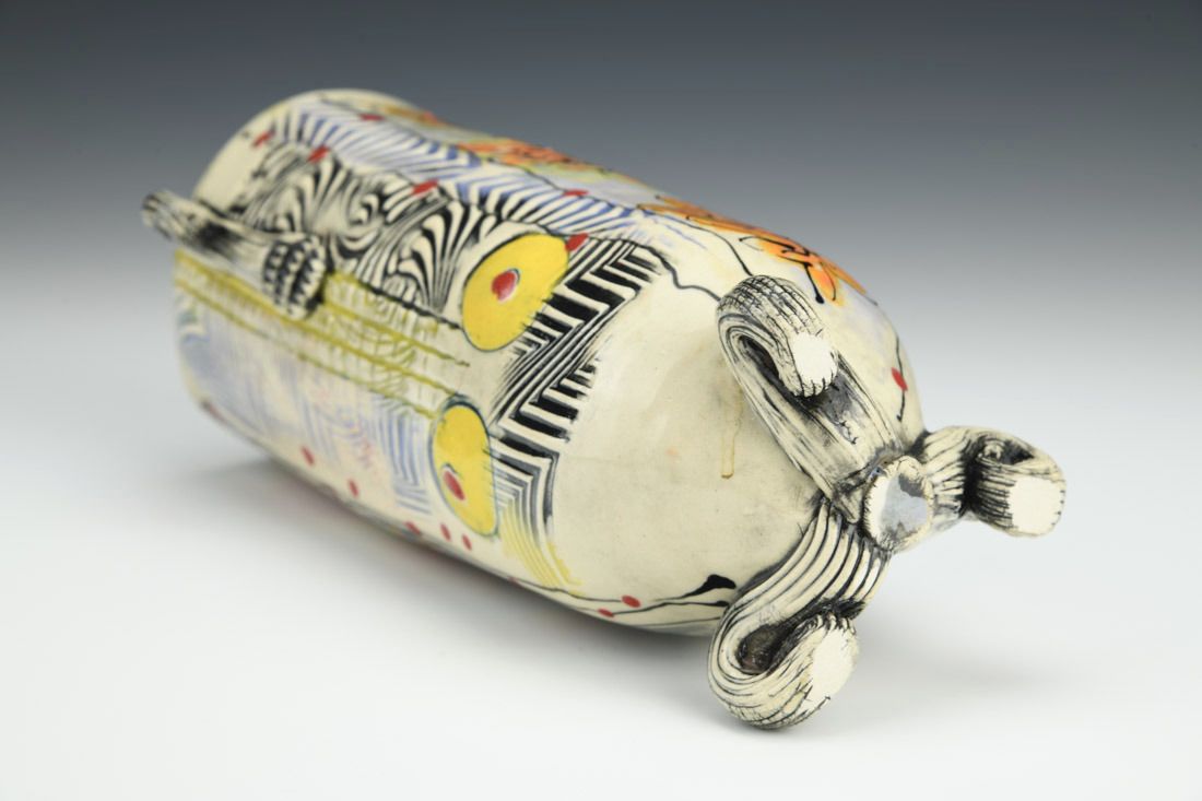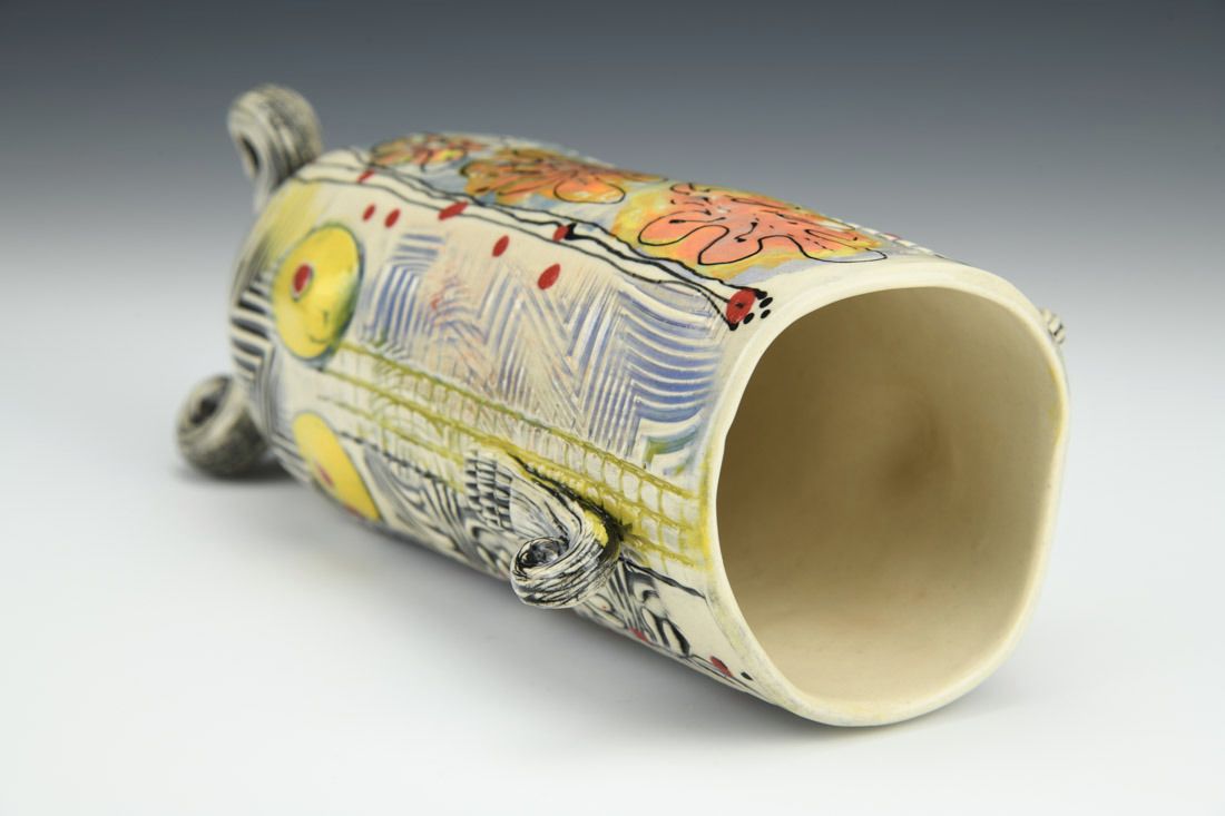 White stoneware, hand built, slips, decals, cone 6 electric fired, 8.25 x 5 x 3.5 inches.
