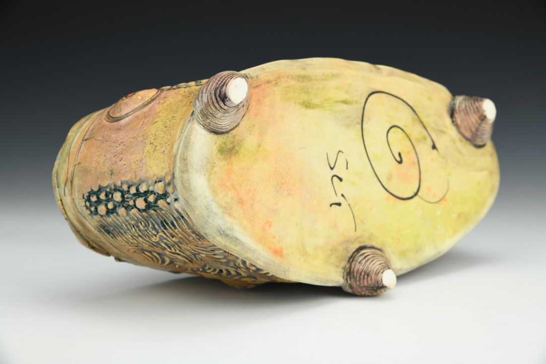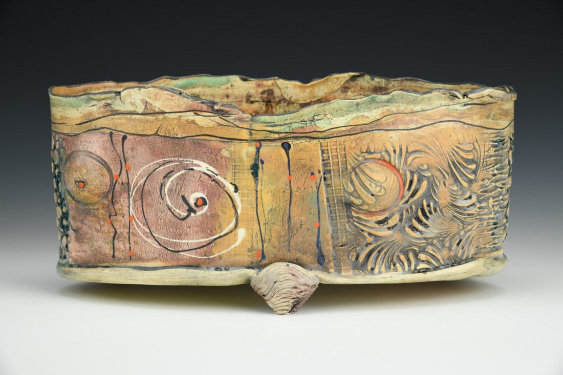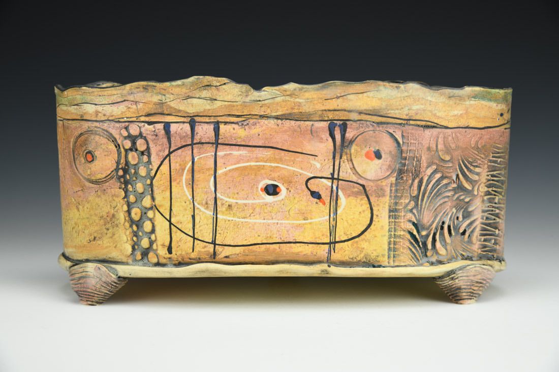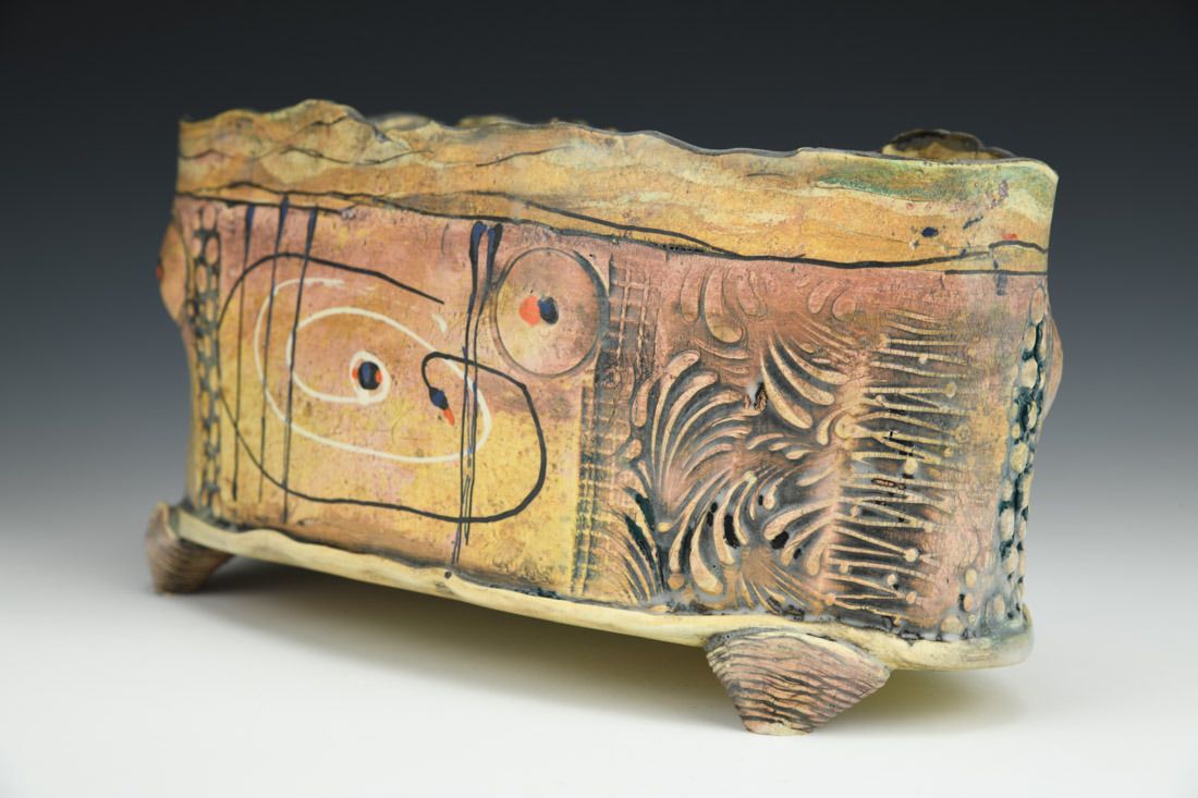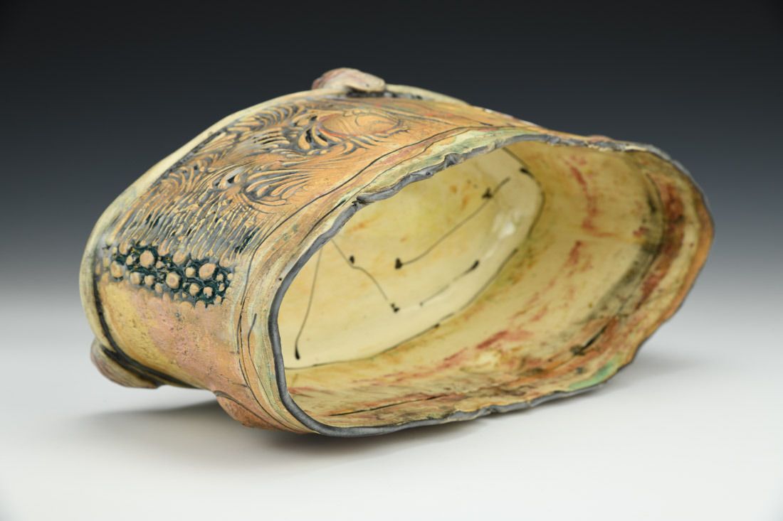 White earthenware, hand built, cone 05 electric fired, 5 x 10.75 x 4.5 inches.