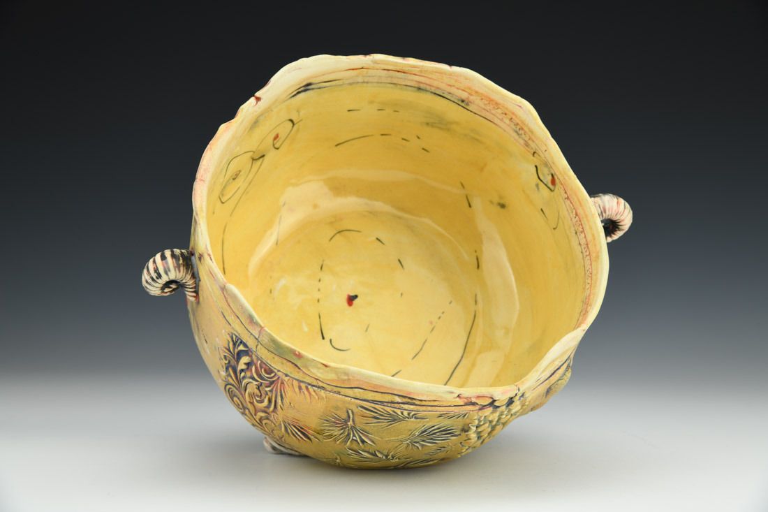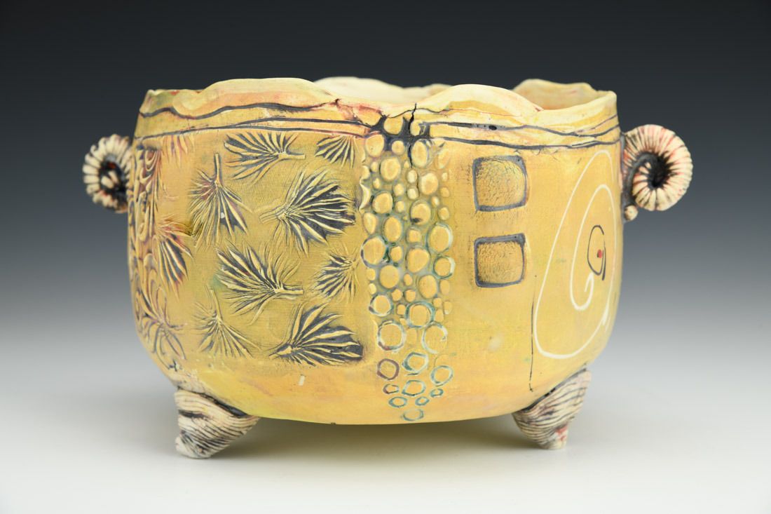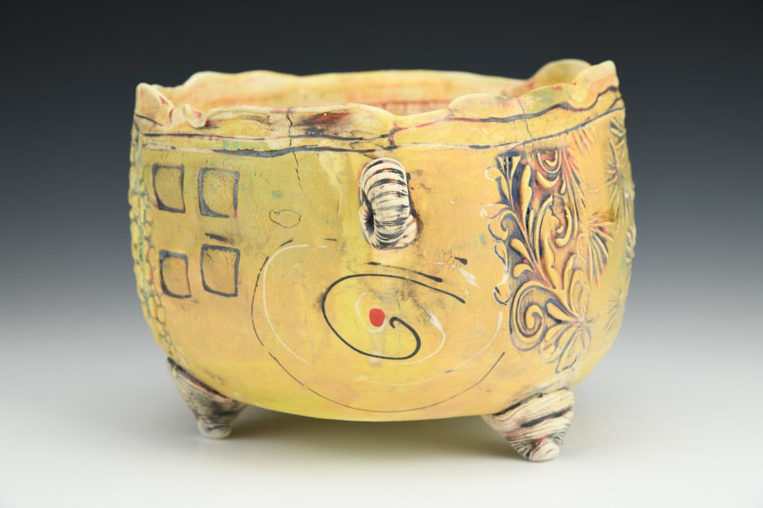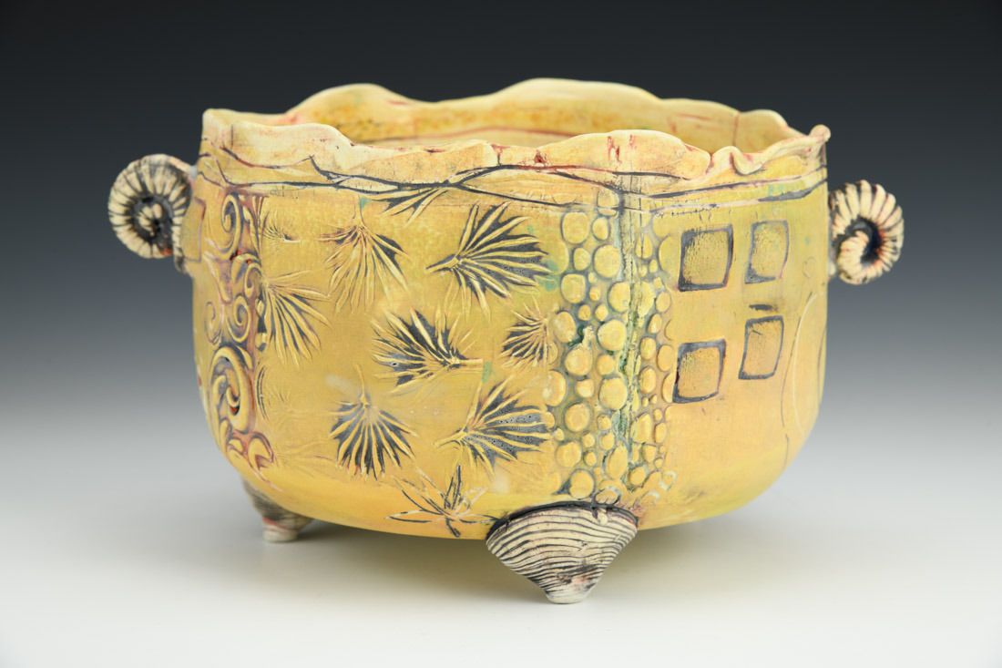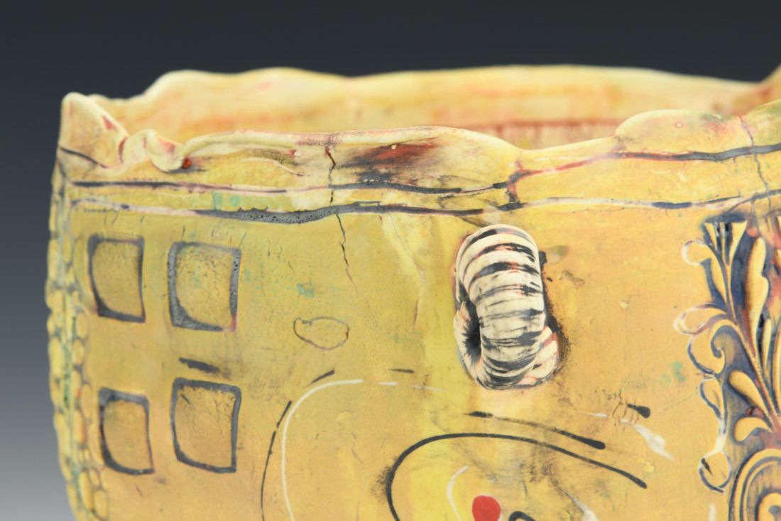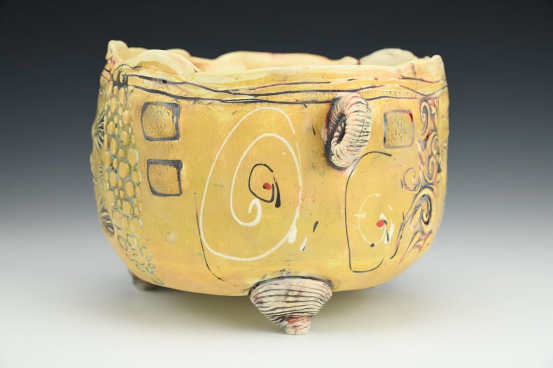 White earthenware, hand built, cone 05 electric fired, 4.75 x 8.75 x 7 inches.