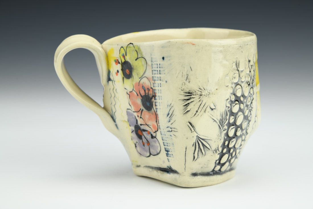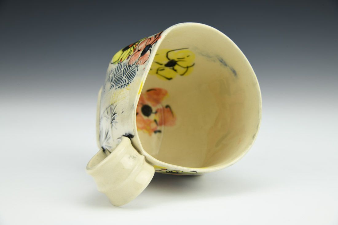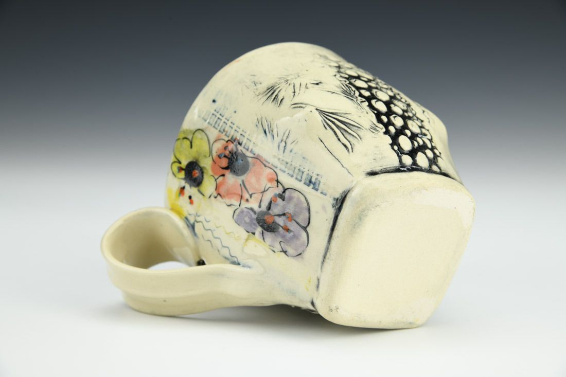 White stoneware, hand built, slips, stains, underglaze, cone 6 electric fired, 3.5 x 5 x 4 inches.