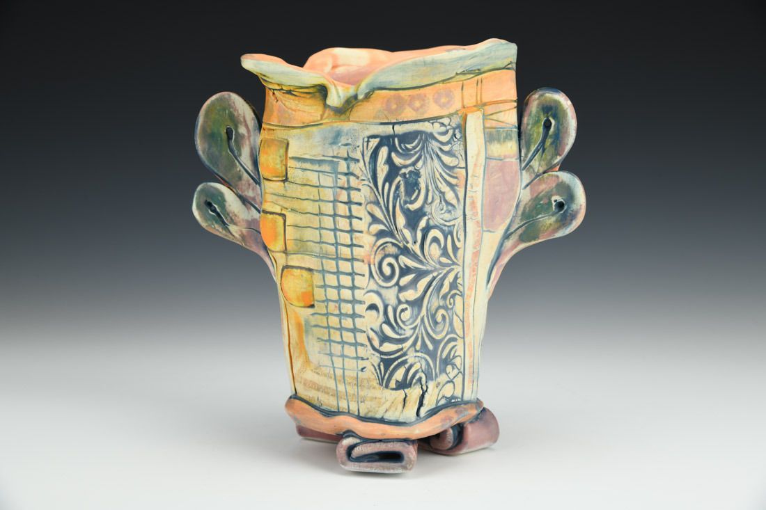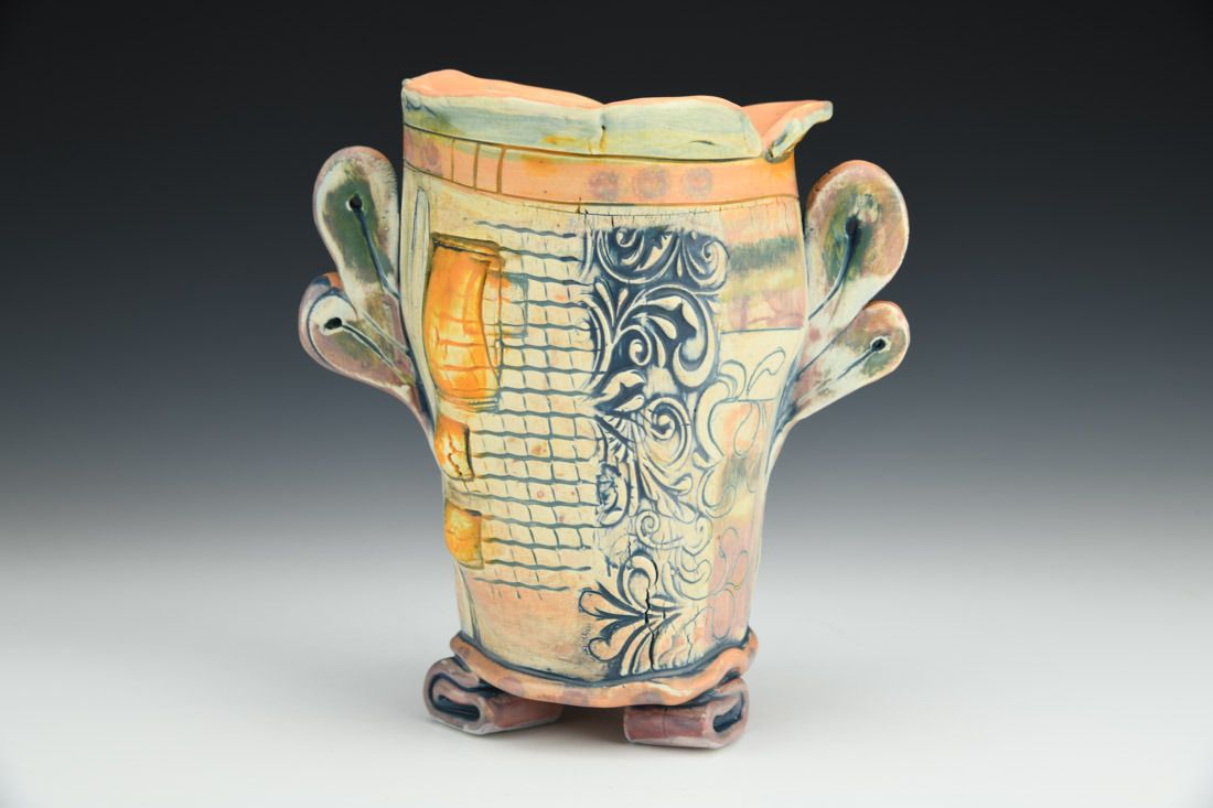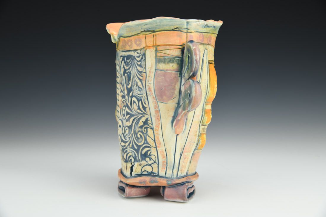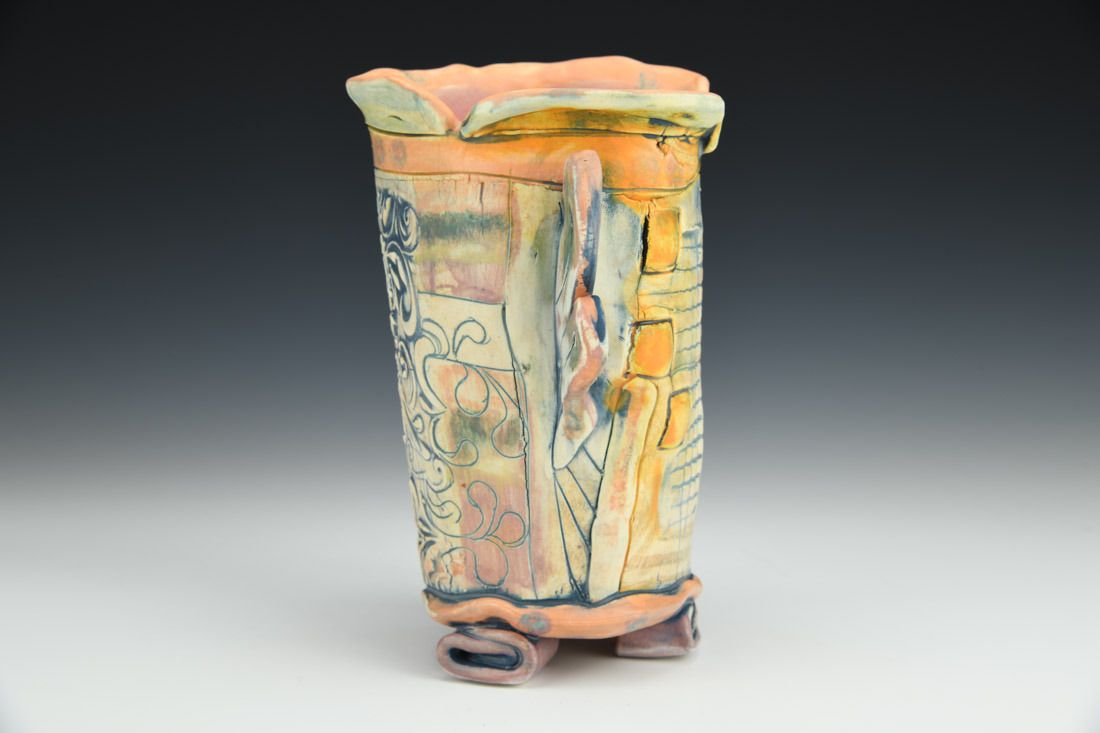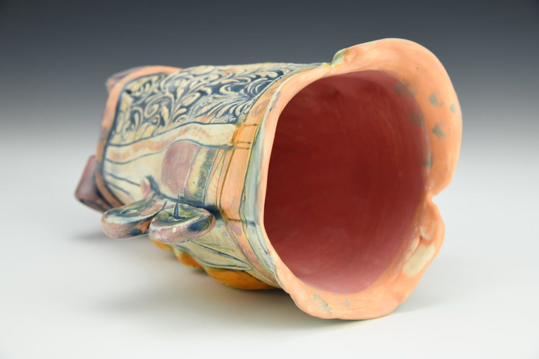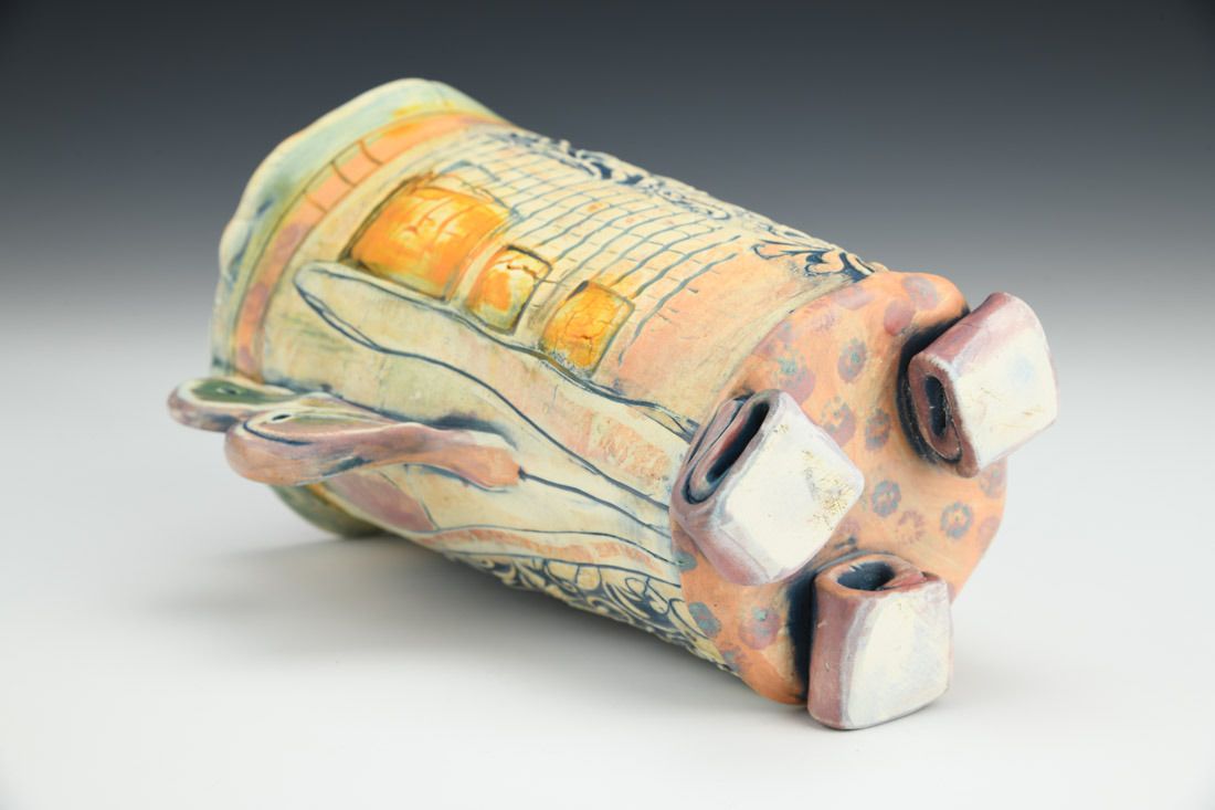 White earthenware, hand built, slips, stains, underglaze, cone 6 electric fired, 7 x 7 x 4.5 inches.