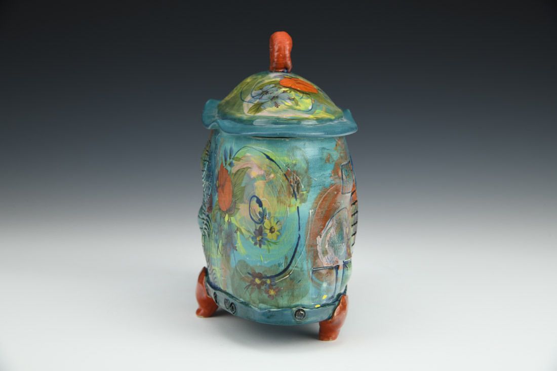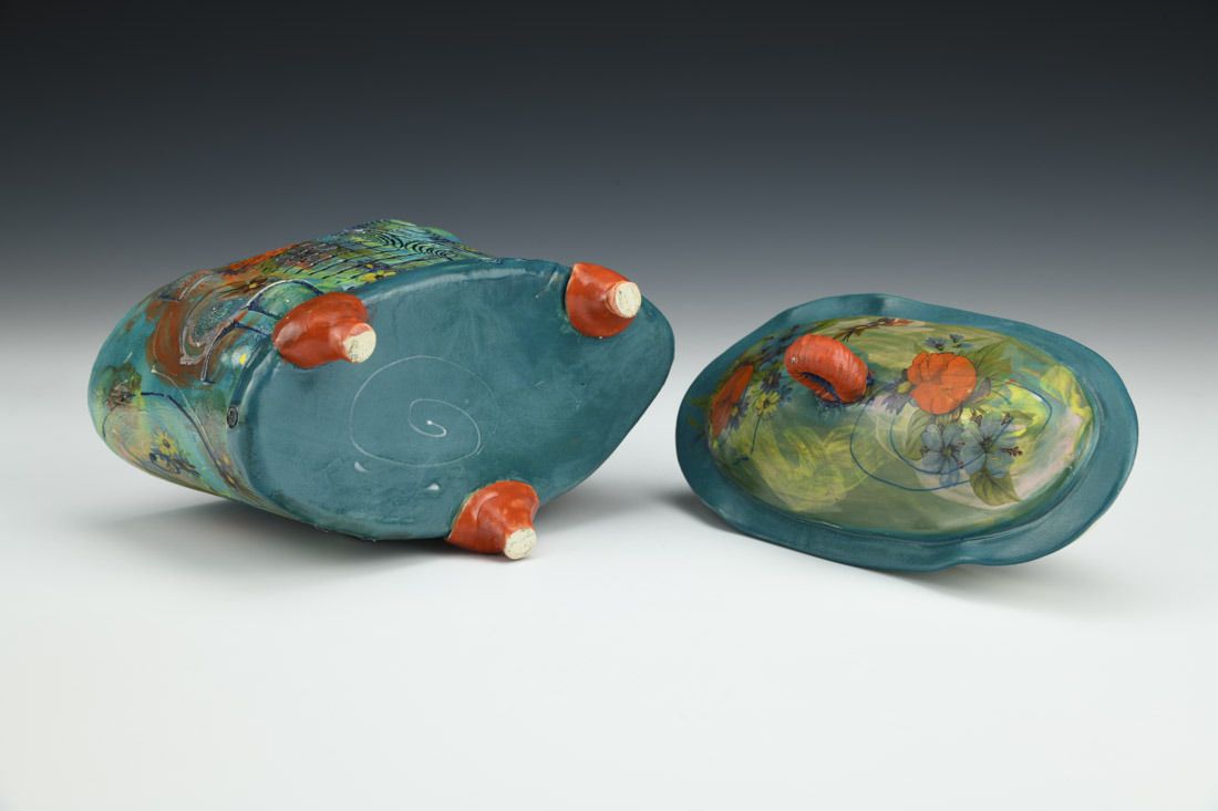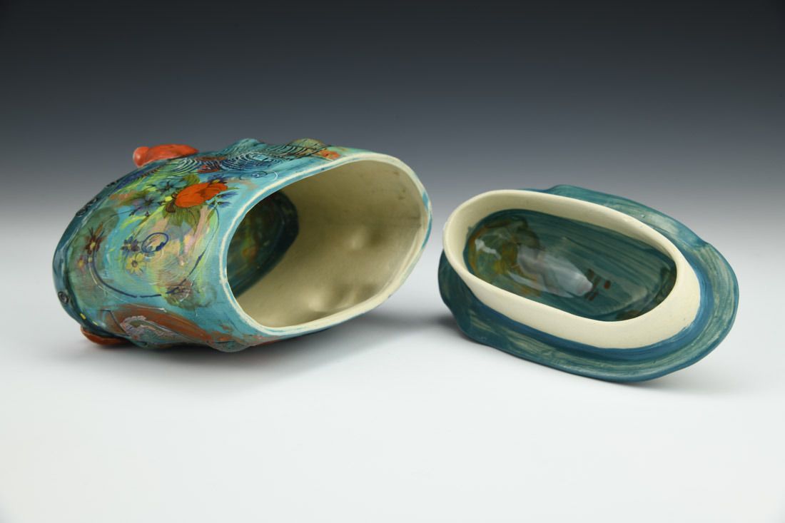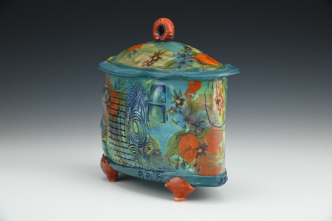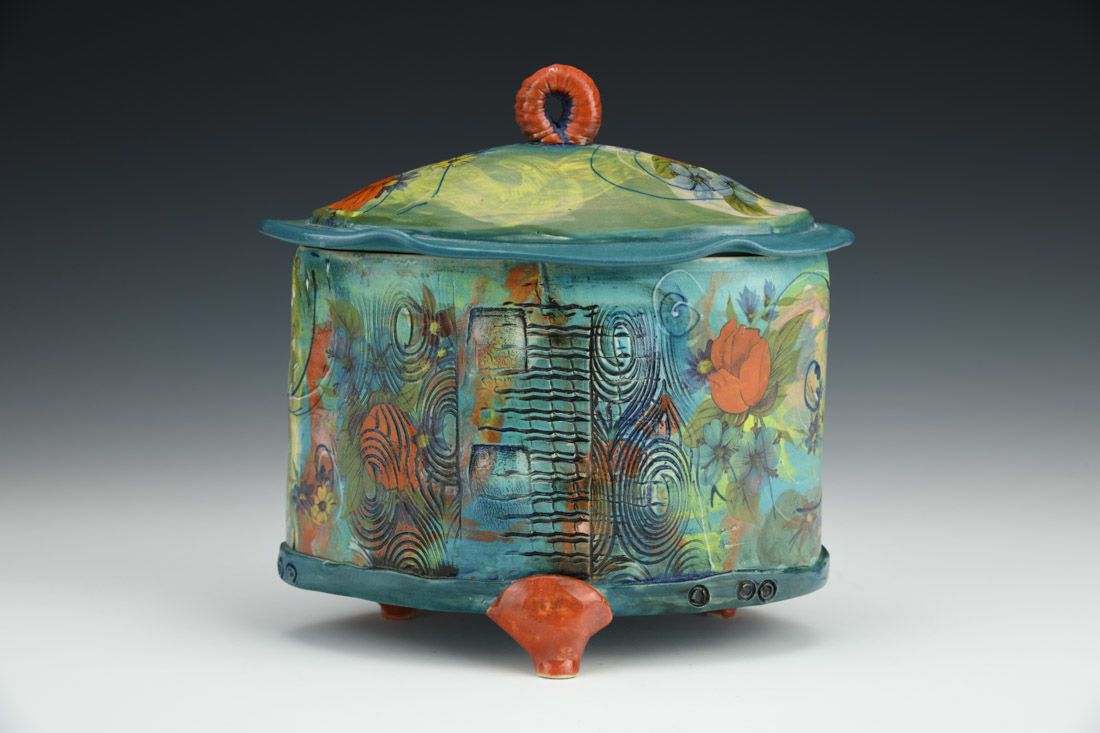 White stoneware, hand built, cone 6 electric fired, 6.25 x 7 x 4 inches.