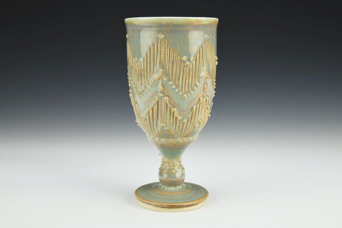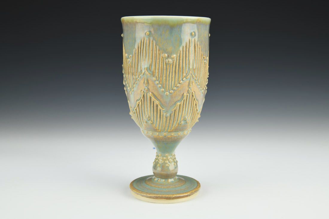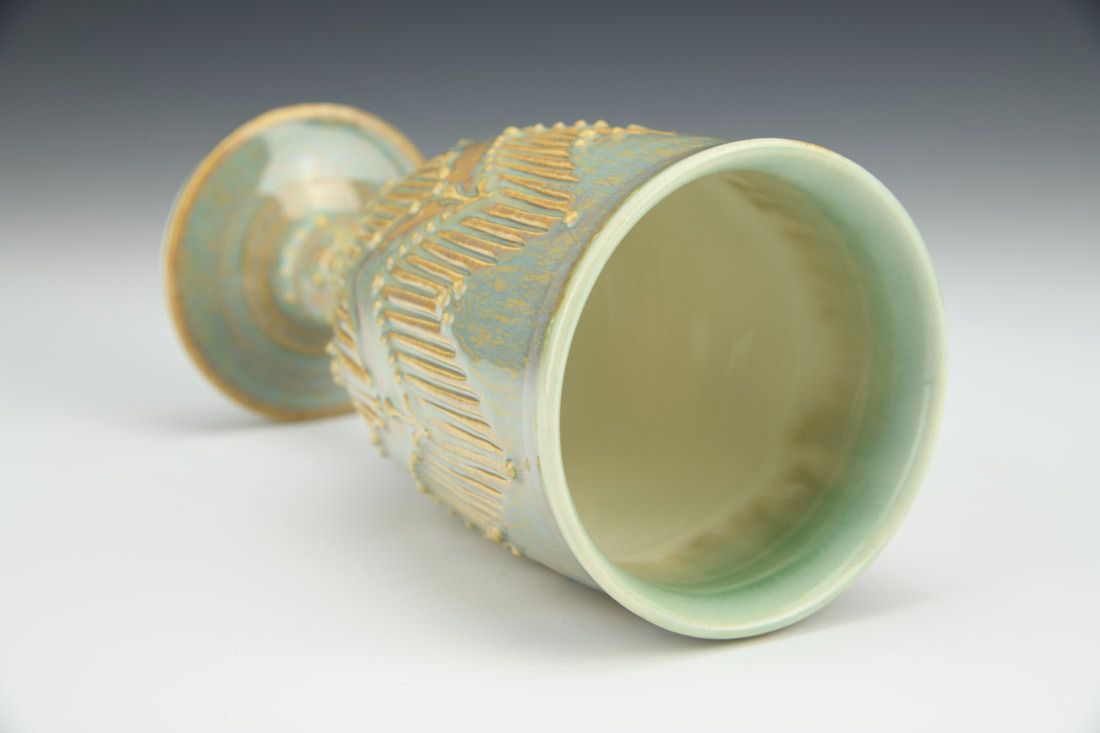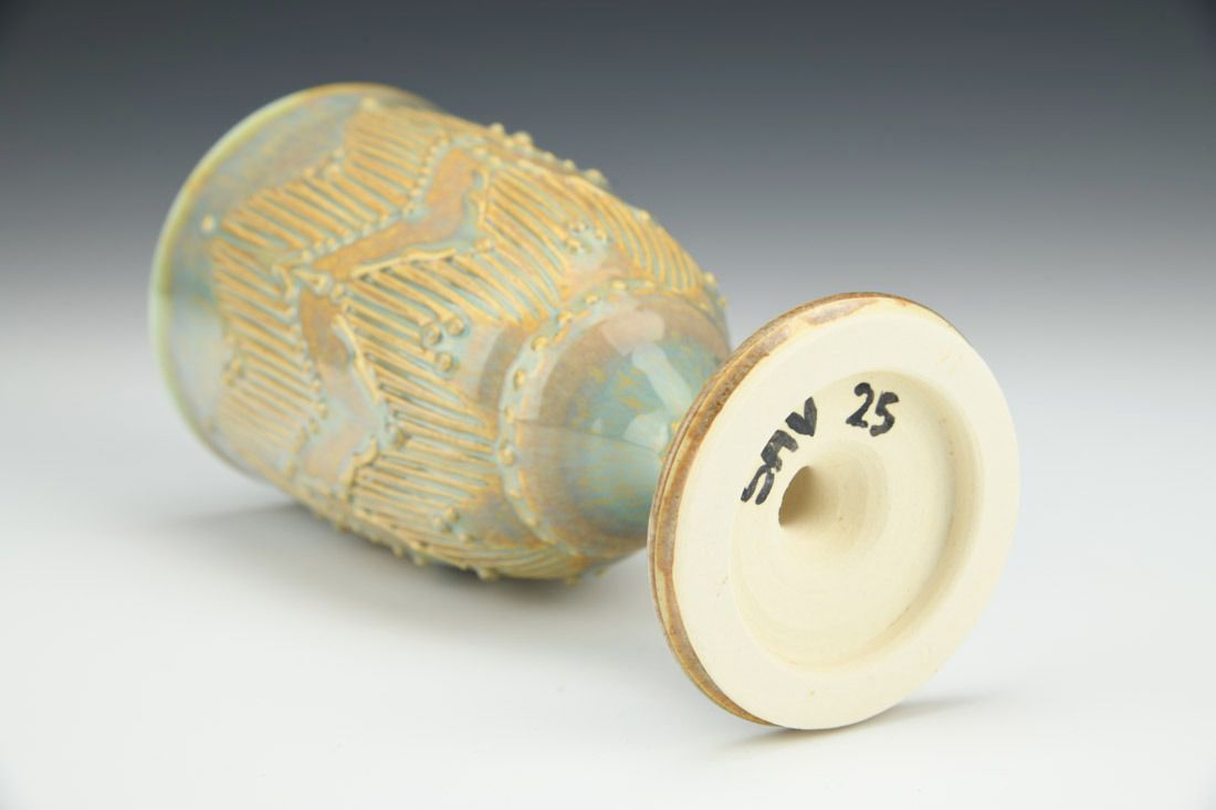 Porcelain, wheel thrown, carved, slip trailed, glaze, cone 5.5 oxidation fired, 6.5 x 3.25 x 3.25 inches.