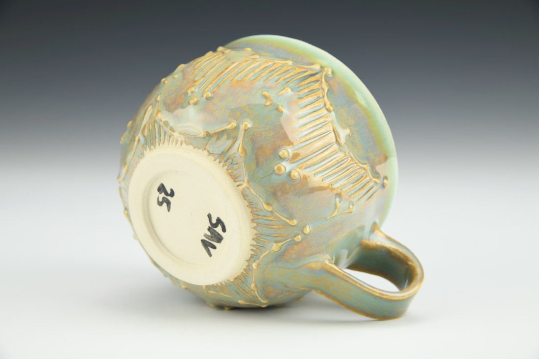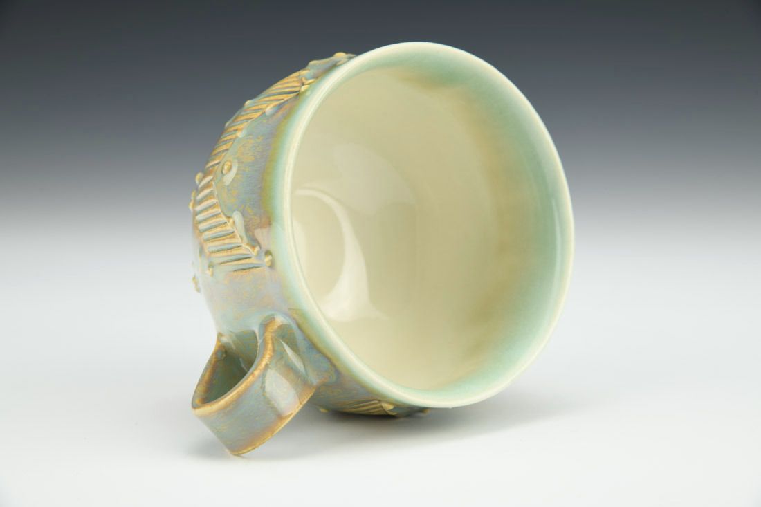 Porcelain, wheel thrown, carved, slip trailed, glaze, cone 5.5 oxidation fired, 2.25 x 4.25 x 3.25 inches.