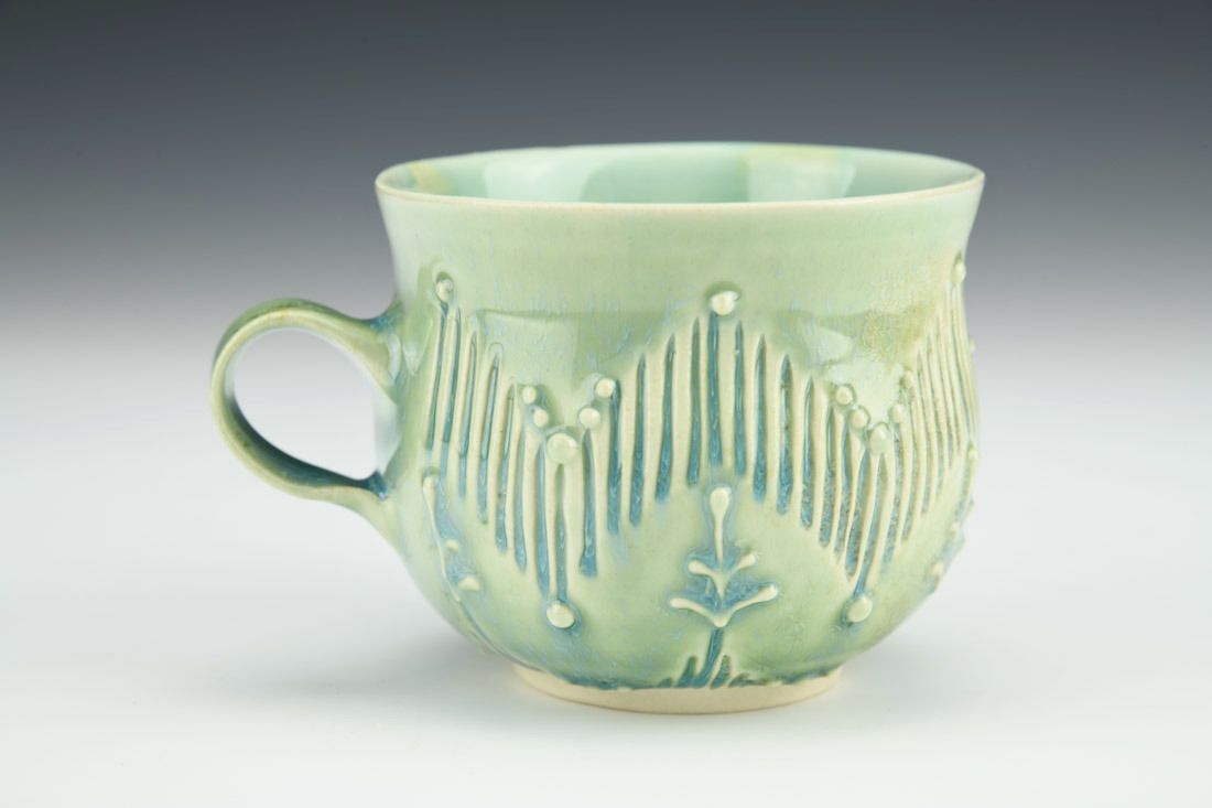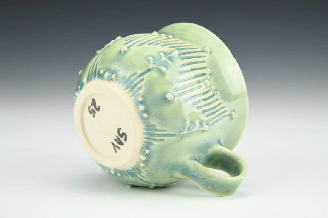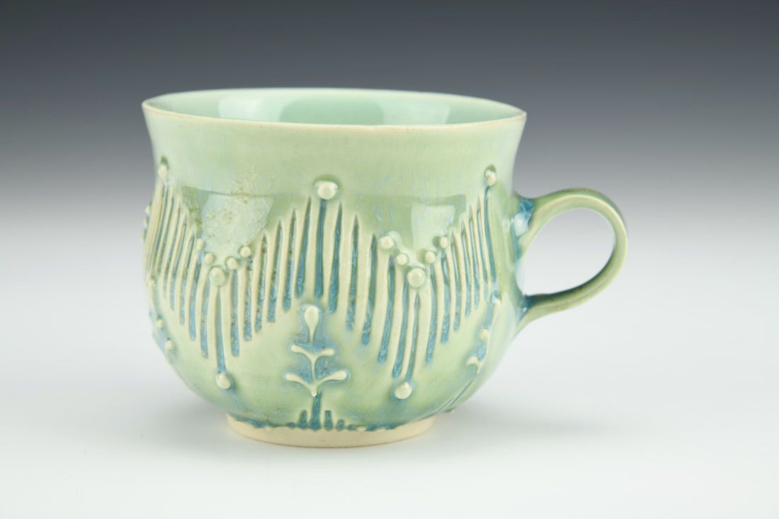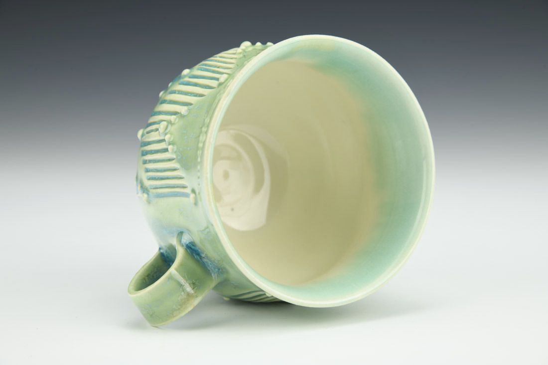 Porcelain, wheel thrown, carved, slip trailed, glaze, cone 5.5 oxidation fired, 2.75 x 4 x 3.25 inches.