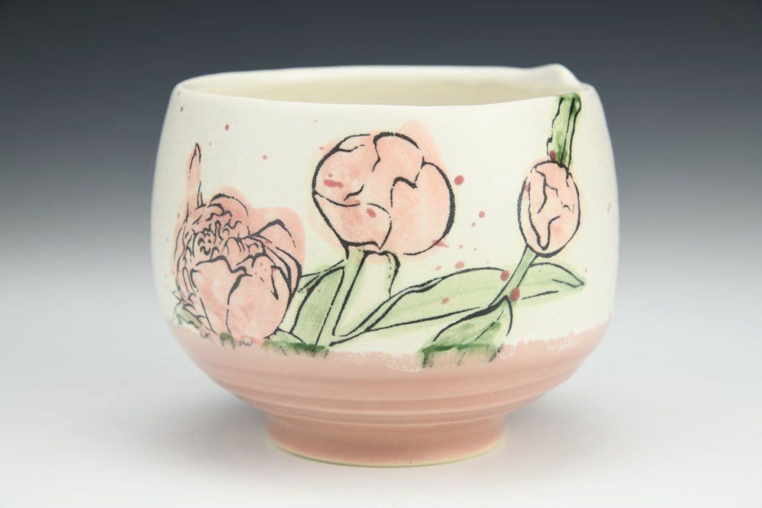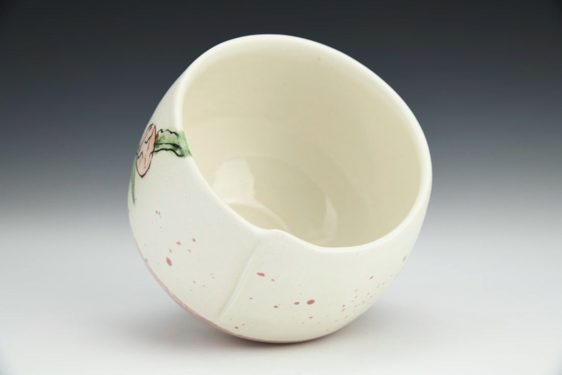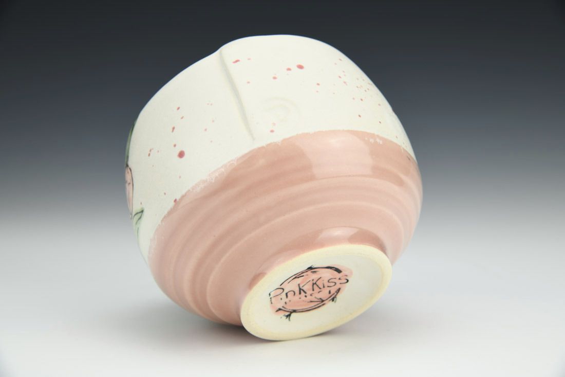 White stoneware, wheel thrown and hand built, screenprinted illustration, underglaze, glaze, cone 5 electric fired, 4 x 3 x 3 inches.