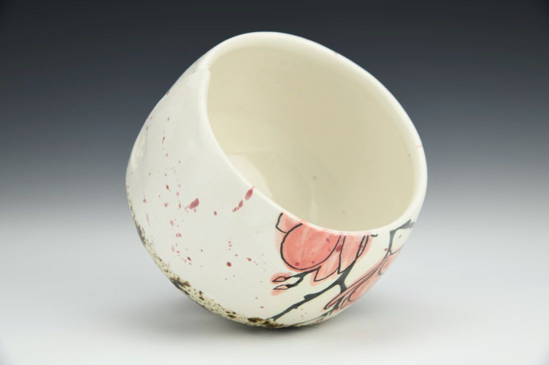White stoneware, wheel thrown and hand built, screenprinted illustration, underglaze, glaze, cone 5 electric fired, 4 x 3 x 3 inches.