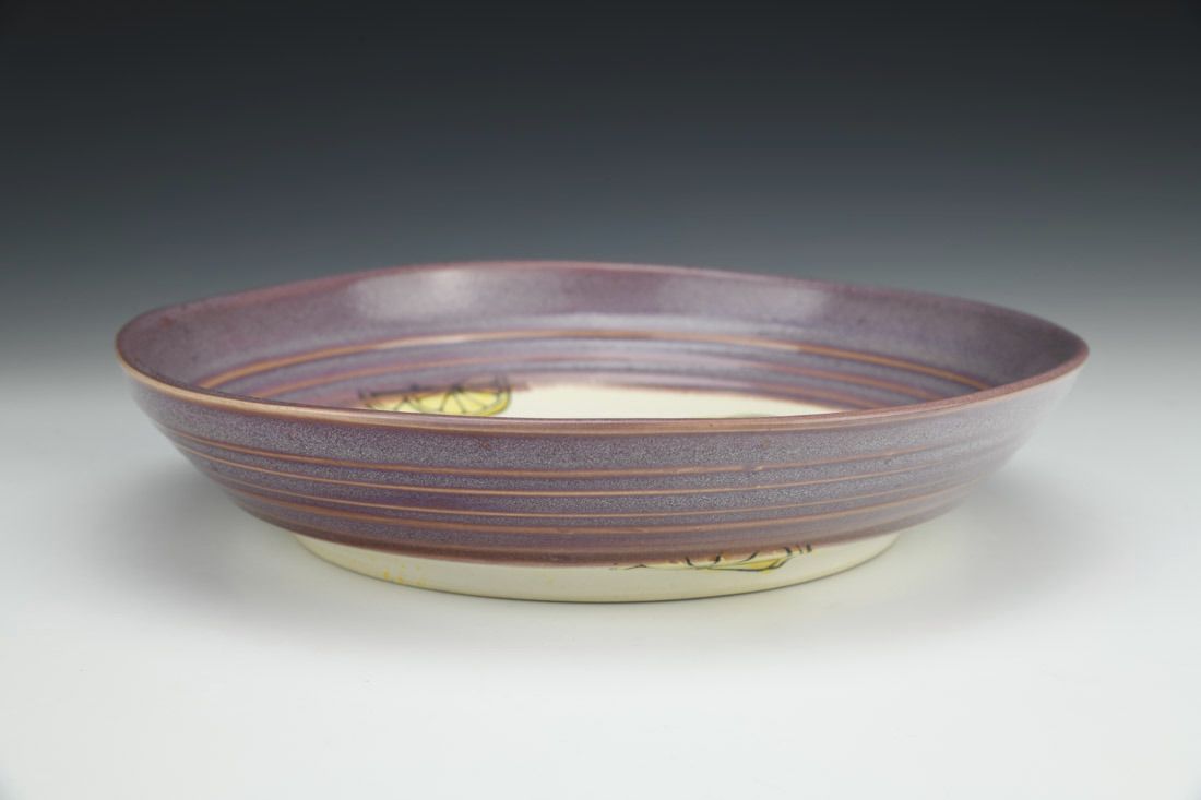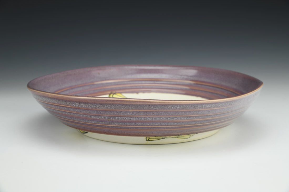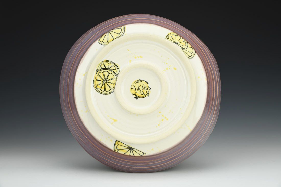 White stoneware, wheel thrown and hand built, screenprinted illustration, silkscreen underglaze, glaze, cone 5.5 electric fired, 9 x 9 x 1.5 inches.