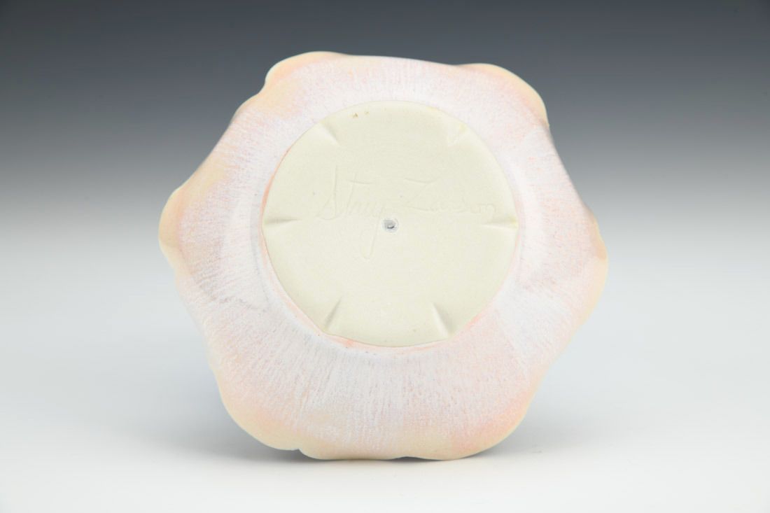 Porcelain with cubic zirconia, wheel thrown and altered, carved, cone 6 electric fired, 1.5 x 4.5 x 4.5 inches.