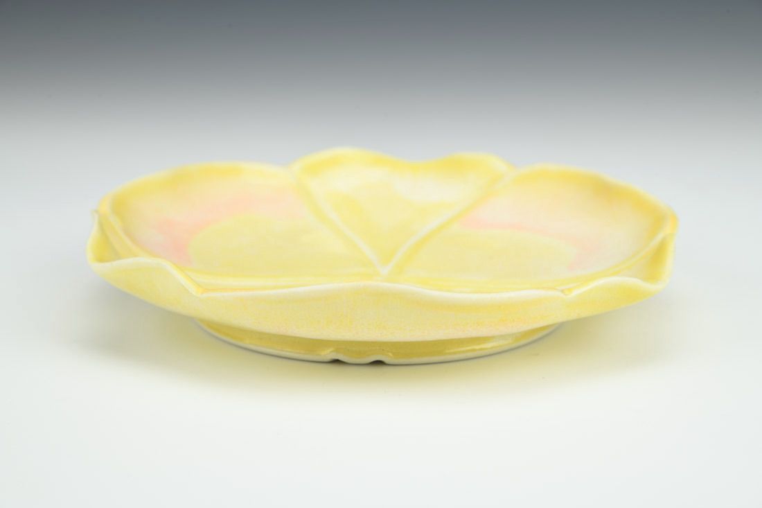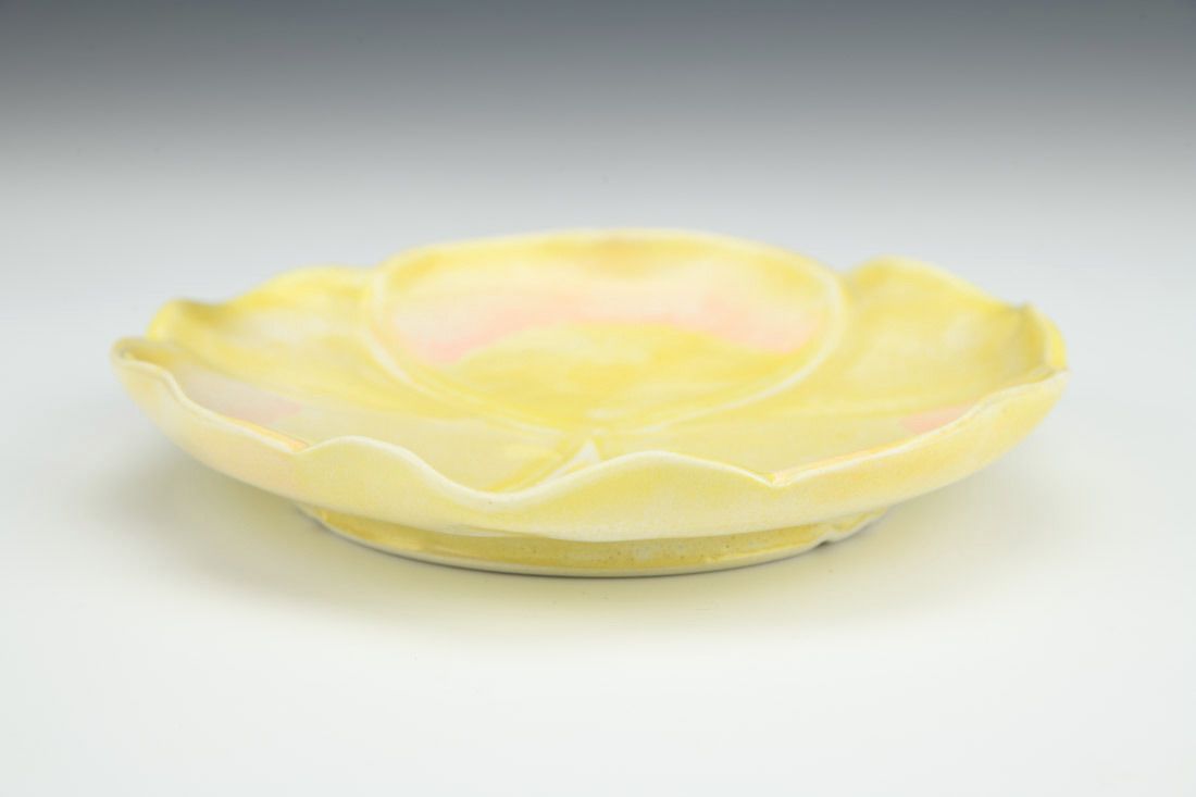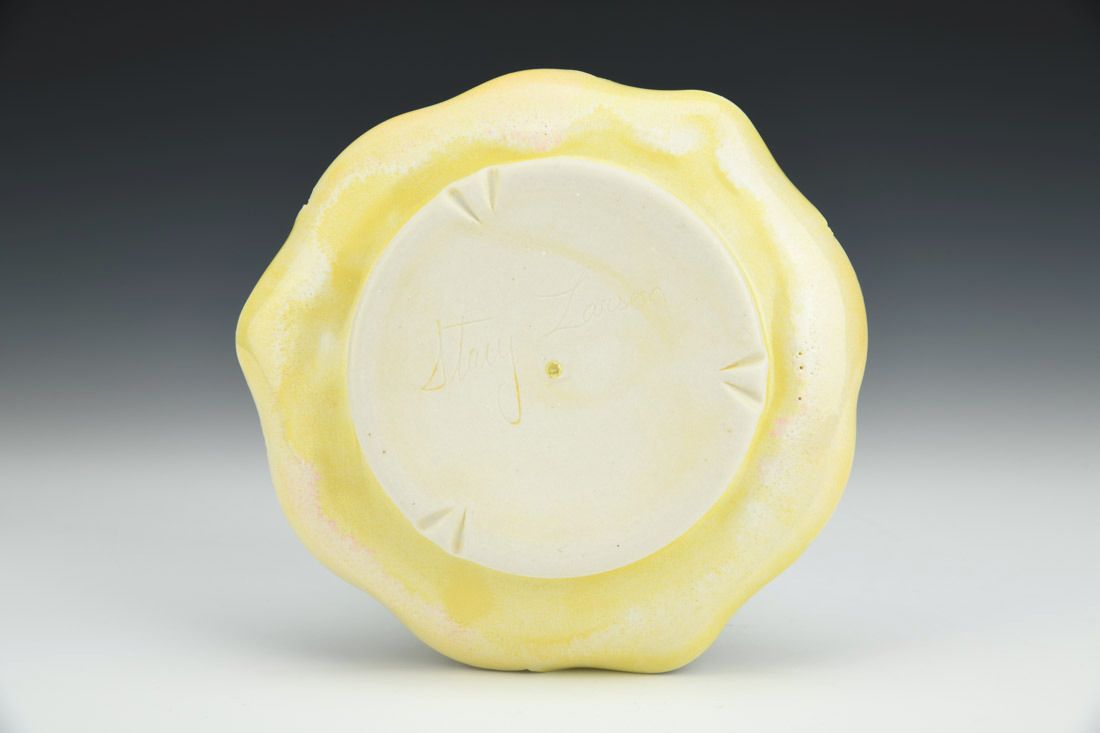Porcelain with cubic zirconia, wheel thrown and altered, carved, cone 6 electric fired, 1 x 6 x 6 inches.
