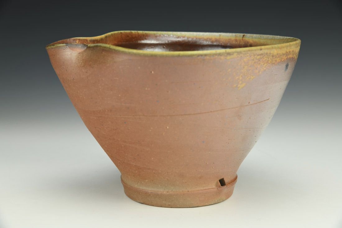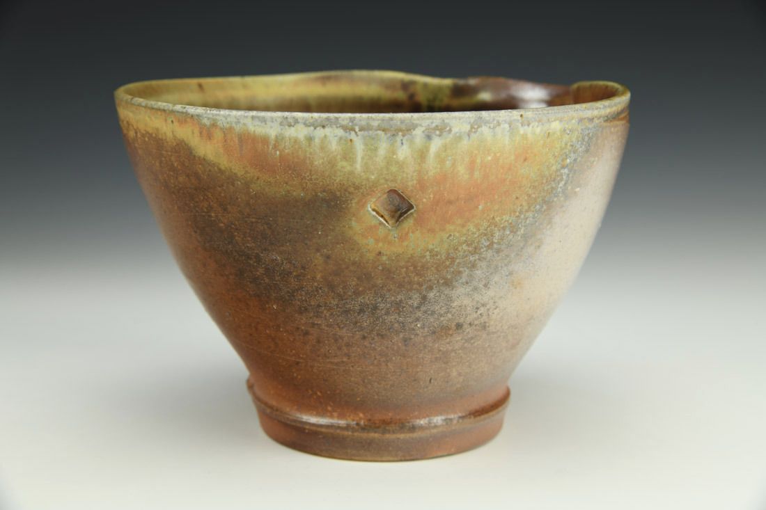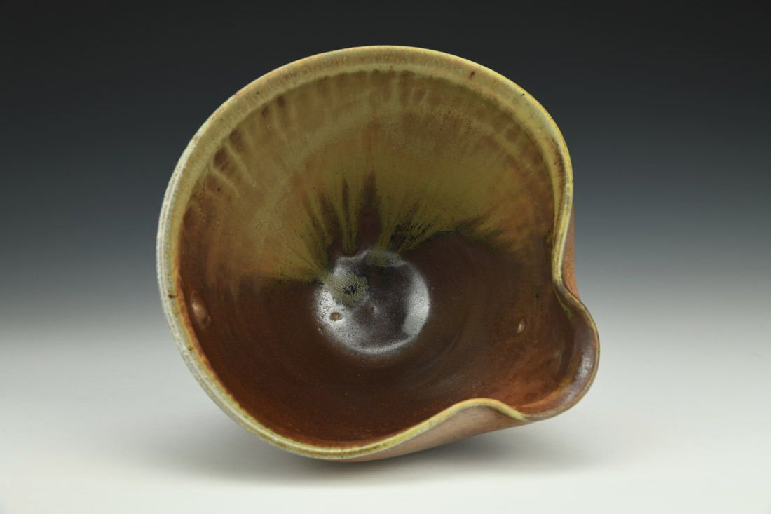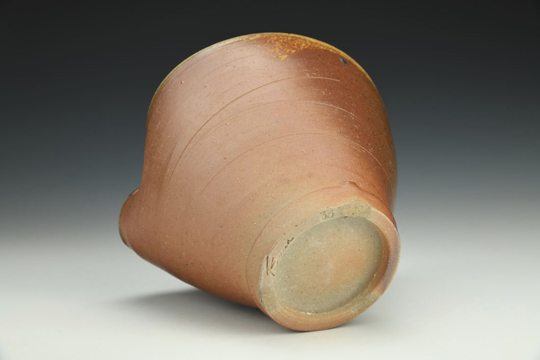 Stoneware, wheel thrown, glaze, cone 11 woodfired, 4.5 x 7 x 7 inches.