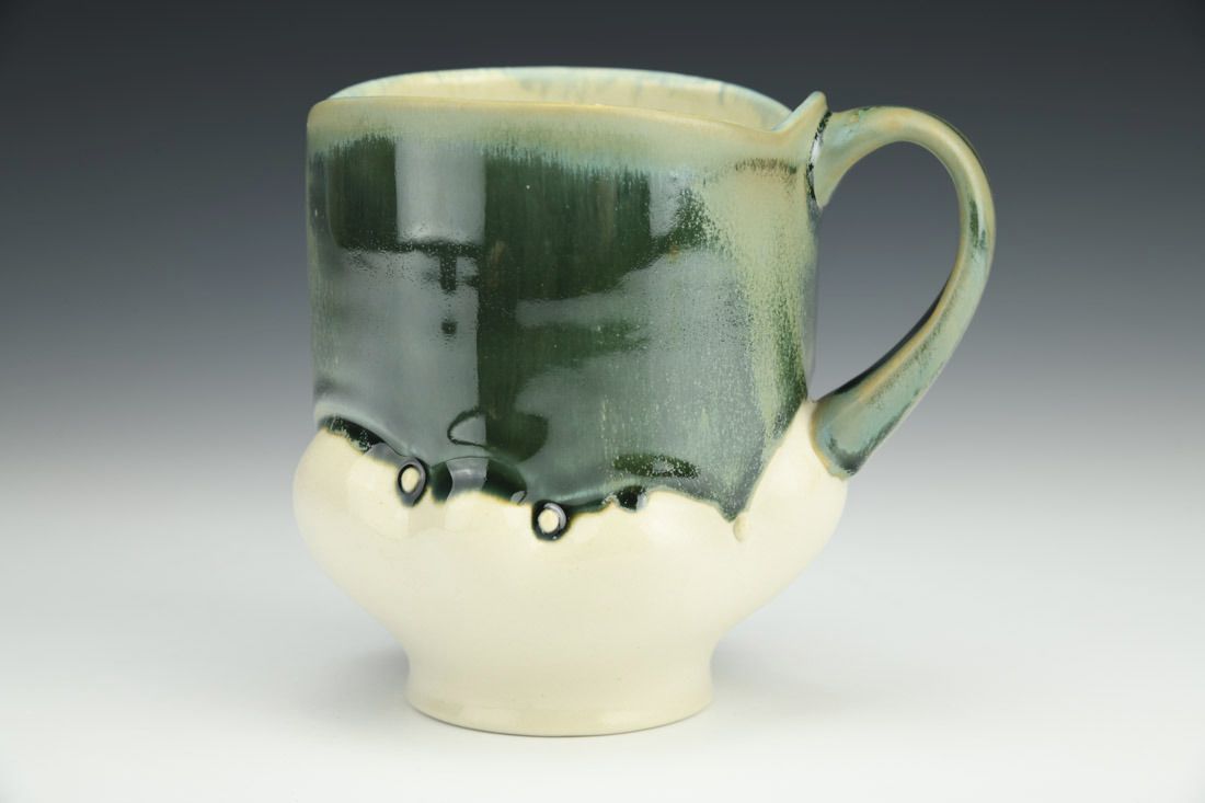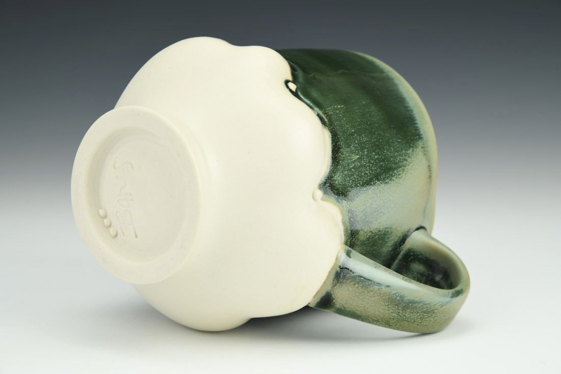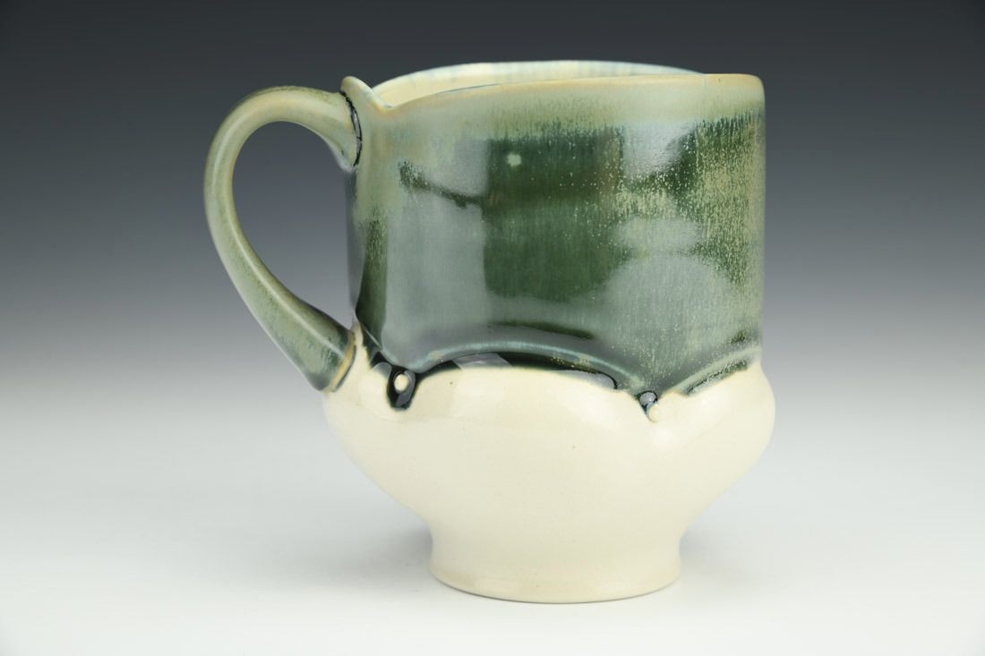 Porcelain, wheel thrown and altered with hand built hollow handle, cone 10 oxidation fired, 4.5 x 5 x 4 inches.
