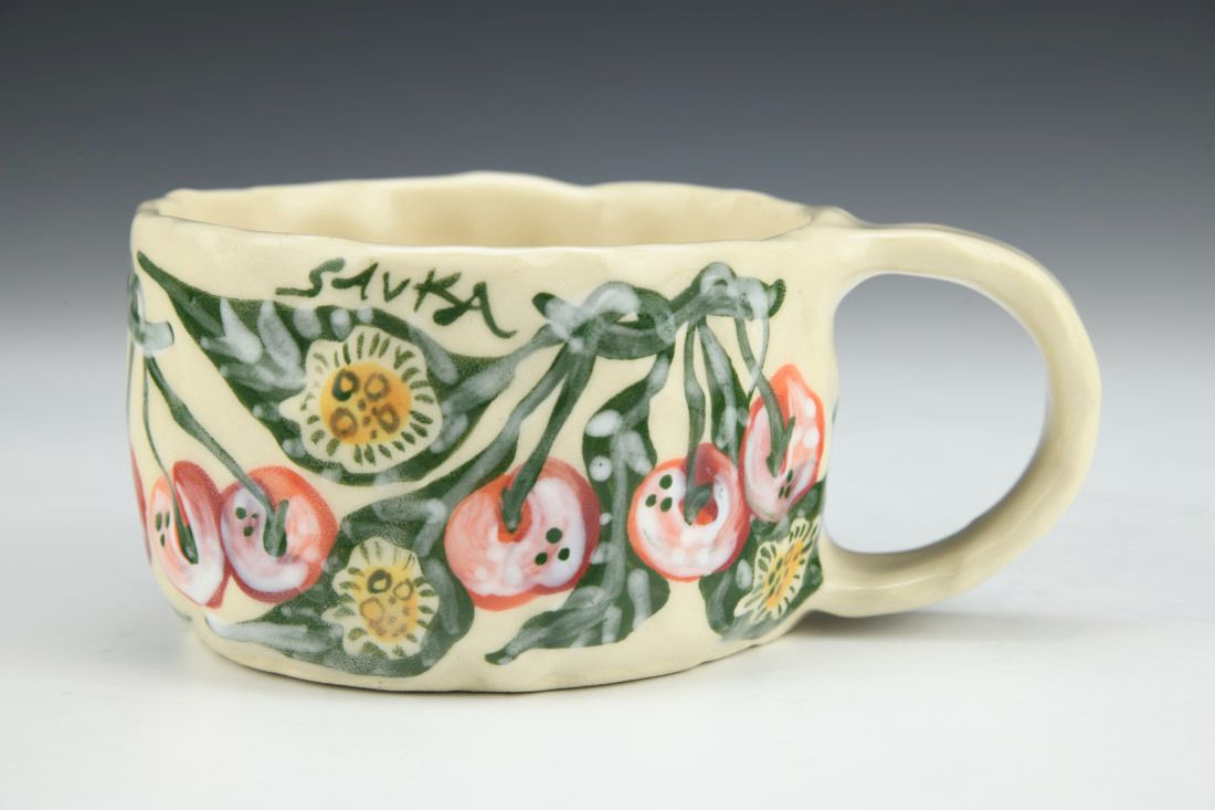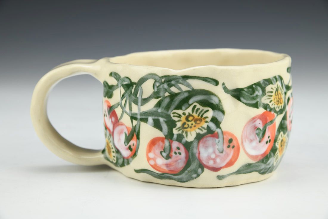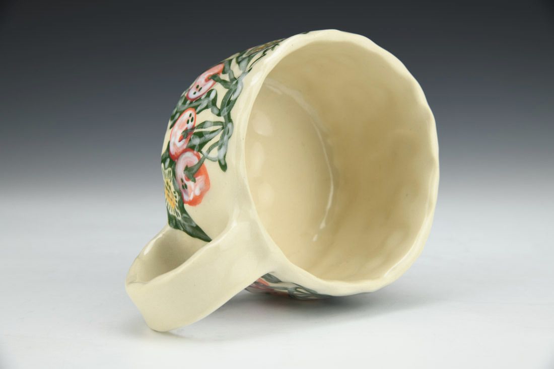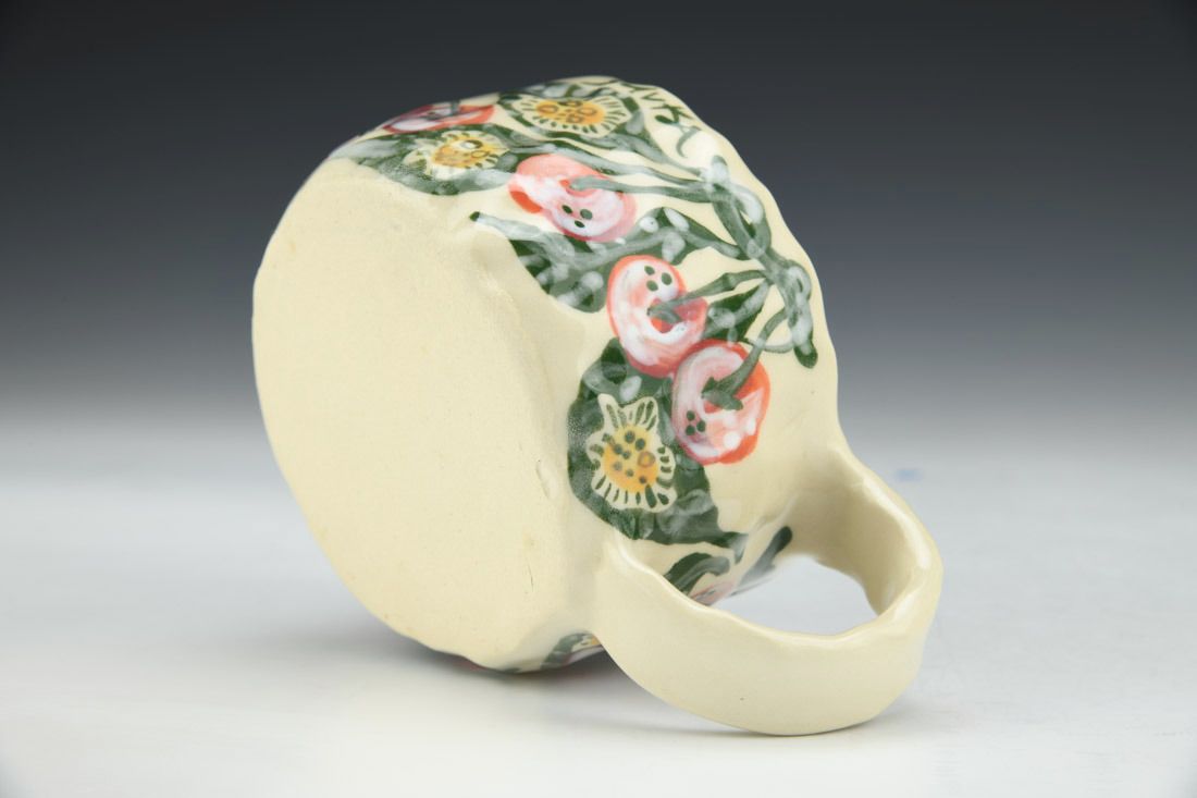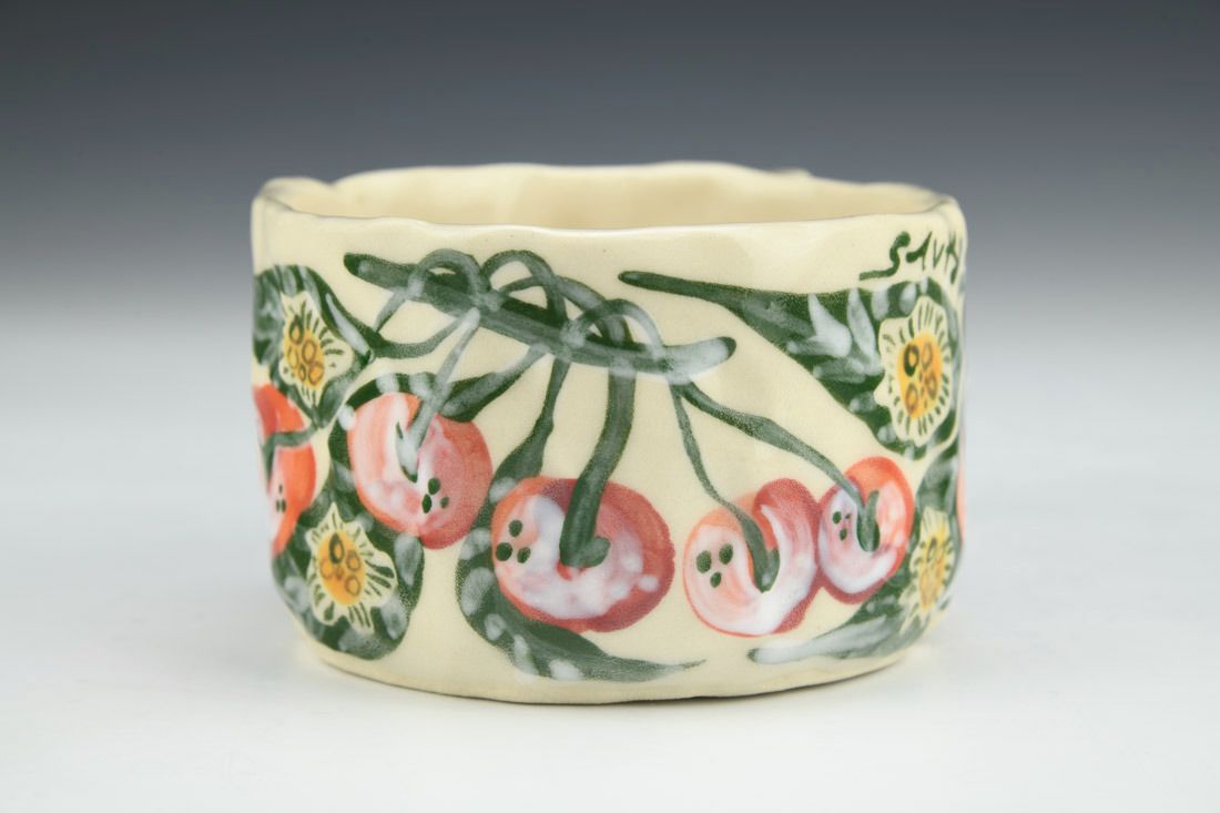 Stoneware, hand built with slabs and pinched, hand painted, cone 5 electric fired, 2.5 x 5.5 x 4 inches.