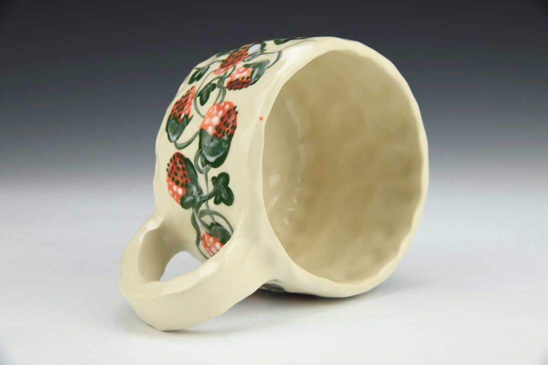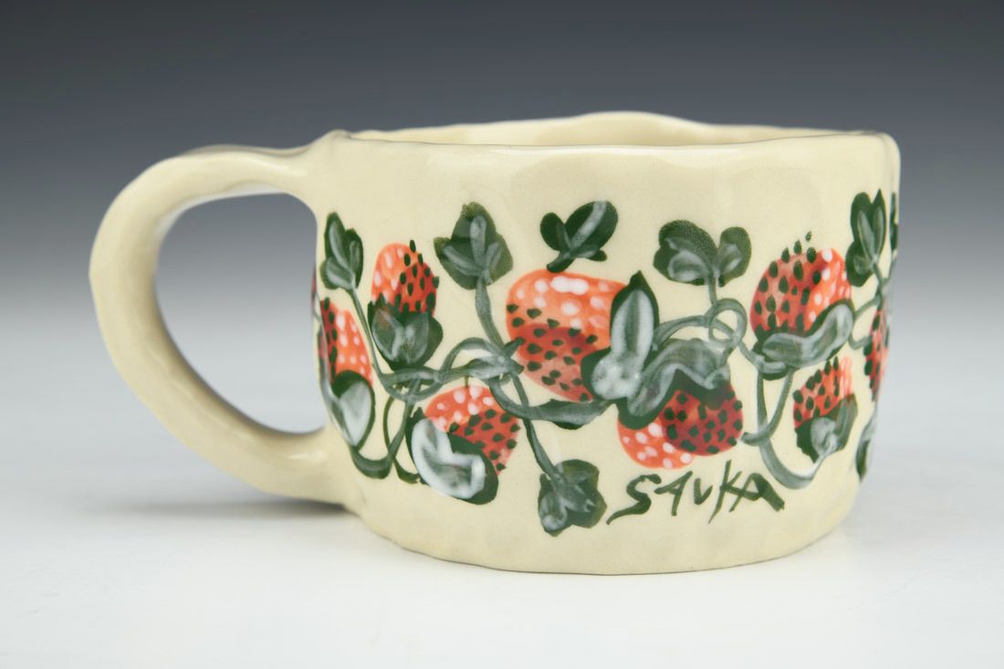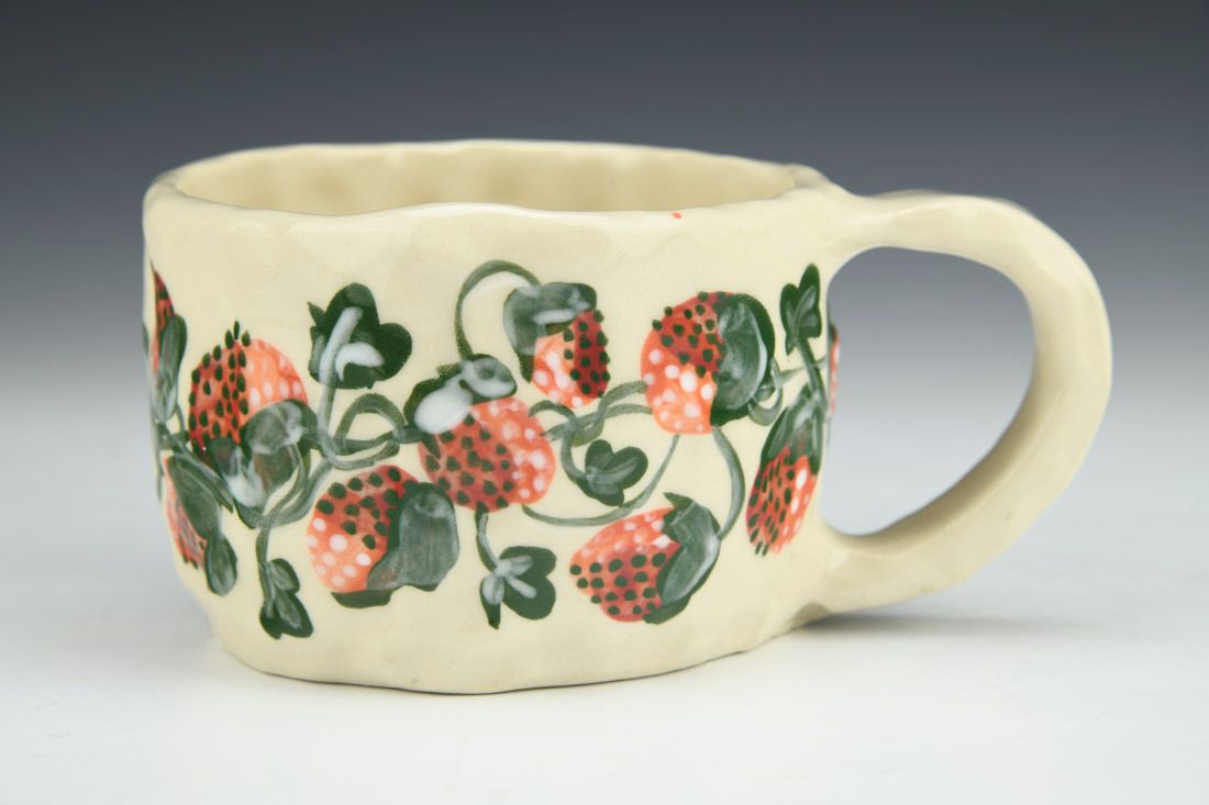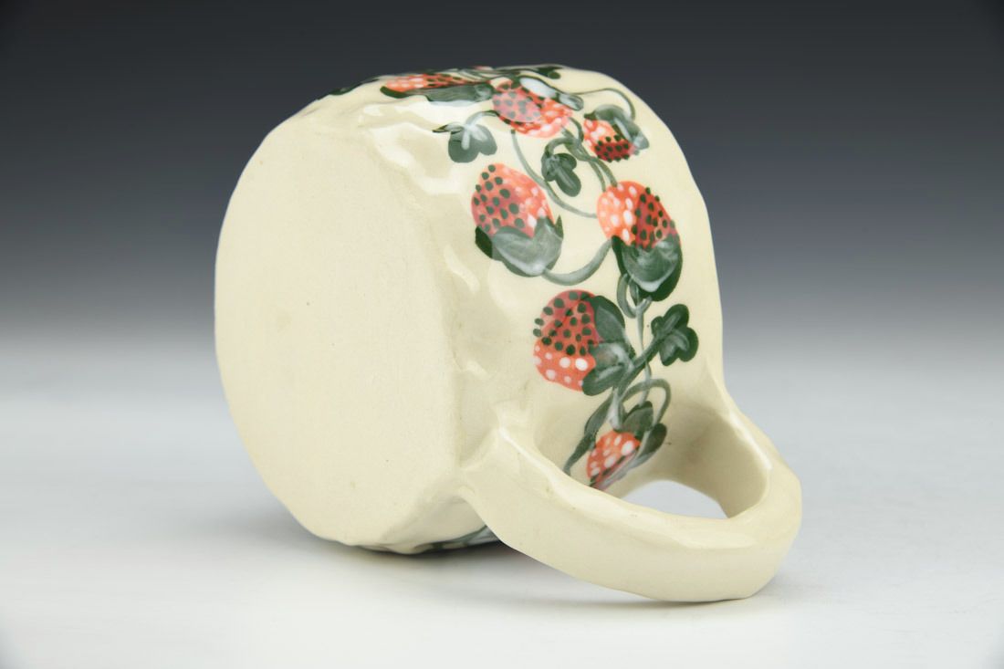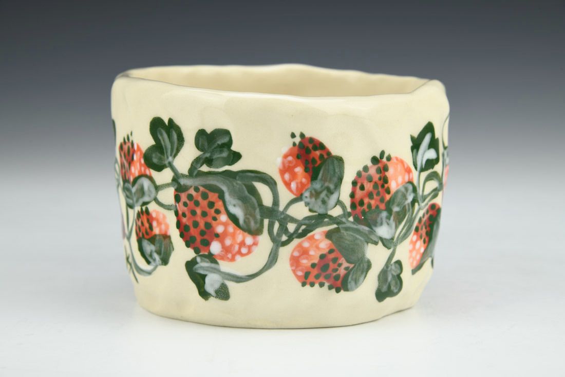 Stoneware, hand built with slabs and pinched, hand painted, cone 5 electric fired, 2.5 x 5.75 x 4 inches.