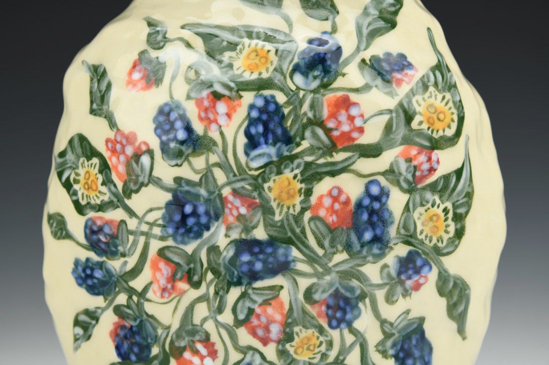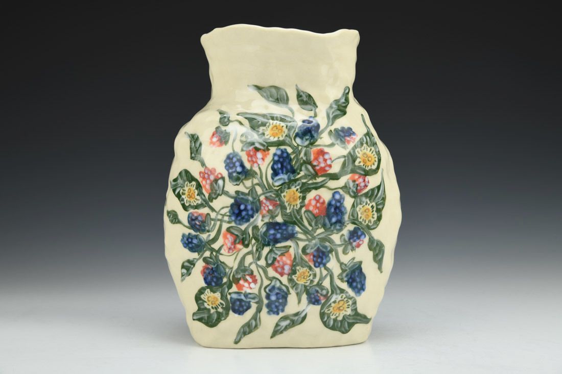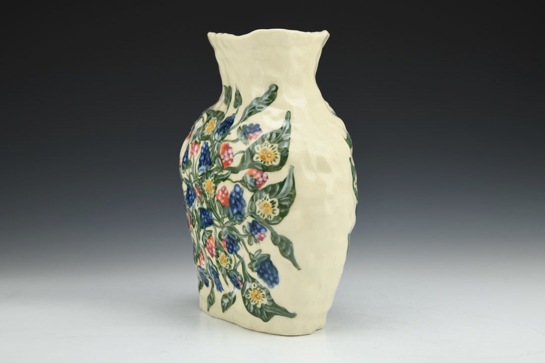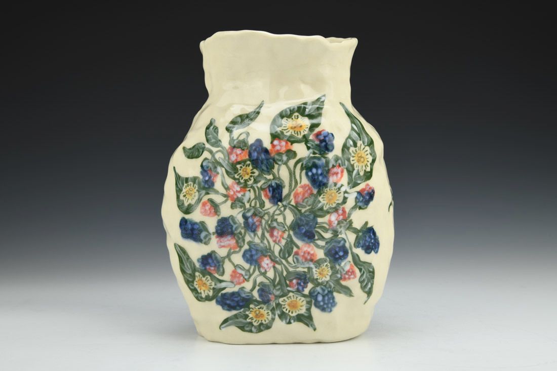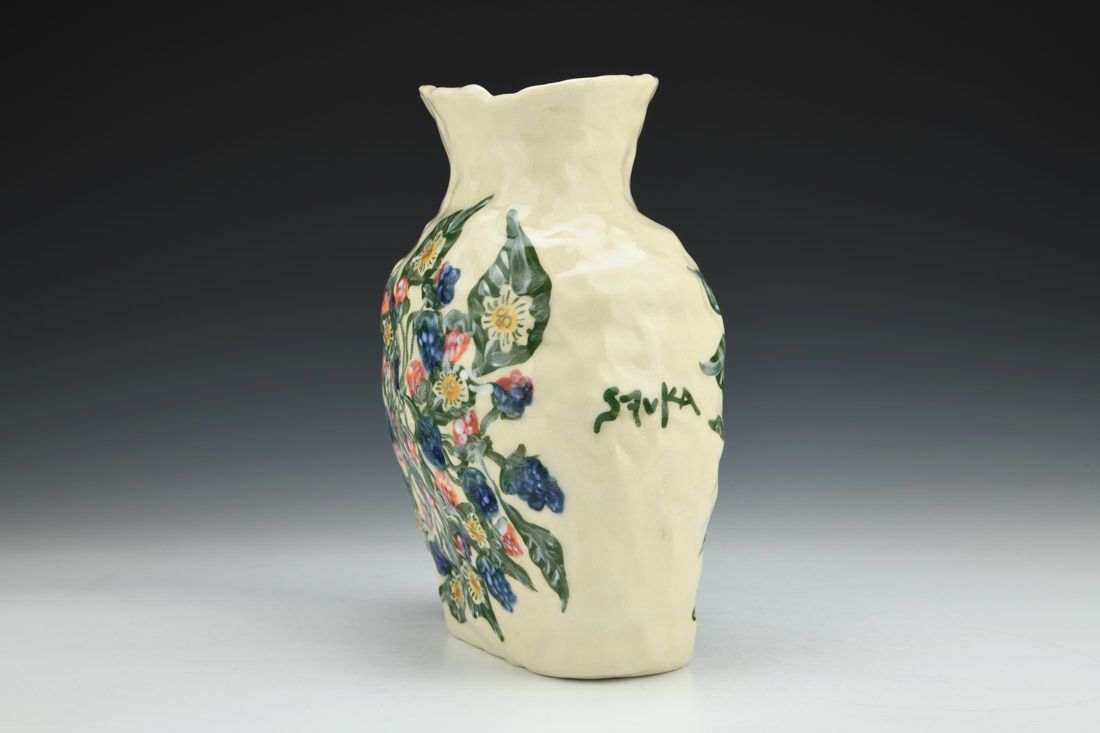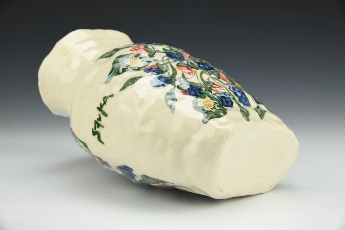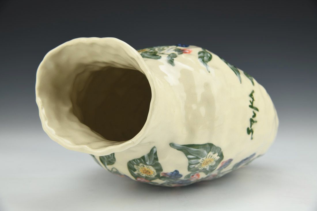 Stoneware, hand built with coils and pinched, hand painted, cone 5 electric fired, 8.75 x 6.5 x 4.5 inches.
