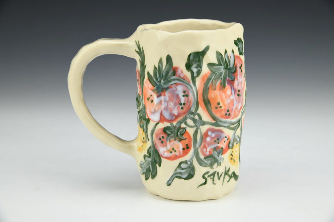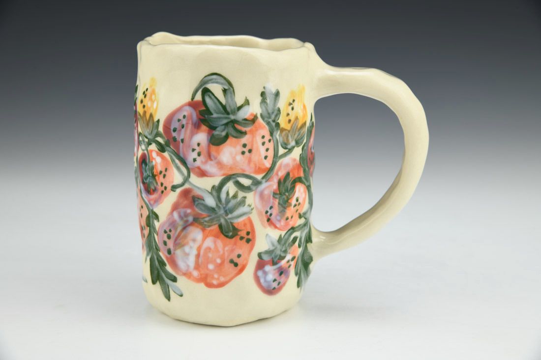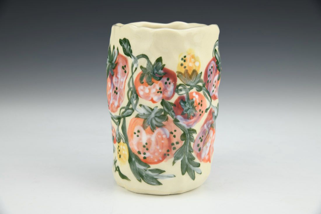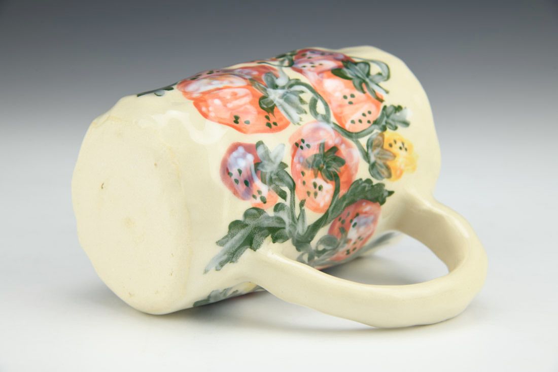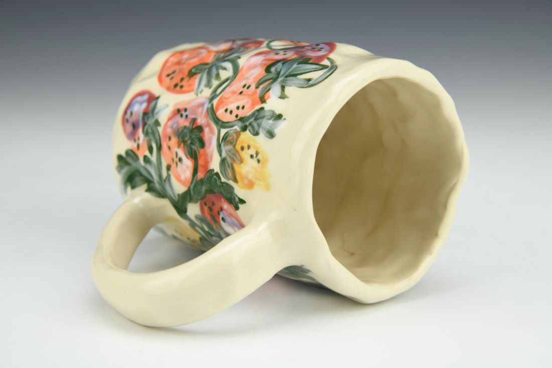 Stoneware, hand built with coils and pinched, hand painted, cone 5 electric fired, 4.5 x 4.75 x 3 inches.