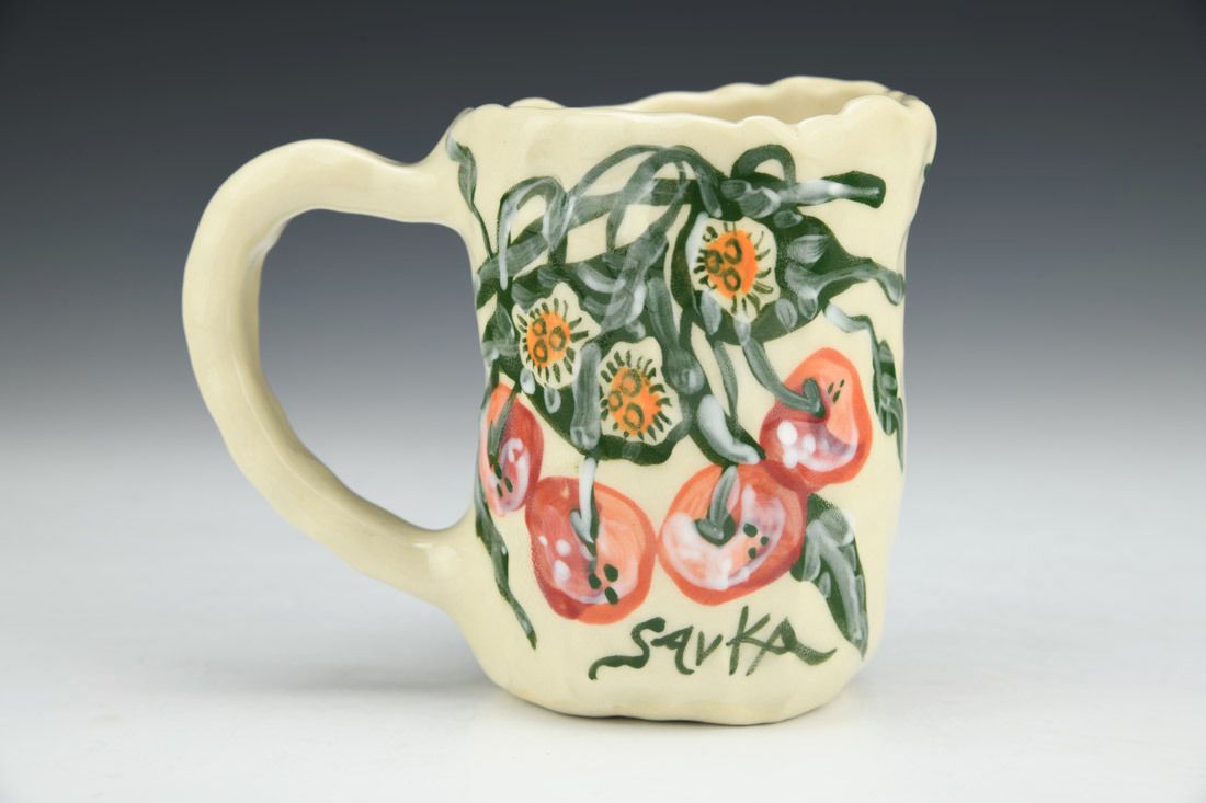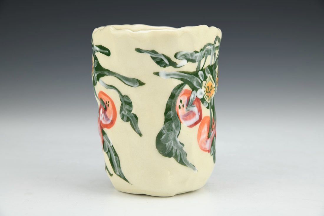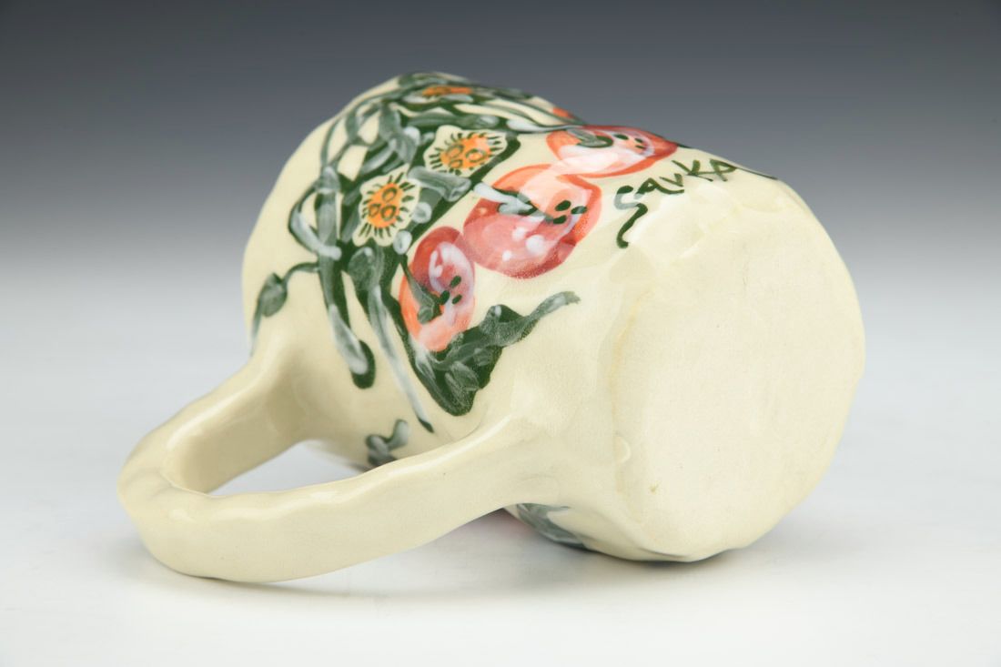 Stoneware, hand built with coils and pinched, hand painted, cone 5 electric fired, 4 x 4.75 x 3 inches.