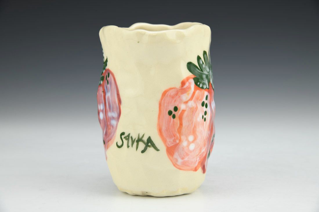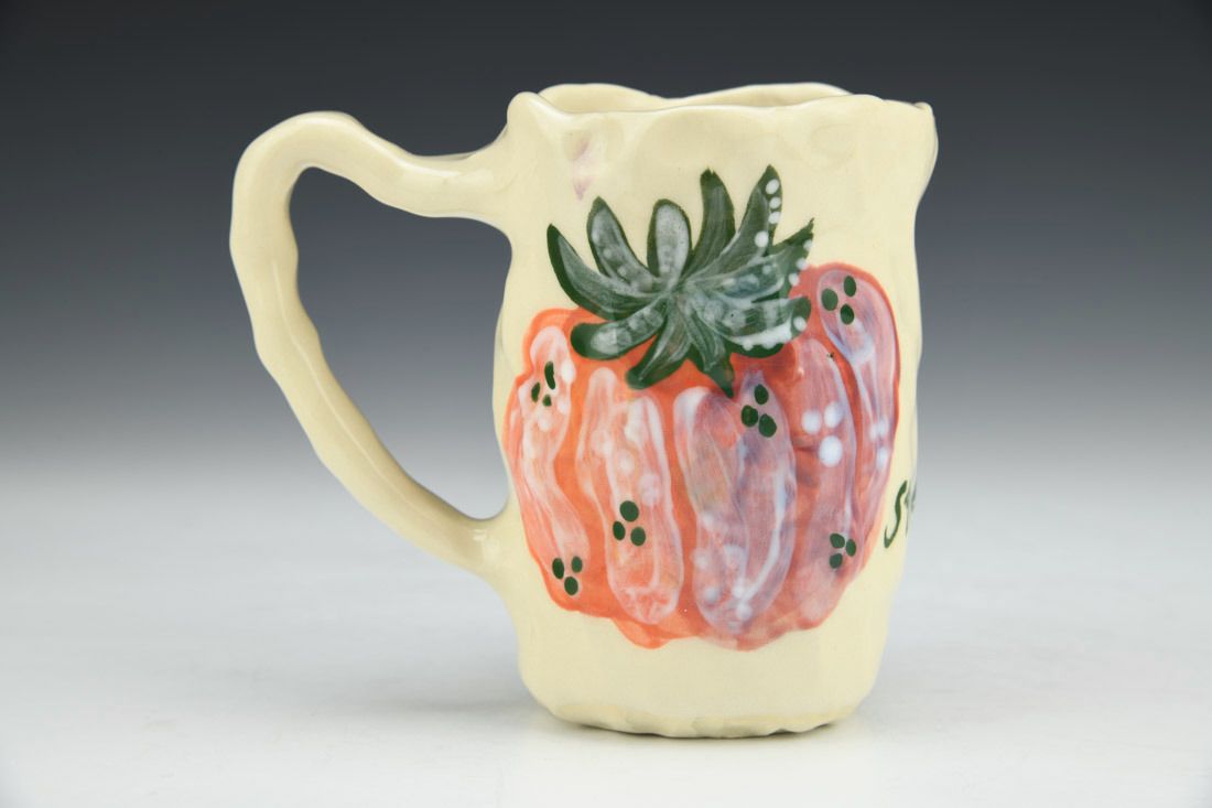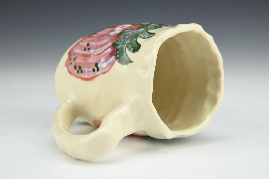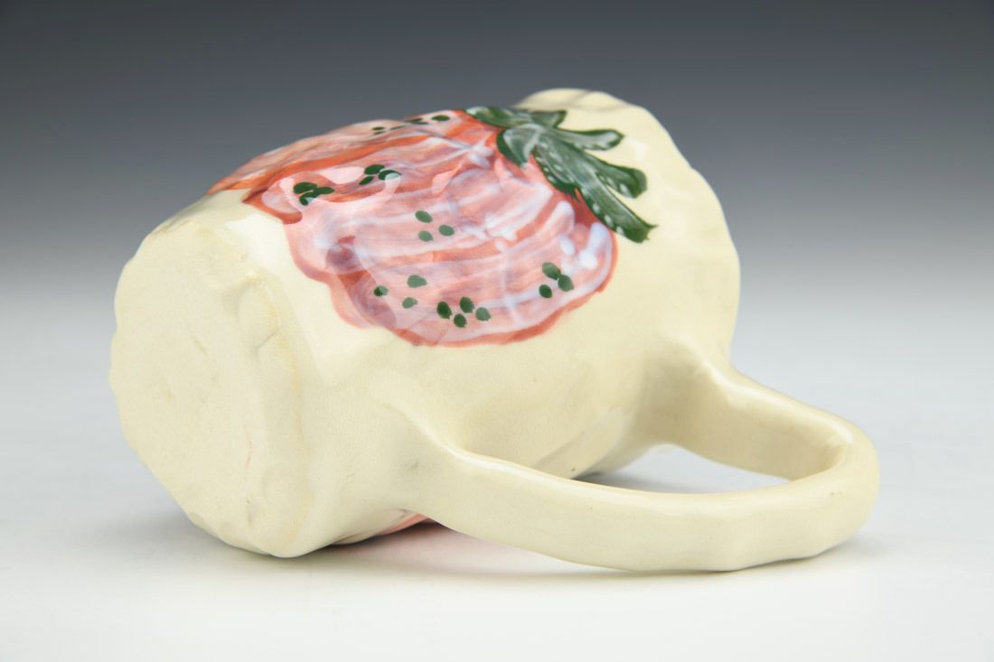 Stoneware, hand built with coils and pinched, hand painted, cone 5 electric fired, 4.25 x 4.5 x 3 inches.
