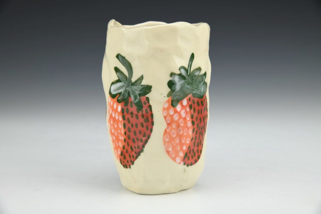 Stoneware, hand built with coils and pinched, hand painted, cone 5 electric fired, 4.5 x 4.5 x 3 inches.