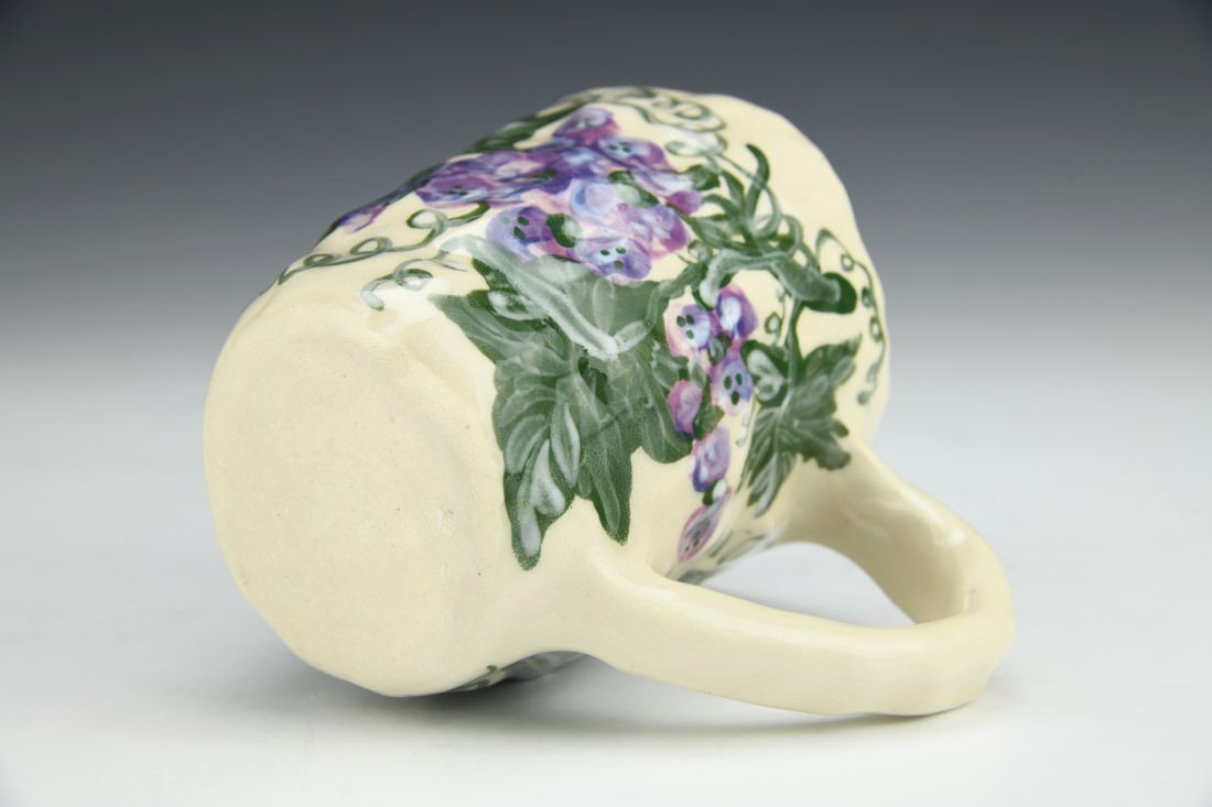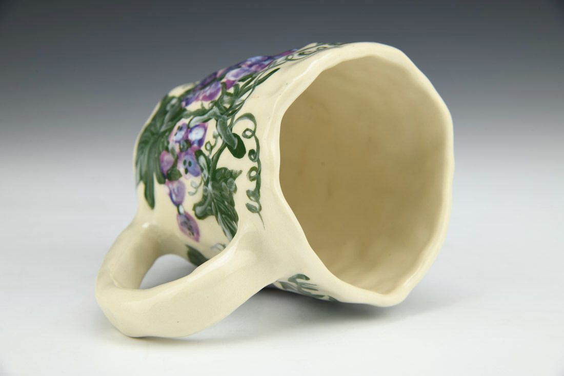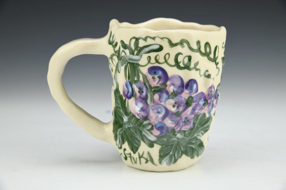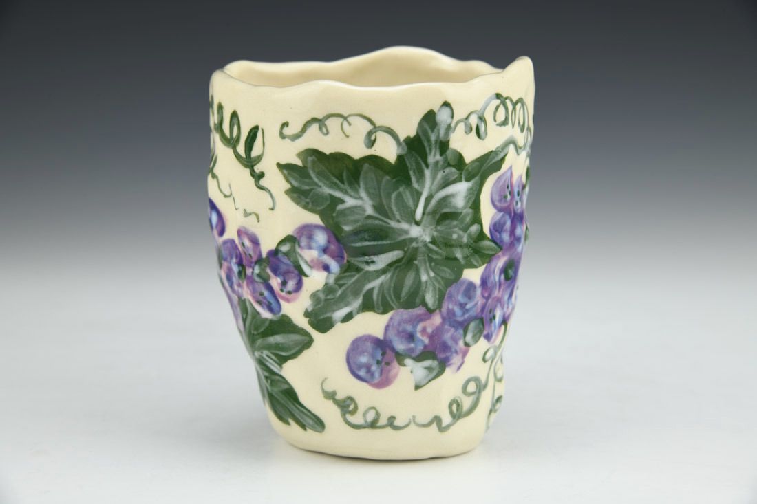 Stoneware, hand built with coils and pinched, hand painted, cone 5 electric fired, 4 x 4.75 x 3.25 inches.