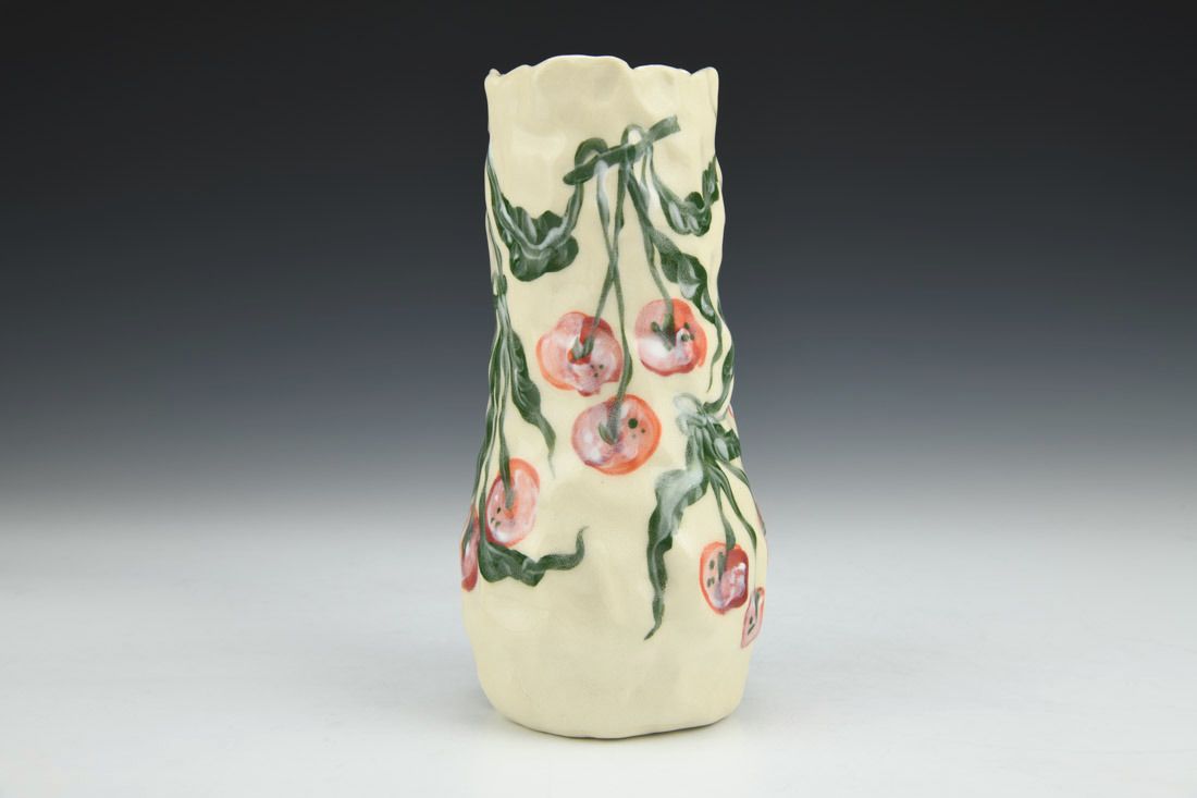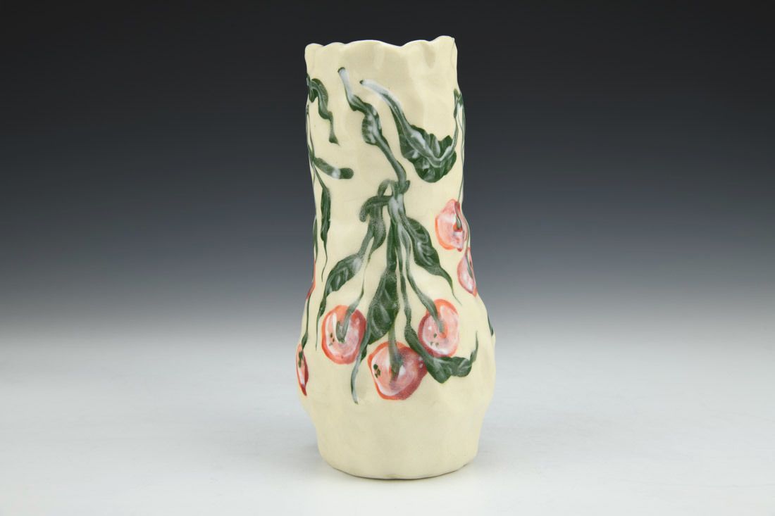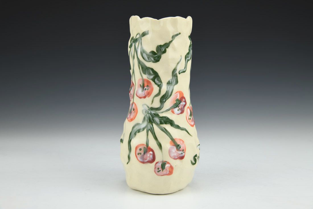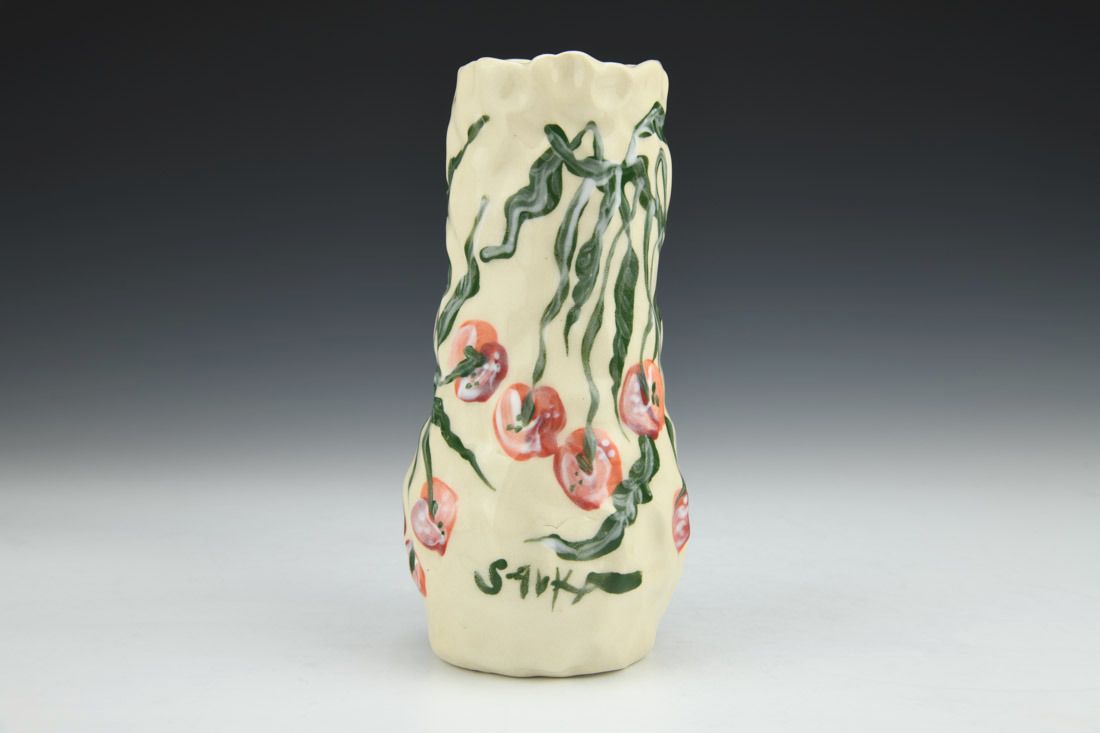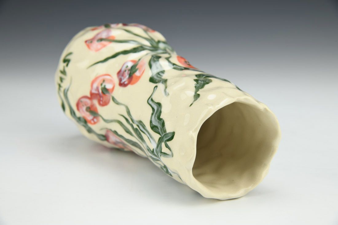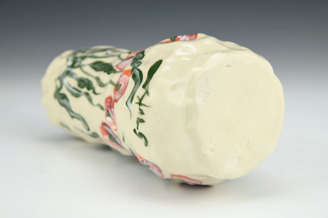 Stoneware, hand built with coils and pinched, hand painted, cone 5 electric fired, 6.75 x 3 x 3 inches.