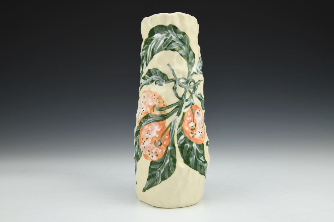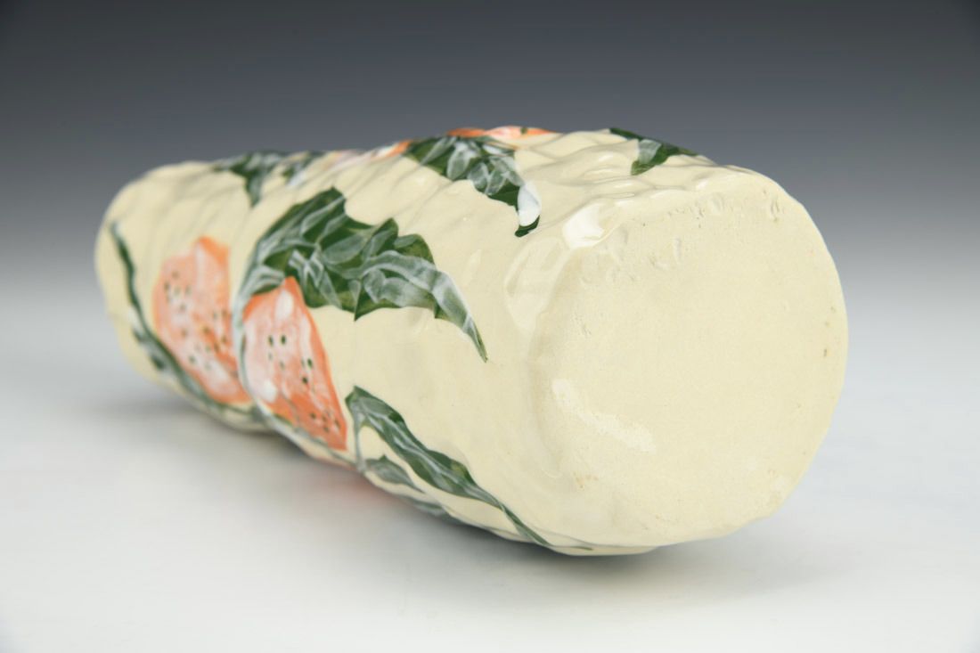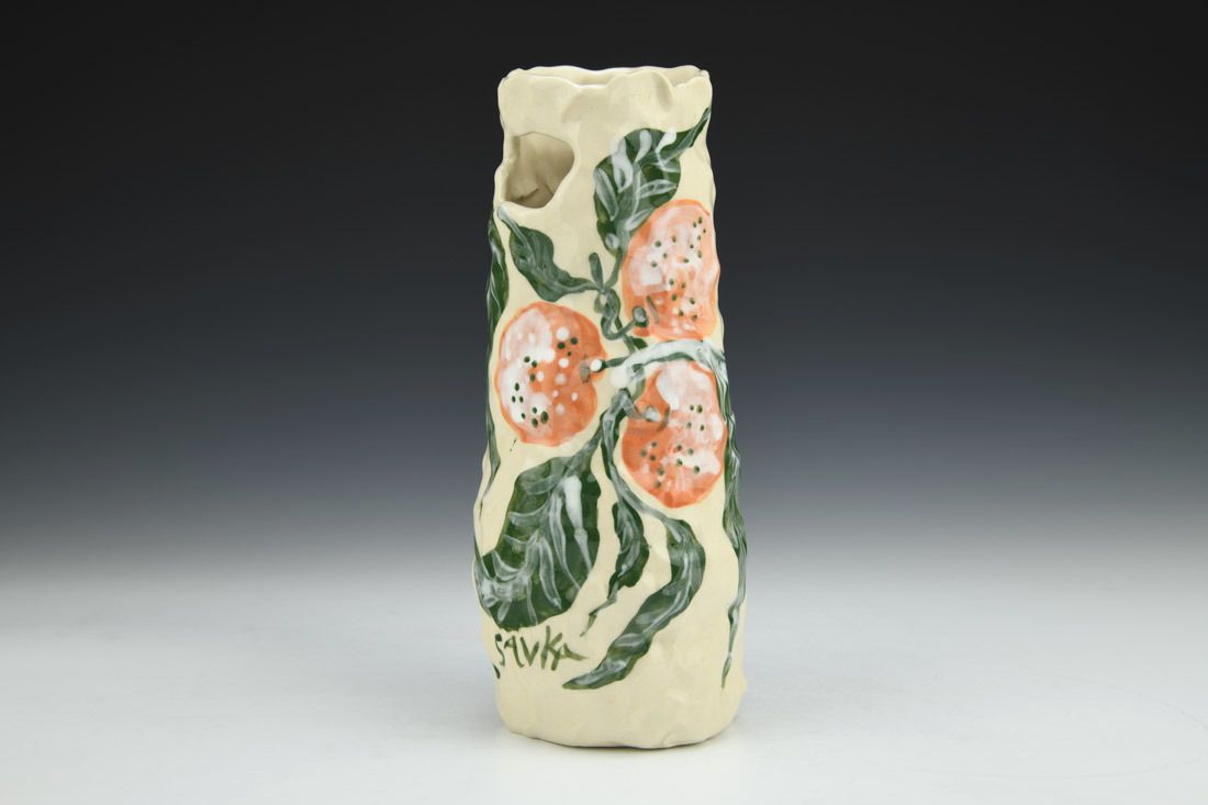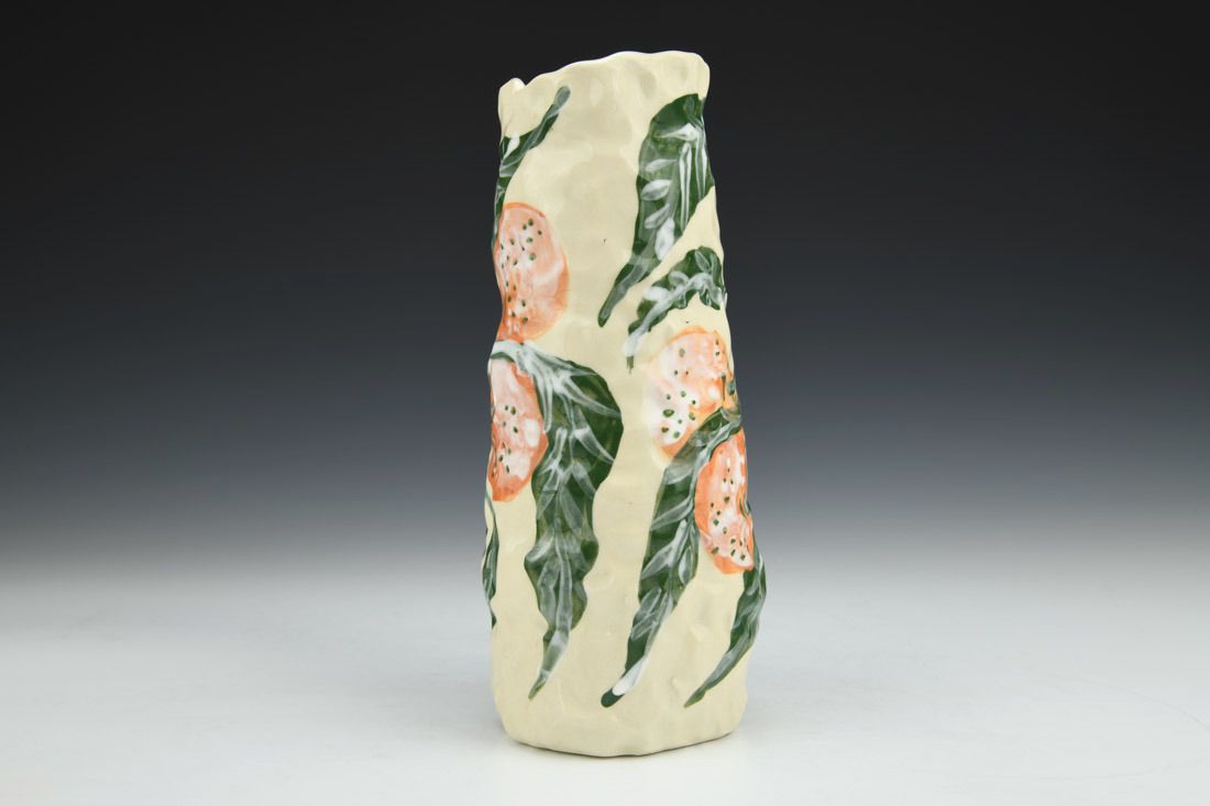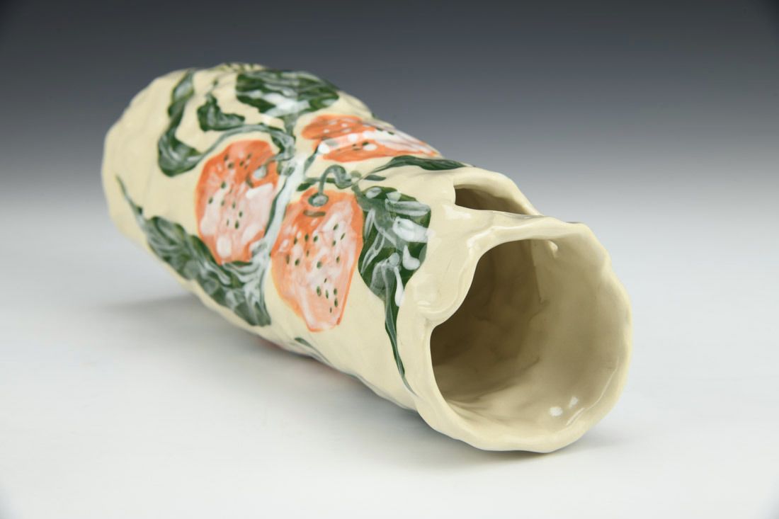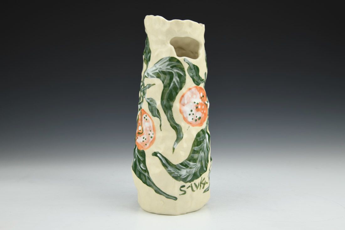 Stoneware, hand built with coils and pinched, hand painted, cone 5 electric fired, 8.5 x 3.5 x 3.5 inches.