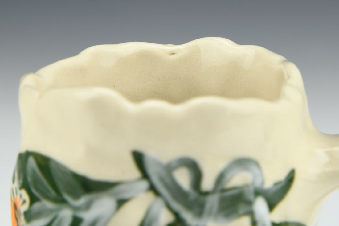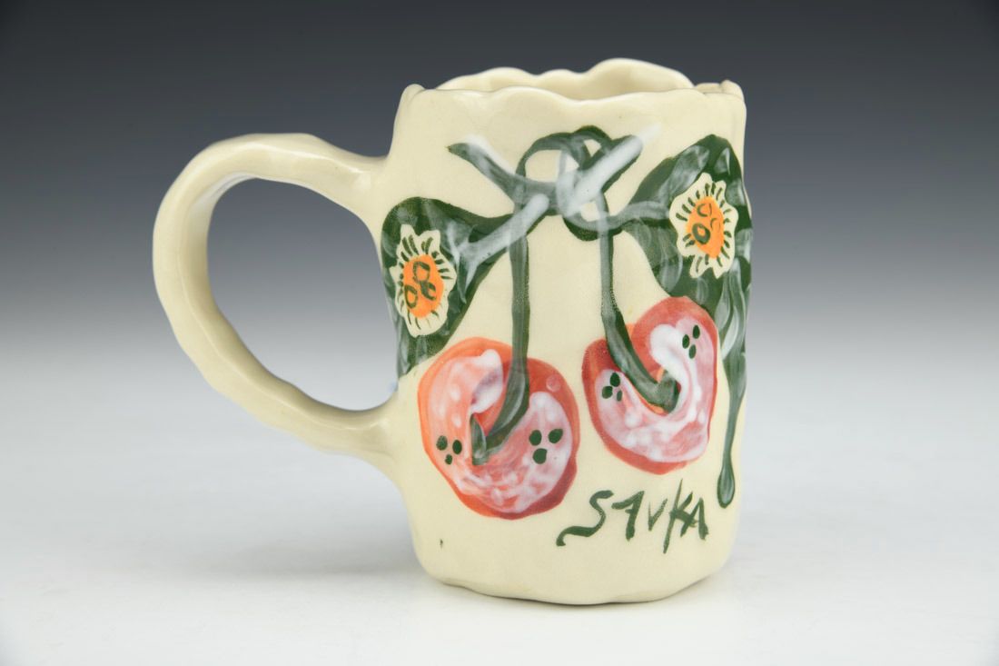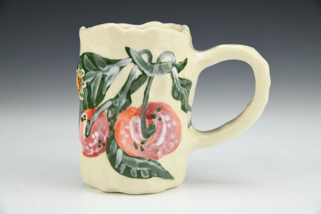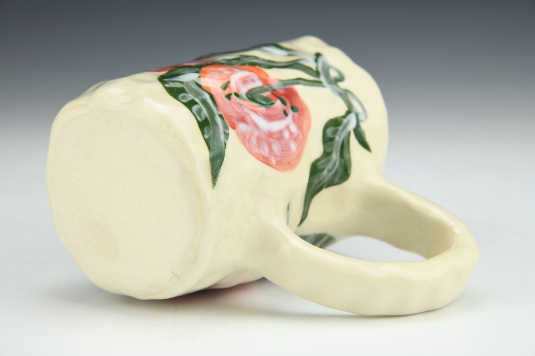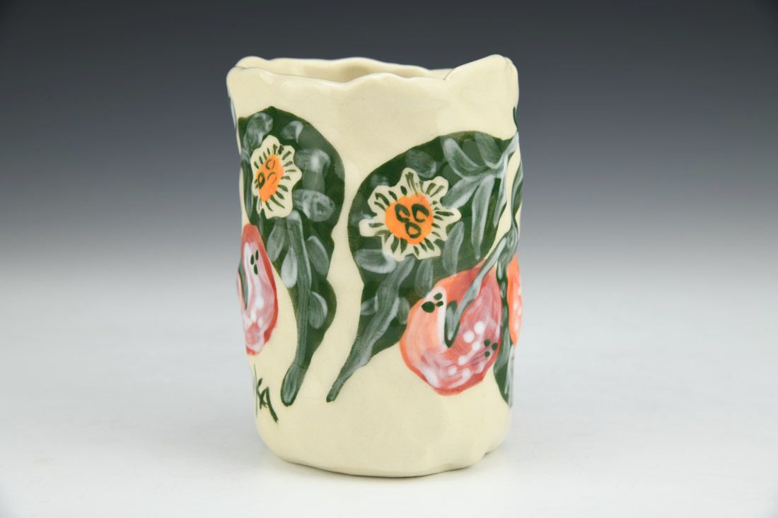 Stoneware, hand built with coils and pinched, hand painted, cone 5 electric fired, 4.75 x 4.5 x 3 inches.