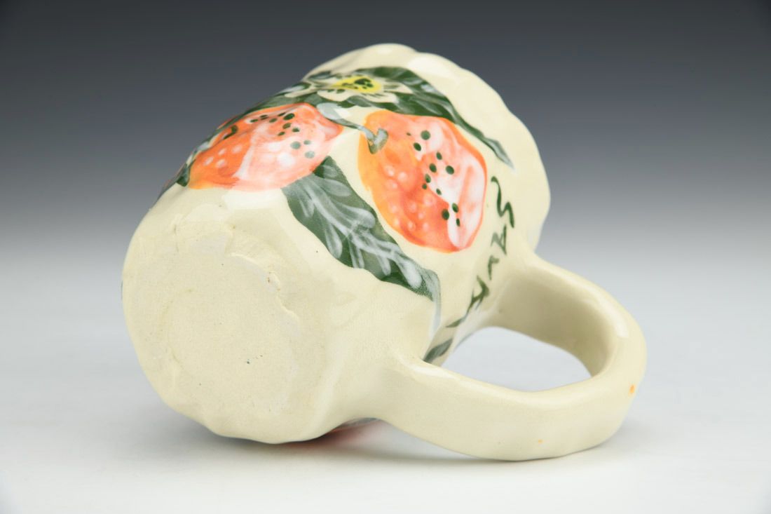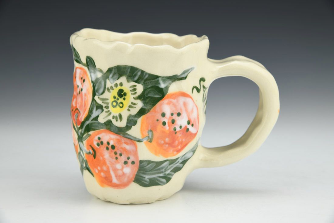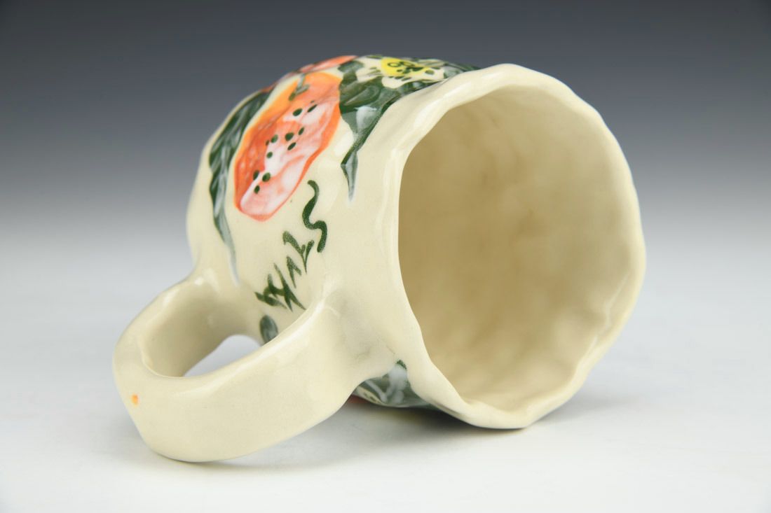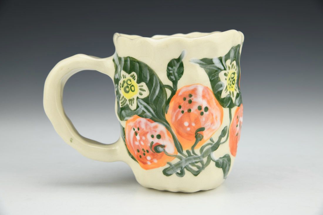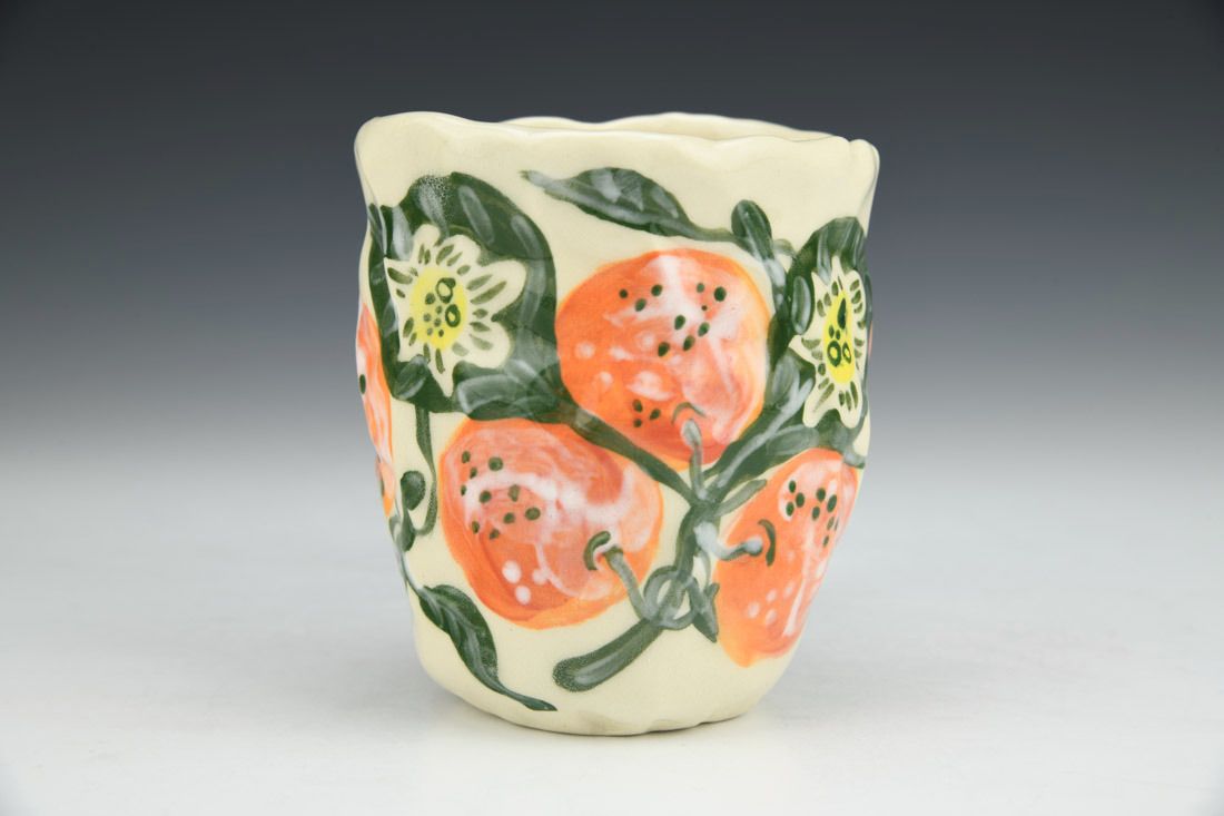 Stoneware, hand built with coils and pinched, hand painted, cone 5 electric fired, 4 x 5 x 3.5 inches.