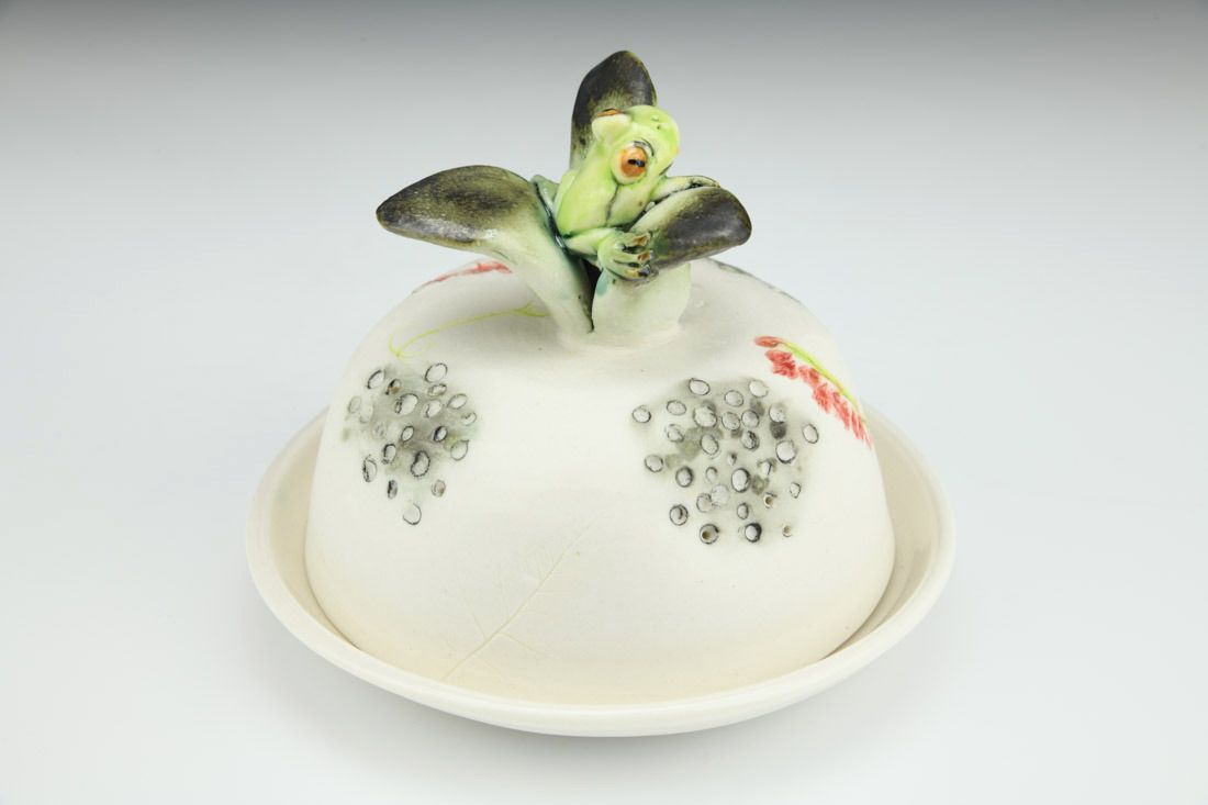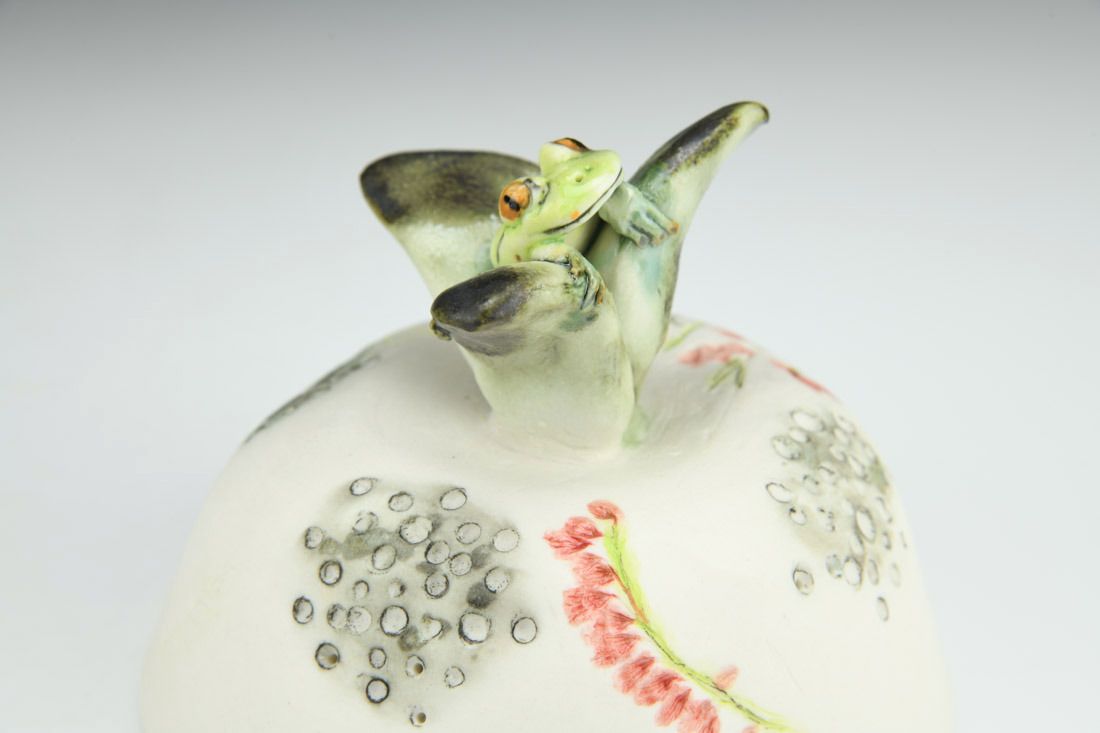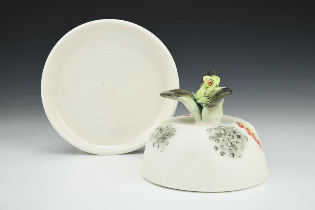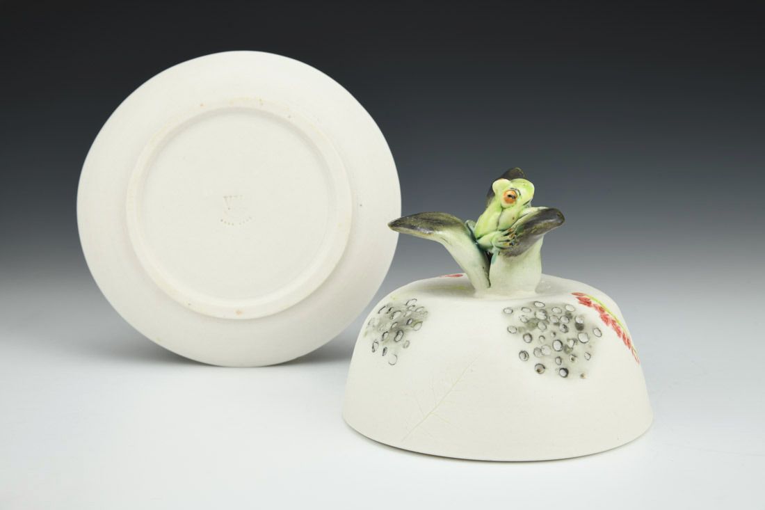Porcelain, wheel thrown, hand built and sculpted, underglaze, glaze, cone 6 fired, 4.5 x 6 x 6 inches.