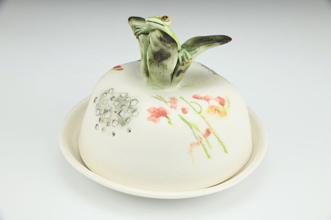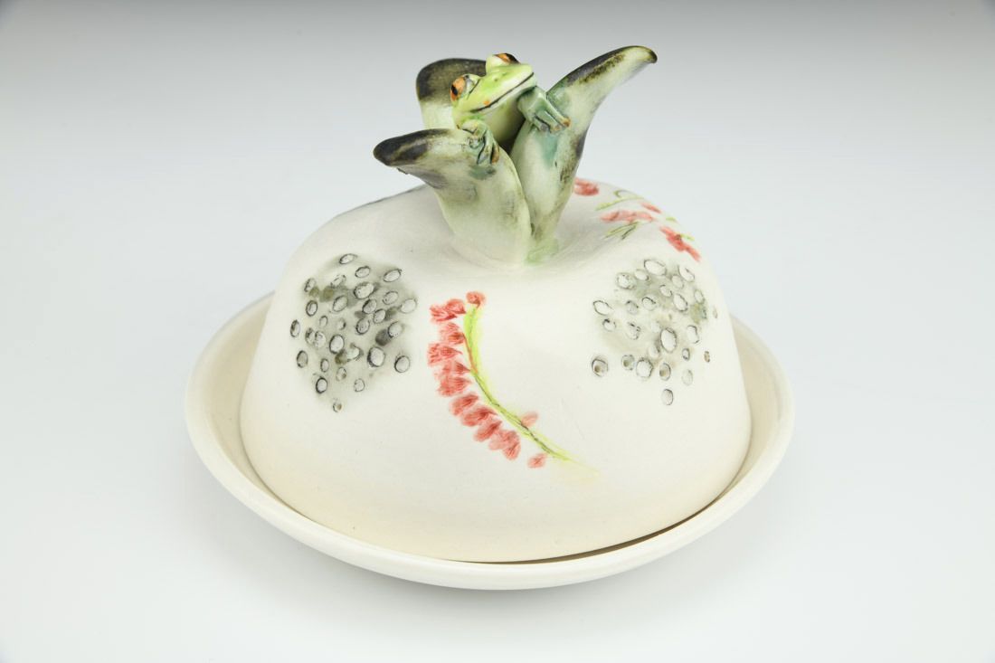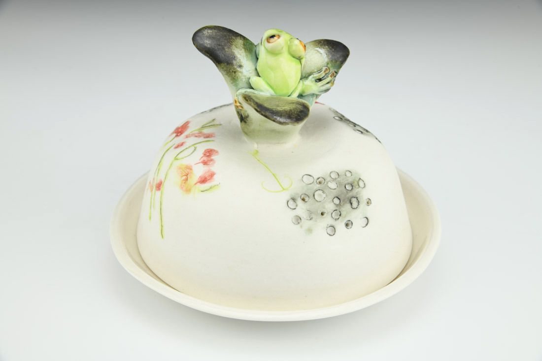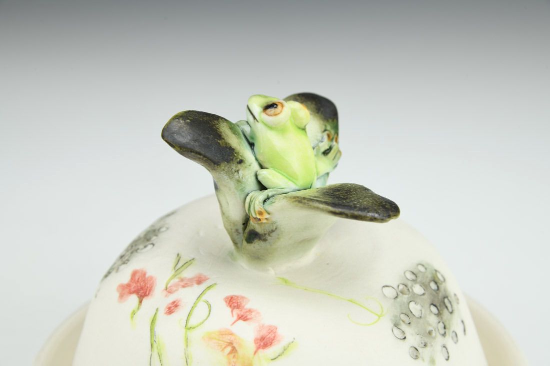Porcelain, wheel thrown, hand built and sculpted, underglaze, glaze, cone 6 fired, 4.5 x 6 x 6 inches.