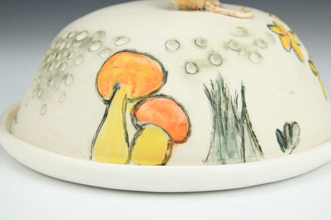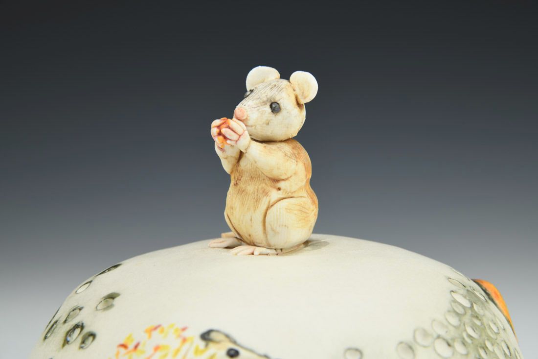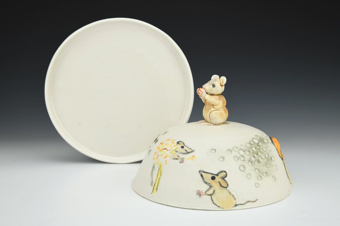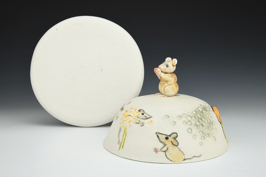 Porcelain, wheel thrown, hand built and sculpted, underglaze, glaze, cone 6 fired, 5 x 7.75 x 7.75 inches.