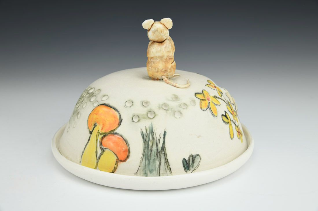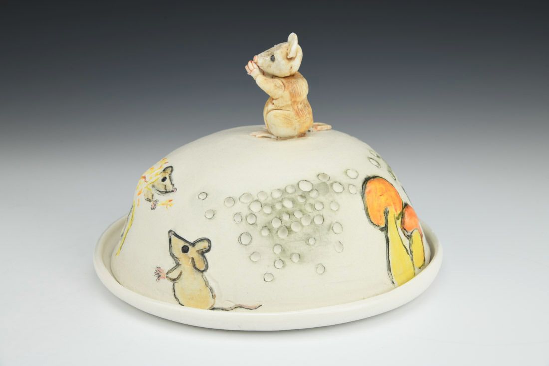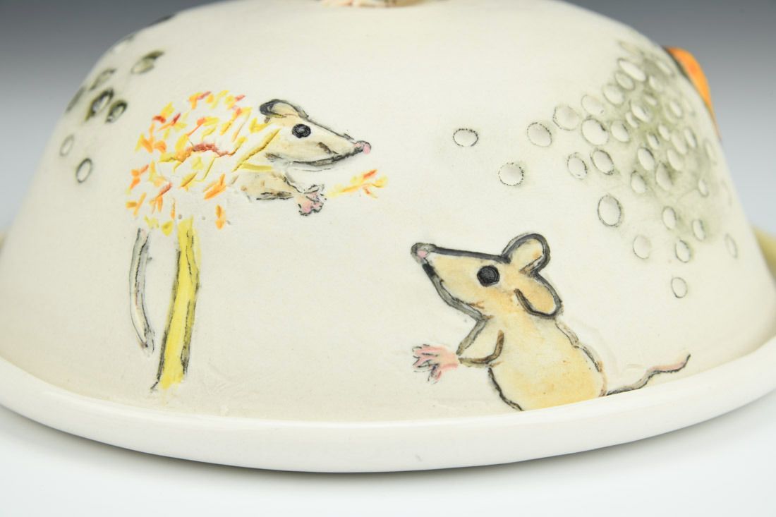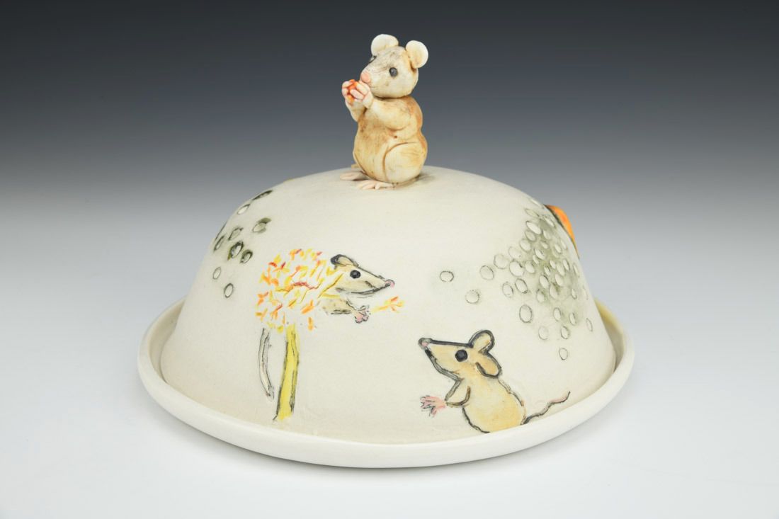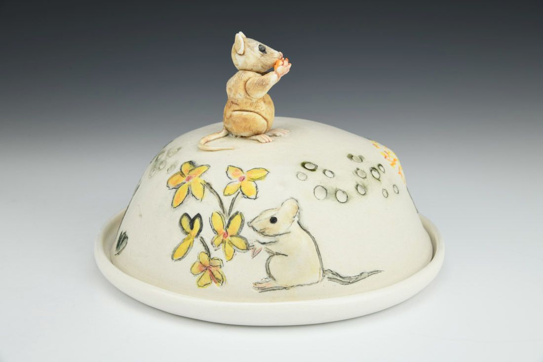 Porcelain, wheel thrown, hand built and sculpted, underglaze, glaze, cone 6 fired, 5 x 7.75 x 7.75 inches.